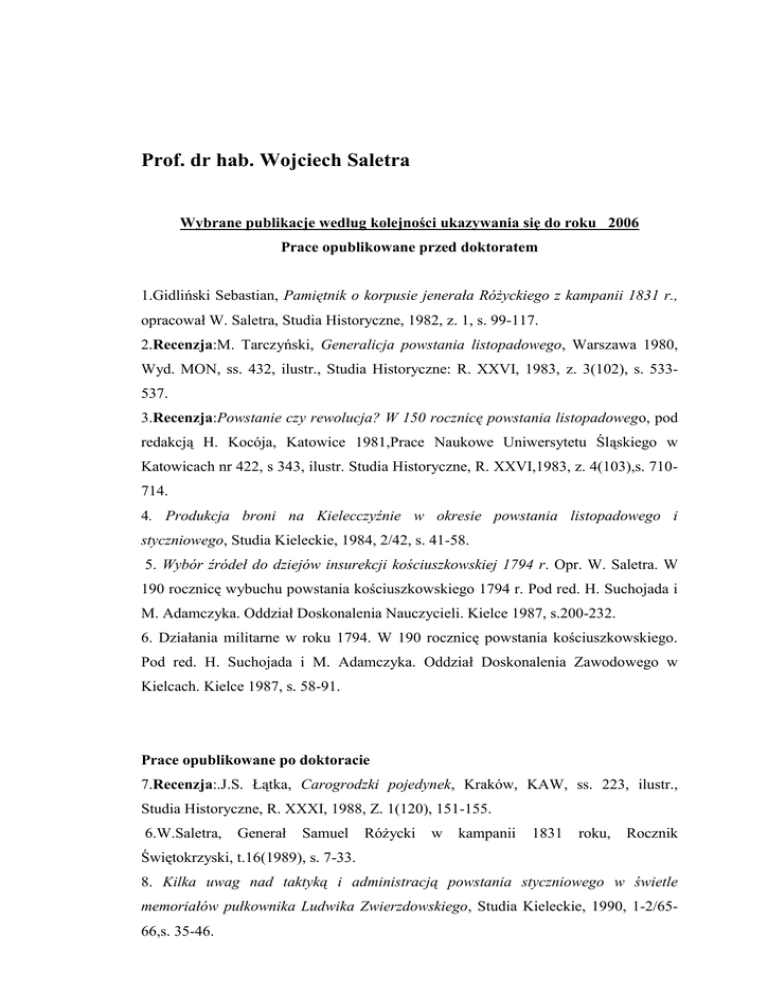 Prof. dr hab. Wojciech Saletra Wybrane publikacje według kolejności ukazywania się do roku 2006 Prace opublikowane przed doktoratem 1.Gidliński Sebastian, Pamiętnik o korpusie jenerała Różyckiego z kampanii 1831 r., opracował W. Saletra, Studia Historyczne, 1982, z. 1, s. 99-117. 2.Recenzja:M. Tarczyński, Generalicja powstania listopadowego, Warszawa 1980, Wyd. MON, ss. 432, ilustr., Studia Historyczne: R. XXVI, 1983, z. 3(102), s. 533537. 3.Recenzja:Powstanie czy rewolucja? W 150 rocznicę powstania listopadowego, pod redakcją H. Kocója, Katowice 1981,Prace Naukowe Uniwersytetu Śląskiego w Katowicach nr 422, s 343, ilustr. Studia Historyczne, R. XXVI,1983, z. 4(103),s. 710714. 4. Produkcja broni na Kielecczyźnie w okresie powstania listopadowego i styczniowego, Studia Kieleckie, 1984, 2/42, s. 41-58. 5. Wybór źródeł do dziejów insurekcji kościuszkowskiej 1794 r. Opr. W. Saletra. W 190 rocznicę wybuchu powstania kościuszkowskiego 1794 r. Pod red. H. Suchojada i M. Adamczyka. Oddział Doskonalenia Nauczycieli. Kielce 1987, s.200-232. 6. Działania militarne w roku 1794. W 190 rocznicę powstania kościuszkowskiego. Pod red. H. Suchojada i M. Adamczyka. Oddział Doskonalenia Zawodowego w Kielcach. Kielce 1987, s. 58-91. Prace opublikowane po doktoracie 7.Recenzja:.J.S. Łątka, Carogrodzki pojedynek, Kraków, KAW, ss. 223, ilustr., Studia Historyczne, R. XXXI, 1988, Z. 1(120), 151-155. 6.W.Saletra, Generał Samuel Różycki w kampanii 1831 roku, Rocznik Świętokrzyski, t.16(1989), s. 7-33. 8. Kilka uwag nad taktyką i administracją powstania styczniowego w świetle memoriałów pułkownika Ludwika Zwierzdowskiego, Studia Kieleckie, 1990, 1-2/6566,s. 35-46. 9. Wyprawa pułkownika Samuela Różyckiego na Litwę, Kieleckie Studia Historyczne, t.8(1990),s.93-111. 10.Wspólnie z W. Cabanem, Wkład społeczeństwa Kielecczyzny w walki narodowowyzwoleńcze w pierwszej połowie XIX wieku ( do 1864). w: Społeczeństwo województwa kieleckiego wobec niepodległości 1918 roku. Pod red. J. Ławnika Wyższa Szkoła Pedagogiczna im. J. Kochanowskiego, Kielce 1991,s.35-50. 11. Różycka Anna, Polski Słownik Biograficzny, t. XXXII/4, z. 134(1991), s. 516. 12.Wspólnie z Z. Zacharewicz, Różycki Samuel, Polski Słownik Biograficzny, t. XXXII/ 4, z. 135(1991), s. 538-542. 13. Budowa i pierwszy okres funkcjonowania kolej Dęblińsko-Dąbrowskiej w świetle „Gazety Kieleckiej”, Kieleckie Studia Historyczne, t. 13/1995, s.173-182. 14. Generał Samuel Różycki(1781-1834). Dowódca korpusu na Kielecczyźnie w 1831 roku. Wyższa Szkoła Pedagogiczna im. J. Kochanowskiego w Kielcach, Kielce 1996, ss. 301, w tym il. i tab. gen. 15. Sylwetki. Prof. dr. hab. Eligiusz Kozłowski 1924-1987. „ Ostatni Minister Wojny Rządu Narodowego”, Studia Kieleckie. Ser. Historyczna 1998, nr 3, s.127-131. 16. Tadeusz Józef Chamski, Memoriały w sprawach wojskowych dotyczące roku 1863,opracował W. Saletra, Studia Kieleckie. Ser. Historyczna 1998, nr 3, s. 97-117. 17. Samorząd Kielc w obliczu nowych wyzwań. Miasto na prawach powiatu, w: Rola samorządu w rozwoju regionalnym. Administracja. Zeszyty naukowe nr.1, Kielce 1999, s. 53-61. 18.Generał Samuel Różycki na emigracji(1831-1834), w: W kraju i na wychodźstwie. Księga pamiątkowa ofiarowana Profesorowi Sławomirowi Kalembce w 65 rocznicę urodzin, Toruń-Olsztyn 2001, s.555-566. 19.Wspólnie z J. Szczepański, Wstęp, s. 3-15 w: B. Markowski, Administracja skarbowa w Polsce, wyd. II. Wyższa Szkoła Handlowa im. B. Markowskiego, Kielce 2001. 20.B. Markowski, Administracja skarbowa w Polsce, opracowanie i wstęp W. Saletra i J. Szczepański, Wyższa Szkoła Handlowa im. B. Markowskiego, Kielce 2001. 21. Administracja skarbowa Księstwa Warszawskiego(1807-1815) i Królestwa Polskiego(1815-1830), w: Z dziejów skarbowości w Polsce od XVII do XX wieku, pod. red. W. Saletry, Wyższa Szkoła Handlowa im. B. Markowskiego, Kielce 2001,s. 31-38. 22.Wybór źródeł do dziejów skarbowości w Polsce od XVII do XX wieku. Opracował W. Saletra. w: Z dziejów skarbowości w Polsce od XVII do XX wieku, pod red. W. Saletry, Wyższa Szkoła Handlowa im. B. Markowskiego Kielce 2002, s. 97-393. 23.Z dziejów skarbowości w Polsce od XVII do XX wieku, pod red. W. Saletry. Wyższa Szkoła Handlowa im. B. Markowskiego, Kielce 2002, s. 405. 24.Z historii ustroju państwa polskiego od XVI do XX wieku, pod redakcją Wojciecha Saletry. Wyższa Szkoła Handlowa im. B. Markowskiego, Kielce 2003, s. 170. 25.Integracja Polski z Unią Europejską jako szansa rozwoju gmin i powiatów regionu świętokrzyskiego, pod redakcją W. Saletry i D. Rusinowicz. Wyższa Szkoła Handlowa im. B. Markowskiego, Kielce 2003, s. 250. 26. Administracja wojewódzka w dobie autonomicznej Królestwa Polskiego (18151831)- na przykładzie województwa krakowskiego i sandomierskiego w: Z historii ustroju państwa polskiego od XIV do XX wieku, pod red. W. Saletry, Wyższa Szkoła Handlowa. im. B. Markowskiego, Kielce 2003, s.69-87. 27. Województwo krakowskie i sandomierskie w Królestwie Polskim w latach 18151831. Ludność, administracja cywilna, kadry urzędnicze, w: Z przeszłości regionu świętokrzyskiego od XVI do XX wieku, pod red. J. Wijaczki, Kielce 2003, s. 107-134. 28.Wspólnie z M. Drobniak, Promocja jako jeden z elementów strategii rozwoju samorządu terytorialnego, w: Integracja Polski z Unią Europejską jako szansa rozwoju gmin i powiatów regionu świętokrzyskiego, pod redakcją W. Saletry i D. Rusinowicz, Wyższa Szkoła Handlowa im. B. Markowskiego, Kielce 2003, s. 131141. 29. Województwa krakowskie i sandomierskie w początkowej fazie powstania listopadowego 1830-1831 roku. Przyczynek do postawy społeczeństwa, Studia Humanistyczno- Społeczne Akademii Świętokrzyskiej, t. 1, (2005), s.49-68. 30.Studia Humanistyczno – Społeczno Akademii Świętokrzyskiej, pod redakcją W. Saletry t. 1, (2005), ss.213. 31 Żydzi wobec powstania listopadowego 1830-1831 roku- na