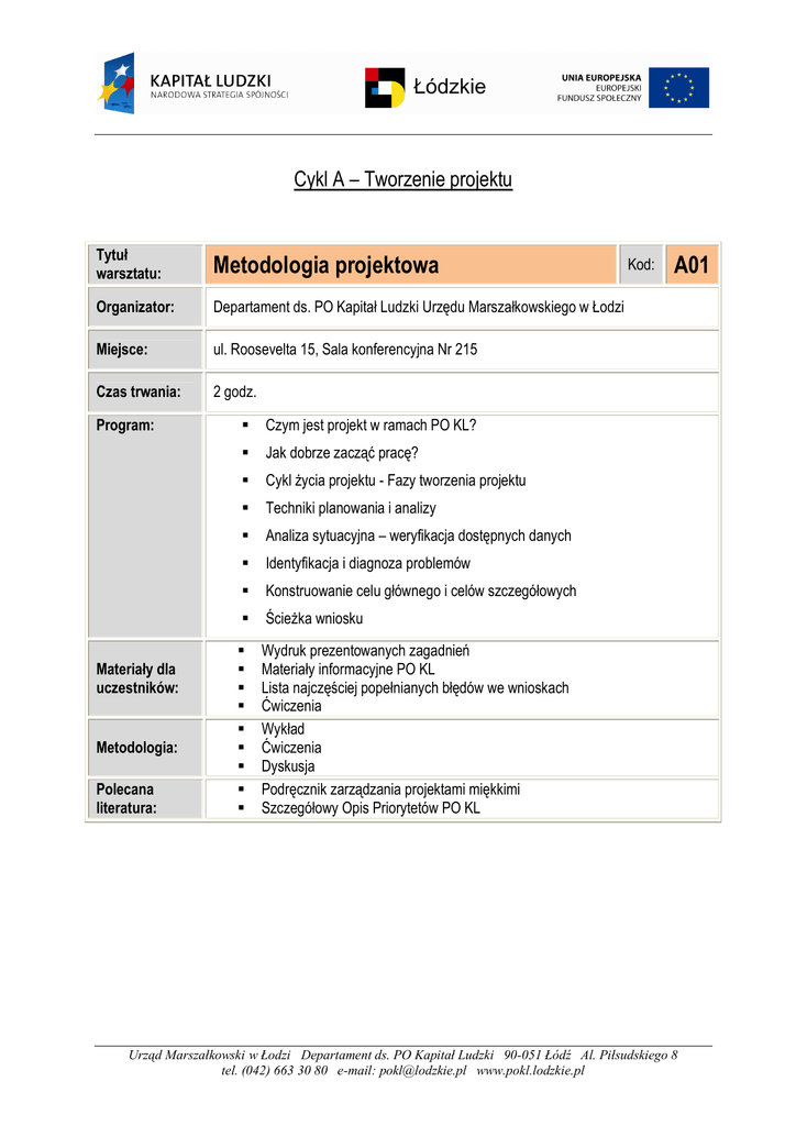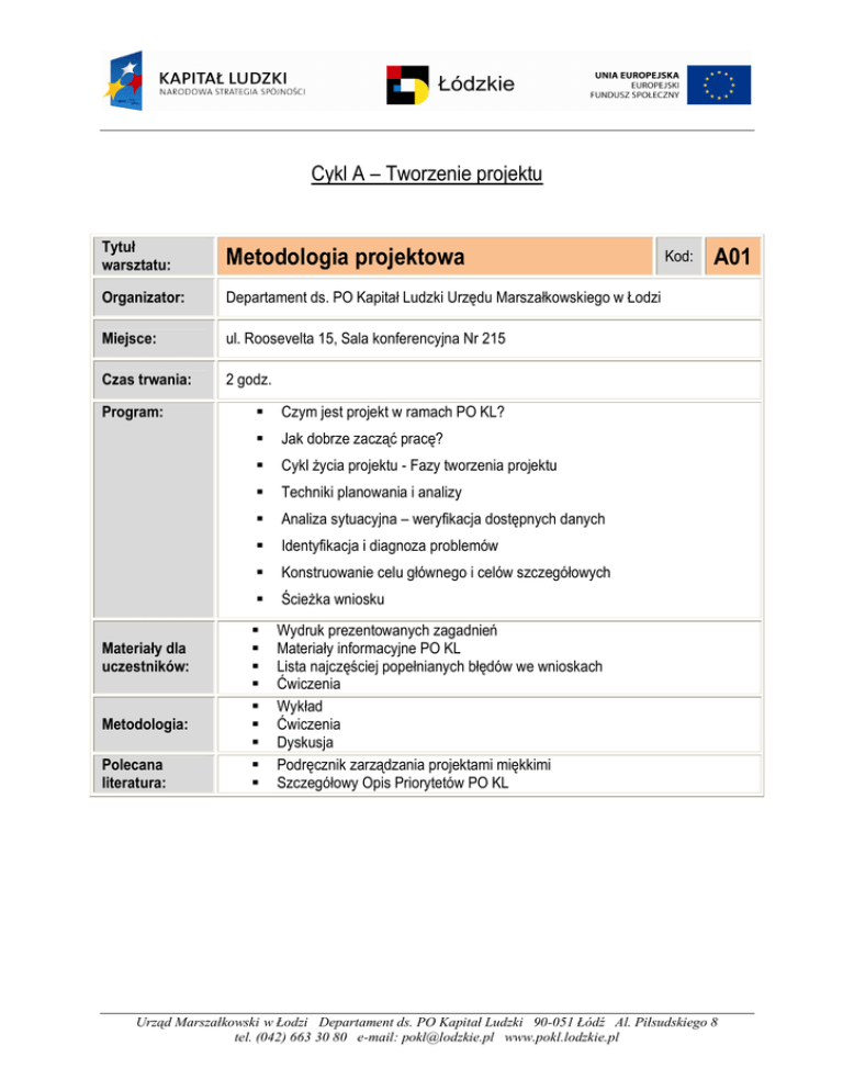 Cykl A – Tworzenie projektu Tytuł warsztatu: Metodologia projektowa Organizator: Departament ds. PO Kapitał Ludzki Urzędu Marszałkowskiego w Łodzi Miejsce: ul. Roosevelta 15, Sala konferencyjna Nr 215 Czas trwania: 2 godz. Program: Materiały dla uczestników: Metodologia: Polecana literatura: Czym jest projekt w ramach PO KL? Jak dobrze zacząć pracę? Cykl życia projektu - Fazy tworzenia projektu Techniki planowania i analizy Analiza sytuacyjna – weryfikacja dostępnych danych Identyfikacja i diagnoza problemów Konstruowanie celu głównego i celów szczegółowych Ścieżka wniosku Wydruk prezentowanych zagadnień Materiały informacyjne PO KL Lista najczęściej popełnianych błędów we wnioskach Ćwiczenia Wykład Ćwiczenia Dyskusja Podręcznik zarządzania projektami miękkimi Szczegółowy Opis Priorytetów PO KL Kod: A01 Urząd Marszałkowski w Łodzi Departament ds. PO Kapitał Ludzki 90-051 Łódź Al. Piłsudskiego 8 tel. (042) 663 30 80 e-mail: [email protected] www.pokl.lodzkie.pl