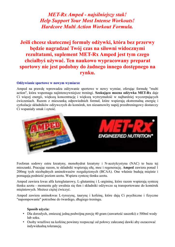 MET-Rx Amped - najsilniejszy stak! Help Support Your Most Intense Workouts! Hardcore Multi Action Workout Formula. Jeśli chcesz skutecznej formuły odżywki, która bez przerwy będzie nagradzać Twój czas na siłowni widocznymi rezultatami, suplement MET-Rx Amped jest tym czego chciałbyś używać. Ten naukowo wypracowany preparat sportowy nie jest podobny do żadnego innego dostępnego na rynku. Odżywianie sportowe w nowym wymiarze Amped na prawdę wprowadza odżywanie sportowe w nowy wymiar, oferując formułę "multi action", która wspomaga najintensywniejsze treningi. Szokująco mocna odżywka MET-Rx daje Ci więcej energii, większą koncentrację i większą wytrzymałość w najbardziej wyczerpujących ćwiczeniach. Razem z mieszanką odpowiednich formuł, które wspierają ekstremalną energię i cyrkulacje składników odżywczych do komórek, ten niesamowity napój przedtreningowy dostarczy Ci wspaniały smak i sytość. Fosforan sodowy estru kreatyny, monohydrat kreatyny i N-acetylcystyna (NAC) to baza tej mieszanki. Pracując razem, te składniki wspierają siłę, moc i regenerację. Amped zawiera ponad 1 200mg tych niezbędnych aminokwasów rozgałęzionych (BCAA). One właśnie budują mięśnie i pomagają podnieść poziom azotu. Wspiera syntezę tlenku azotu. Amped zawiera kwas alfa ketoglutarowy, L-glutaminę i L-argininę, które razem wspierają syntezę tlenku azotu - momentu gdy uwalnia się tlen i składniki odżywcze są transportowane do komórek mięśniowych. Możesz ciężej ćwiczyć. Amped zawiera aminokwas L-tyrozynę, taurynę i kofeinę, które dają Ci psychiczne i fizyczne "napompowanie" potrzebne do twardego, długiego treningu. Sposób użycia: • Dla dorosłych, zmieszaj jedną podwójną porcję 40 gram (zawartość saszetki) z 500ml wody lub soku. • Osoby wrażliwe na kofeinę powinny rozpocząć od połowy zalecanej dawki aby oszacować indywidualną tolerancję. • Nie przekraczać zalecanej porcji dziennej (1 saszetka). • Spożywaj minimum od sześciu do ośmiu szklanek wody dziennie. Skład odżywki - 100g zawiera : Wartość energetyczna 773 kJ / 182kcal Białko 0g Węglowodany 45g Cukry 1,7g Tłuszcz 0g Błonnik 0g Sód 0,83g Witamina B6 125mg Witamina B12 700ug Kwas Foliowy 1000ug Magnez 504mg Fosfor 1525mg Potas 50mg W jednej porcji (20g) zawiera: Ester kreatyny fosforan sodu plus Cysteina N-Acetylu 1500 mg L-Arginina 1000 mg L-Glutamina 1000 mg Monohydrat Kreatyny 1000 mg Tauryna 1000 mg L-Leucyna 700 mg L-Tyrozyna 500 mg L-Walina 250mg L-Izoleucyna 250 mg Anhydrus Kreatyny 100 mg Kwas Alfa-Ketoglutarowy 0,33 mg • • • • • • • • • • Inne składniki skutecznego suplementu diety: maltodekstryna, kwas cytrynowy, ester kreatyny, fosforan sodu z l-cysteiną N-Acetylu, sproszkowany sok buraczany, słodzik (sukraloza), witamina H6, witamina B12, kwas foliowy, kwas alfa-ketoglutaryczny. Sprawdź co firma produkująca tanie odżywki do budowy masy mięśni Met-RX oraz najlepsze suplementy diety wspomagające rozwój muskulatury ma w swojej ofercie dla osób, dla których kulturystyka jest pasją i sposobem na życie. Producent odżywki energetycznej do zastosowania przed treningiem - Amped : MET-Rx Pełna oferta suplementów z tlenkiem azotu oraz najtańszych odżywek dla profesjonalnych kulturystów, które wydłużają czas trwania 'pompy', przyspieszają odbudowę ATP, zapewniają trwalszą i doskonalszą regenerację Twojej muskulatury. www.kulturystyka.sklep.pl