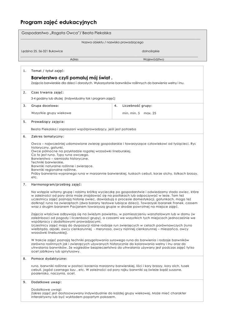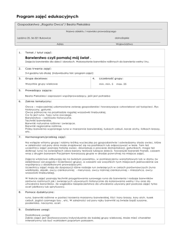 Program zajęć edukacyjnych Gospodarstwo „Rogata Owca”/ Beata Piekalska ________________________________________________ ______________________________________________________________________ Nazwa obiektu / nazwisko prowadzącego Lędzina 25, 56-321 Bukowice dolnośląskie _____________________________________________________________________________________________________________________ Adres Województwo 1. Temat / tytuł zajęć: Barwierstwo czyli pomaluj mój świat . Zzajęcia barwierskie dla dzieci i dorosłych. Wykorzystanie barwników roślinnych do barwienia wełny i lnu. 2. Czas trwania zajęć: 3-4 godziny lub dłużej (indywidualny tok i program zajęć) 3. Grupa docelowa: Wszystkie grupy wiekowe 5. 4. Liczebność grupy: min. min. 5 max. 25 Prowadzący zajęcia: Beata Piekalska i zapraszani współprowadzący, jeśli jest potrzeba 6. Zakres tematyczny: Owca – najwcześniej udomowione zwierzę gospodarskie i towarzyszące człowiekowi od tysiącleci. Rys historyczny, gatunki. Owce północne na przykładzie rogatej wrzosówki lineburskiej. Co to jest runo. Typy runa owczego. Barwierstwo – rzemiosło historyczne. Techniki barwierskie. Barwniki naturalne roślinne i zwierzęce. Barwniki regionalne roślinne. Próby barwienia wypranego runa w marzannie barwierskiej, łuskach cebuli, kor ze olchy, listkach brzozy, etc. 7. Harmonogram/przebieg zajęć: Na wstępie witamy grupę i robimy krótką wycieczkę po gospodarstwie i odwiedzamy stado owiec, które w zależności od pory dnia może znajdować się na pastiskach lub odpoczywać w lesie. Tam też uczestnicy zajęć poznają historię owiec, dowiadują o procesie domestykacji, gatunkach, moga też dotknąć runa na zwierzętach (dwa barany testowe lubiące dzieci). Towarzyski baranek Franek, czasem wraz z drugim baranem Pacjanem towarzyszą grupie w drodze powr otnej na miejsce zajęć. Zajęcia właściwe odbywają się na świeżym powietrzu, w pomieszczeniu warsztatowym lub w domu (w zależnbosci od pogody i liczenbosci grupy), a czasami we wszystkich tych miejscach jednocześnie we współpracy z dodatkowymi prowadzacymi. Uczestnicy zajęć mają do dyspozycji różne rodzaje run zwierzęcych w celach porównawczych (runo wielbłąda, alpaki, owcy cienkorunnej - merynosa, owcy nizinnej cienkorunnej – mieszańca, owcy wrzosówki lineburskiej). W trakcie zajęć poznają techniki przygotowania surowego runa do barwienia i rodzaje barwników zarówno roslinnych jak i zwierzęcych używanych historycznie do kolorowania wełny i lnu oraz do utrwalania barwników. Ze wzgledów bezpieczeństwa do utrwalania używany jest podczas zajęć tyl ko ocet jabłkowy lub spirytusowy. 8. Pomoce dydaktyczne: runo, barwniki roślinne w postaci korzenia marzanny barwierskiej, liści i kory brzozy, kory olch, łusek cebuli, jagód czarnego bzu , etc. W zależności od pory rojku barwniki są świeże bądź suszone, poalenisko, naczynia, ocet. 9. Dodatkowe uwagi: Dodatkowe uwagi: Zakres zajęć jest dostosowywany indywidualnie do każdej grupy wiekowej. Może mieć charakter interaktywny lub być wykładem popartym pokazem.