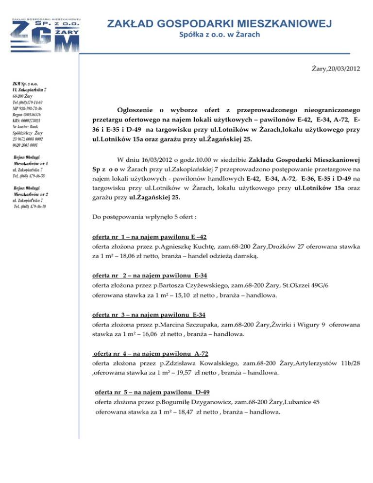 ZAKŁAD GOSPODARKI MIESZKANIOWEJ Spółka z o.o. w Żarach Żary,20/03/2012 ZGM Sp. z o.o. Ul. Zakopiańska 7 68-200 Żary Tel (068)479-14-69 NIP 928-198-78-46 Regon 080156576 KRS: 0000273021 Nr konta:: Bank Spółdzielczy Żary 23 9672 0008 0002 0620 2001 0001 Rejon Obsługi Mieszkańców nr 1 ul. Zakopiańska 7 Tel. (068) 479-46-38 Rejon Obsługi Mieszkańców nr 2 ul. Zakopiańska 7 Tel. (068) 479-46-40 Ogłoszenie o wyborze ofert z przeprowadzonego nieograniczonego przetargu ofertowego na najem lokali użytkowych – pawilonów E-42, E-34, A-72, E36 i E-35 i D-49 na targowisku przy ul.Lotników w Żarach,lokalu użytkowego przy ul.Lotników 15a oraz garażu przy ul.Żagańskiej 25. W dniu 16/03/2012 o godz.10.00 w siedzibie Zakładu Gospodarki Mieszkaniowej Sp z o o w Żarach przy ul.Zakopiańskiej 7 przeprowadzono postępowanie przetargowe na najem lokali użytkowych - pawilonów handlowych E-42, E-34, A-72, E-36, E-35 i D-49 na targowisku przy ul.Lotników w Żarach, lokalu użytkowego przy ul.Lotników 15a oraz garażu przy ul.Żagańskiej 25. Do postępowania wpłynęło 5 ofert : oferta nr 1 – na najem pawilonu E –42 oferta złożona przez p.Agnieszkę Kuchtę, zam.68-200 Żary,Drożków 27 oferowana stawka za 1 m² – 18,06 zł netto, branża – handel odzieżą damską. oferta nr 2 – na najem pawilonu E-34 oferta złożona przez p.Bartosza Czyżewskiego, zam.68-200 Żary, St.Okrzei 49G/6 oferowana stawka za 1 m² – 15,10 zł netto , branża – handlowa. oferta nr 3 – na najem pawilonu E-34 oferta złożona przez p.Marcina Szczupaka, zam.68-200 Żary,Żwirki i Wigury 9 oferowana stawka za 1 m² – 16,06 zł netto , branża – handlowa. oferta nr 4 – na najem pawilonu A-72 oferta złożona przez p.Zdzisława Kowalskiego, zam.68-200 Żary,Artylerzystów 11b/28 ,oferowana stawka za 1 m² – 19,57 zł netto , branża – handlowa. oferta nr 5 – na najem pawilonu D-49 oferta złożona przez p.Bogumiłę Dzyganowicz, zam.68-200 Żary,Lubanice 45 oferowana stawka za 1 m² – 18,47 zł netto , branża – handlowa. Komisja Przetargowa w toku oceny ofert oraz po sprawdzeniu dokumentów do nich załączonych ustaliła wybór ofert : nr 1, nr 3 i nr 4. Oferty nr 2 i nr 5 nie zostały przyjęte. W związku z tym, iż na lokale użytkowe – pawilony E-35 i E-36, lokal użytkowy przy ul.Lotników 15a oraz garaż przy ul.Żagańskiej 25 – nie wpłynęła żadna oferta oraz z uwagi na nie przyjęcie oferty na najem pawilonu D-49 ( oferent zaproponował kwotę przebicia niższą od podanej w Ogłoszeniu o przetargu z dnia 27.02.2012r. - l.p.6, kolumna 7), ZGM ogłosi II przetarg na ich najem ( z obniżoną o 20 % stawką bazową) - zgodnie z § 5 pkt 2 Zarządzenia Nr 18/12 Burmistrza Miasta Żary z dnia 31/01/2012r „w sprawie zasad gospodarowania mieniem gminnym w zakresie najmu i minimalnych stawek czynszu za lokale użytkowe”. / - / Komisja Przetargowa