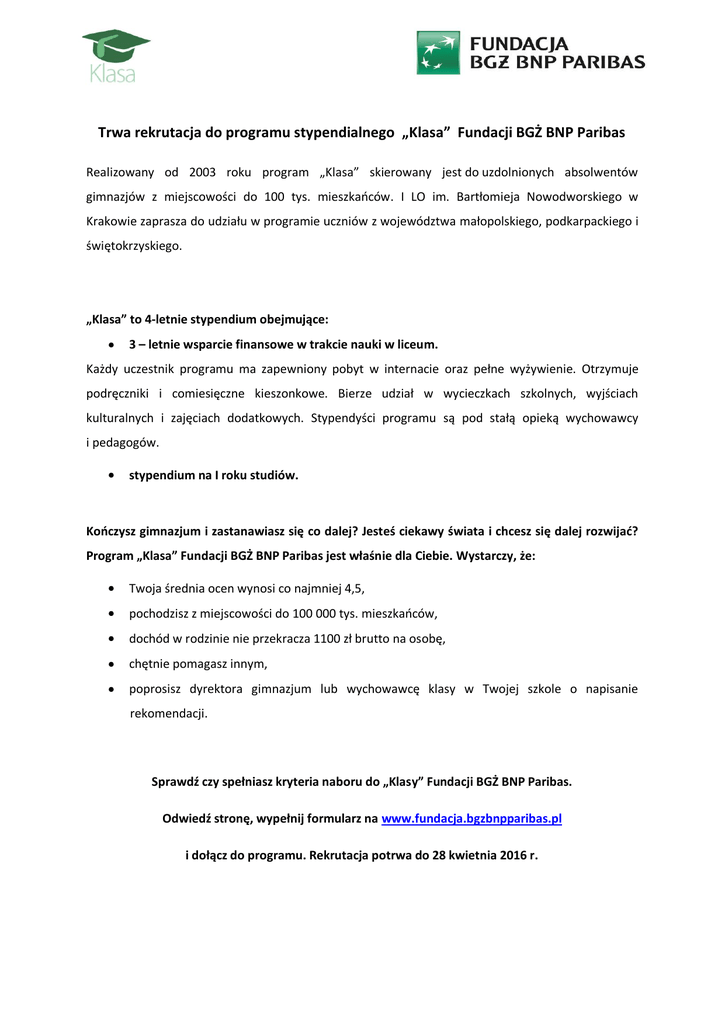 Trwa rekrutacja do programu stypendialnego „Klasa” Fundacji BGŻ BNP Paribas Realizowany od 2003 roku program „Klasa” skierowany jest do uzdolnionych absolwentów gimnazjów z miejscowości do 100 tys. mieszkańców. I LO im. Bartłomieja Nowodworskiego w Krakowie zaprasza do udziału w programie uczniów z województwa małopolskiego, podkarpackiego i świętokrzyskiego. „Klasa” to 4-letnie stypendium obejmujące: 3 – letnie wsparcie finansowe w trakcie nauki w liceum. Każdy uczestnik programu ma zapewniony pobyt w internacie oraz pełne wyżywienie. Otrzymuje podręczniki i comiesięczne kieszonkowe. Bierze udział w wycieczkach szkolnych, wyjściach kulturalnych i zajęciach dodatkowych. Stypendyści programu są pod stałą opieką wychowawcy i pedagogów. stypendium na I roku studiów. Kończysz gimnazjum i zastanawiasz się co dalej? Jesteś ciekawy świata i chcesz się dalej rozwijać? Program „Klasa” Fundacji BGŻ BNP Paribas jest właśnie dla Ciebie. Wystarczy, że: Twoja średnia ocen wynosi co najmniej 4,5, pochodzisz z miejscowości do 100 000 tys. mieszkańców, dochód w rodzinie nie przekracza 1100 zł brutto na osobę, chętnie pomagasz innym, poprosisz dyrektora gimnazjum lub wychowawcę klasy w Twojej szkole o napisanie rekomendacji. Sprawdź czy spełniasz kryteria naboru do „Klasy” Fundacji BGŻ BNP Paribas. Odwiedź stronę, wypełnij formularz na www.fundacja.bgzbnpparibas.pl i dołącz do programu. Rekrutacja potrwa do 28 kwietnia 2016 r. Fundacja BGŻ BNP Paribas została powołana do życia w 2006 roku. Celem Fundacji jest prowadzenie działalności społecznie użytecznej w zakresie edukacji, kultury oraz solidarności społecznej, podejmowanie i wspieranie inicjatyw na rzecz kształtowania postaw obywatelskich oraz rozwoju przedsiębiorczości i świadomości finansowej, a także wspieranie idei wolontariatu, popularyzacja tej formy zaangażowania w sektorze finansowym i rozwijanie wolontariatu pracowniczego w Banku. Fundacja wspiera i propaguje inicjatywy służące podnoszeniu poziomu edukacyjnego społeczeństwa, w szczególności wyrównywania szans rozwoju intelektualnego, edukacyjnego i zawodowego utalentowanej młodzieży z różnych środowisk, wywodzącej się z regionów oraz rodzin dotkniętych ubóstwem. Od 2009 roku Fundacja BGŻ BNP Paribas działa w Forum Darczyńców, wspierając rozwój sektora organizacji pozarządowych w Polsce. Więcej szczegółów dotyczących działalności Fundacji i programu „Klasa” znajdą Państwo na stronie www.fundacja.bgzbnpparibas.pl.