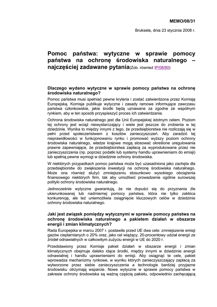 MEMO/08/31 Bruksela, dnia 23 stycznia 2008 r. Pomoc państwa: wytyczne w sprawie pomocy państwa na ochronę środowiska naturalnego – najczęściej zadawane pytania(Zob. również IP/08/80) Dlaczego wydano wytyczne w sprawie pomocy państwa na ochronę środowiska naturalnego? Pomoc państwa musi spełniać pewne kryteria i zostać zatwierdzona przez Komisję Europejską. Komisja publikuje wytyczne i zasady ramowe informujące zawczasu państwa członkowskie, jakie środki będą uznawane za zgodne ze wspólnym rynkiem, aby w ten sposób przyspieszyć proces ich zatwierdzania. Ochrona środowiska naturalnego jest dla Unii Europejskiej istotnym celem. Poziom tej ochrony jest wciąż niewystarczający i wiele jest jeszcze do zrobienia w tej dziedzinie. Wynika to między innymi z tego, że przedsiębiorstwa nie rozliczają się w pełni przed społeczeństwem z kosztów zanieczyszczeń. Aby zaradzić tej nieprawidłowości w funkcjonowaniu rynku i promować wyższy poziom ochrony środowiska naturalnego, władze krajowe mogą stosować określone uregulowania prawne zapewniające, że przedsiębiorstwa zapłacą za wyprodukowane przez nie zanieczyszczenia (np. poprzez podatki lub systemy handlu uprawnieniami do emisji) lub spełnią pewne wymogi w dziedzinie ochrony środowiska. W niektórych przypadkach pomoc państwa może być uzasadniona jako zachęta dla przedsiębiorstw do zwiększenia inwestycji na ochronę środowiska naturalnego. Może ona również służyć zmniejszeniu stosunkowo wysokiego obciążenia finansowego niektórych firm, tak aby umożliwić prowadzenie ogólnie surowszej polityki ochrony środowiska naturalnego. Jednocześnie wytyczne gwarantują, że nie dopuści się do przyznania źle ukierunkowanej lub nadmiernej pomocy państwa, która nie tylko zakłóca konkurencję, ale też uniemożliwia osiągnięcie kluczowych celów w dziedzinie ochrony środowiska naturalnego. Jaki jest związek pomiędzy wytycznymi w sprawie pomocy państwa na ochronę środowiska naturalnego a pakietem działań w obszarze energii i zmian klimatycznych? Rada Europejska w marcu 2007 r. postawiła przed UE dwa cele: zmniejszenie emisji gazów cieplarnianych o 20% oraz, jako cel wiążący, 20-procentowy udział energii ze źródeł odnawialnych w całkowitym zużyciu energii w UE do 2020 r. Przedstawiony przez Komisje pakiet działań w obszarze energii i zmian klimatycznych obejmuje daleko idące środki, między innymi w dziedzinie energii odnawialnej i handlu uprawnieniami do emisji. Aby osiągnąć te cele, pakiet wprowadza mechanizmy rynkowe, w wyniku których zanieczyszczający zapłacą za wytworzone przez siebie zanieczyszczenia a technologie bardziej przyjazne środowisku otrzymają wsparcie. Nowe wytyczne w sprawie pomocy państwa w zakresie ochrony środowiska są ważną częścią pakietu, odpowiednio zachęcającą państwa członkowskie i przemysł do zwiększania wysiłków na rzecz ochrony środowiska. Po pierwsze poprzez ochronę skutecznej konkurencji wytyczne wspierają przewidziane w pakiecie instrumenty działające na zasadach rynkowych. Osiągnięcie wyznaczonych celów jest niemożliwe bez skutecznej konkurencji. Sytuacja, w której zanieczyszczający nie wnoszą wystarczająco wysokich opłat i mogą uniknąć odpowiednich inwestycji w ochronę środowiska ponieważ otrzymują pomoc państwa, nie tylko zakłóca konkurencję, ale też uniemożliwia realizację ambitnych celów Unii w dziedzinie ochrony środowiska. Po drugie wytyczne zawierają szereg środków uzupełniających, które przyczyniają się do polepszenia ochrony środowiska. W niektórych przypadkach może się okazać, że państwa członkowskie nie mogą wdrożyć zasady „zanieczyszczający płaci” w odpowiedni sposób. W takich przypadkach pomoc państwa może być alternatywą pozwalającą zaradzić nieprawidłowościom w funkcjonowaniu rynku spowodowanym negatywnymi oddziaływaniami zewnętrznymi związanymi z ochroną środowiska. Pomoc państwa może umożliwić poszczególnym przedsiębiorstwom zmianę ich zachowania oraz wprowadzenie procesów produkcyjnych bardziej przyjaznych środowisku lub inwestycje w bardziej ekologiczne technologie. Pomoc państwa może też umożliwić państwom członkowskim przyjęcie przepisów lub norm surowszych niż normy wspólnotowe poprzez zmniejszenie nadmiernych ograniczeń dla niektórych przedsiębiorstw. Wszystkie te działania mogą przyczynić się do osiągnięcia celów Wspólnoty w dziedzinie ochrony środowiska. W przypadku dobrze ukierunkowanej pomocy wytyczne przewidują możliwość bardzo hojnej pomocy. Na przykład w przypadku produkcji energii ze źródeł odnawialnych państwa członkowskie mają możliwość pokrycia 100% dodatkowych kosztów obciążających przedsiębiorstwa. Jakie najważniejsze zmiany wprowadzają nowe wytyczne w dziedzinie ochrony środowiska (w porównaniu z poprzednimi)? Główne zmiany w nowych wytycznych w dziedzinie ochrony środowiska w porównaniu z wytycznymi z 2001 r. są następujące: 1. Nowe wytyczne zawierają szereg nowych przepisów, np. w sprawie pomocy na wcześniejsze dostosowanie do norm, pomocy na badania środowiska, pomocy na ciepłownictwo komunalne, pomocy na gospodarowanie odpadami i pomocy dotyczącej programów handlu uprawnieniami. 2. Progi intensywności pomocy znacznie wzrosły. Progi intensywności dla dużych przedsiębiorstw zostały podniesione z 30-40% do 50-60%. Dla małych przedsiębiorstw progi intensywności podniesiono z 50-60% do 70-80%. Ponadto, jeżeli inwestycja w celu spełnienia wymogów surowszych niż normy wspólnotowe lub w celu podniesienia poziomu ochrony środowiska w przypadku braku norm wspólnotowych wiąże się z innowacją ekologiczną, można przyznać dodatkową 10-procentową premię. Dodatkowo wprowadzono możliwość przyznania 100-procentowej pomocy na drodze procedury przetargowej zgodnej z zasadami konkurencji. W przeciwieństwie do wytyczny