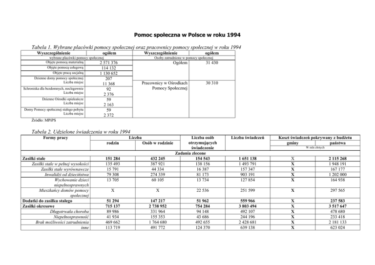 Pomoc społeczna w Polsce w roku 1994 Tabela 1. Wybrane