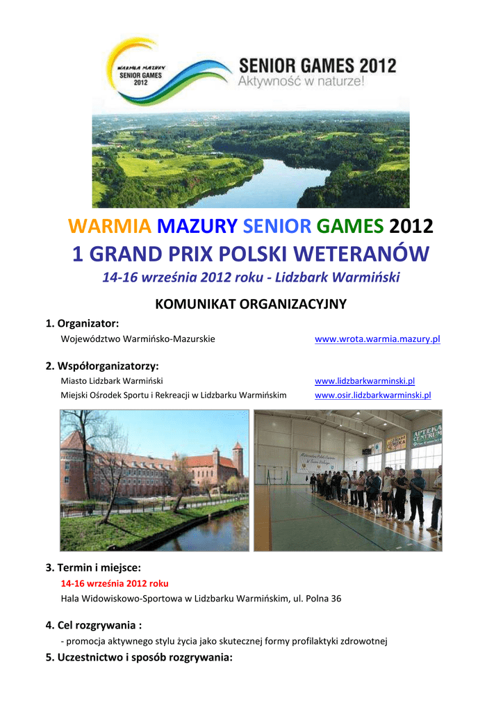 WARMIA MAZURY SENIOR GAMES 2012 1 GRAND PRIX POLSKI WETERANÓW 14-16 września 2012 roku - Lidzbark Warmiński KOMUNIKAT ORGANIZACYJNY 1. Organizator: Województwo Warmińsko-Mazurskie www.wrota.warmia.mazury.pl 2. Współorganizatorzy: Miasto Lidzbark Warmiński Miejski Ośrodek Sportu i Rekreacji w Lidzbarku Warmińskim www.lidzbarkwarminski.pl www.osir.lidzbarkwarminski.pl 3. Termin i miejsce: 14-16 września 2012 roku Hala Widowiskowo-Sportowa w Lidzbarku Warmińskim, ul. Polna 36 4. Cel rozgrywania : - promocja aktywnego stylu życia jako skutecznej formy profilaktyki zdrowotnej 5. Uczestnictwo i sposób rozgrywania: 1 Turniej z cyklu Grand Prix Polski Weteranów w Lidzbarku Warmińskim będzie rozgrywany zgodnie z Regulaminem Rozgrywek Weteranów na sezon 2012/2013. Uczestnik zawodów zobowiązany jest do podpisania oświadczenia, iż na własną odpowiedzialność podejmuje ryzyko związane ze startem i wysiłkiem podczas zawodów i nie będzie miał żadnych roszczeń w stosunku do organizatora w razie wystąpienia u zawodnika jakiegokolwiek negatywnego następstwa udziału w zawodach. Złożenie oświadczenia jest warunkiem dopuszczenia do startu. Druk oświadczenia dostępny jest do pobrania na oficjalnej stronie zawodów sportowych „Warmia Mazury Senior Games 2012” www.seniorgames2012.org , w zakładce "Do pobrania". 6. Orientacyjny program zawodów: 12 września 2012 roku (środa) godz. 21:00 godz. 22:00 zamknięcie rejestracji zawodników, zamknięcie list startowych i losowanie grup turniejów eliminacyjnych we wszystkich kategoriach wiekowych opublikowanie na stronie www.seniorgames2012.pl oraz www.agamar.pl/ts szczegółowego programu zawodów z kompletem tabel turniejów eliminacyjnych 14 września 2012 roku (piątek) godz. 18:00 godz. 20:00 Turniej Open o Puchar Burmistrza Miasta Lidzbark Warmiński w 2 kategoriach wiekowych: 40-59 lat oraz powyżej 60 lat kolacja 15 września 2012 roku (sobota) godz. 08:00 godz. 09:00 godz. 10:30 godz. 11:30 godz. 13:30 - 15:00 godz. 15:00 - 19:00 godz. 16:30 - 19:00 godz. 20:00 śniadanie turnieje eliminacyjne: mężczyźni kategorie wiekowe: 60-64, 65-69, 70-74 i powyżej 75 lat ceremonia otwarcia zawodów, po której odbędzie się pokazowy turniej gier podwójnych z udziałem 16 par turnieje eliminacyjne: kobiety: wszystkie kategorie wiekowe i mężczyźni kategorie wiekowe: 40-49 i 50-59 lat obiad turnieje główne i pocieszenia: kobiety: wszystkie kategorie wiekowe i mężczyźni kategorie wiekowe: 60-64, 65-69, 70-74 i powyżej 75 lat turnieje główne i pocieszenia: mężczyźni kategorie wiekowe: 40-49 i 50-59 lat Wieczór Weterana - ognisko integracyjne z pieczeniem kiełbasek 16 września 2012 roku (niedziela) godz. 08:00 godz. 09:00 godz. 13:00 godz. 14:00 śniadanie ciąg dalszy 1 Grand Prix Polski Weteranów ceremonia wręczenie nagród i zamknięcia 1 Grand Prix Polski Weteranów obiad Turniej będzie rozgrywany w 2 halach sportowych, na 16 stołach firmy Butterfly, piłeczkami Double Circle 01 Szczegółowy program zawodów zostanie umieszczony na oficjalnej stronie zawodów www.seniorgames2012.org tuż po zakończeniu rejestracji zawodników. 7. Zgłoszenia : Zgłoszenia do turnieju należy dokonać na stronie: http://seniorgames2012.pl/registration/index Dodatkowo wypełnioną kartę zgłoszeniową WRAZ Z POTWIERDZENIEM dokonania opłaty wpisowego w wysokości 30 zł (organizator dopłaca 15 zł) należy przesłać w NIEPRZEKRACZALNYM terminie do dnia 12 września 2012 roku do godz. 21:00: Przewodniczący Rady Weteranów Marek PRZYBYŁOWICZ e-mail: [email protected] , tel. 607 922 249 Zawodnik, który został zarejestrowany przez organizatora zawodów jako uczestnik imprezy jest uprawniony do: 1) uczestnictwa we wszystkich zawodach sportowych, z tym, że udział w turnieju golfowym wymaga dodatkowo uiszczenia opłaty turniejowej, 2) uczestnictwa w ceremonii otwarcia i zamknięcia zawodów, 3) otrzymania pakietu startowego (w przypadku uiszczenia opłaty w wysokości 40 Euro), 4) otrzymania programu zawodów, 5) otrzymania certyfikatu uczestnictwa w zawodach sportowych, 6) otrzymania Karty Senior Prestige upoważniającej do korzystania ze zniżek i darmowych wejść do obiektów zgodnie z Regulaminem Karty. 8. Zakwaterowanie: Uczestnicy zawodów rezerwują noclegi we własnym zakresie: Agroturystyka DA-MAR Pokoje Gościnne Dariusz Cytowicz ul. Dąbrowskiego 24, 11-100 Lidzbark Warmiński tel. 89-7672913, tel. kom. 601254282 pokoje: 1-osobowe, 2–osobowe i 3-osobowe; koszt: 50 zł od osoby Ośrodek Wypoczynkowy "Zacisze Leśne" Medyny 4, 11-100 Lidzbark Warmiński tel. 89-7672427 pokoje: 2–osobowe; koszt: 25 zł od osoby Hotelik PRZY BRAMIE ul. Konstytucji 3 Maja 18, 11-100 Lidzbark Warmiński tel. 89-7672099 pokoje: 2-osobowe; koszt: 110 zł za pokój Hotelik WARMIA ul. Konstytucji 3 Maja 22, 11-100 Lidzbark Warmiński tel. kom. 723714920 Pokoje: 2-osobowe - 120 zł za pokój 3-osobowe - 130 zł za pokój 4-osobowy – 140 zł za pokój Hotelik KOPERNIK ul. Zielona 1, 11-100 Lidzbark Warmiński tel. 89-7675010 koszt: od 130 zł za pokój 8. Wyżywienie: Organizator zapewnia w miejscu zawodów bufet z ciepłymi daniami. 9. Sprawy finansowe: Wszystkie opłaty należy dokonać w NIEPRZEKRACZALNYM terminie do dnia 12 września 2012 roku do godz. 21:00 na rachunek: - wpisowe do 1 Grand Prix Weteranów - 30 zł (organizator dopłaca 15 zł): Organizacja Środowiskowa AZS woj. Warmińsko-Mazurskiego ul. Oczapowskiego 12, 10-718 Olsztyn nr konta: 52 1240 5598 1978 0010 4386 6684 - wpisowe do Turnieju Open - 15 zł oraz opłata za udział w Biesiadzie Weteranów - 30 zł : LUKS WARMIA Lidzbark Warmiński ul. Bartoszycka 24, 11-100 Lidzbark Warmiński nr konta: 88 8855 0004 2002 0010 9414 0001 10. Nagrody: - 4 najlepsze zawodniczki i zawodnicy w każdej kategorii otrzymają medale, puchary, dyplomy i nagrody rzeczowe; - wszyscy uczestnicy otrzymują certyfikaty uczestnictwa w zawodach. 11. Dodatkowe informacje: 1. Inform