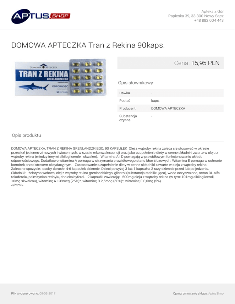 Apteka z Gór Papieska 39, 33-300 Nowy Sącz +48 882 004 443 DOMOWA APTECZKA Tran z Rekina 90kaps. Cena: 15,95 PLN Opis słownikowy Dawka - Postać kaps. Producent DOMOWA APTECZKA Substancja czynna - Opis produktu DOMOWA APTECZKA, TRAN Z REKINA GRENLANDZKIEGO, 90 KAPSUŁEK Olej z wątroby rekina zaleca się stosować w okresie przesileń jesienno-zimowych i wiosennych, w czasie rekonwalescencji oraz jako uzupełnienie diety w cenne składniki zwarte w oleju z wątroby rekina (między innymi alkiloglicerole i skwalen). Witamina A i D pomagają w prawidłowym funkcjonowaniu układu odpornościowego. Dodatkowo witamina A pomaga w utrzymaniu prawidłowego stanu błon śluzowych. Witamina E pomaga w ochronie komórek przed stresem oksydacyjnym. Zastosowanie: uzupełnienie diety w cenne składniki zawarte w oleju z wątroby rekina. Zalecane spożycie: osoby dorosłe: 4-6 kapsułek dziennie. Dzieci powyżej 3 lat: 1 kapsułka 2 razy dziennie przed lub po jedzeniu. Składniki: żelatyna wołowa, olej z wątroby rekina grenlandzkiego, glicerol (substancja stabilizująca), woda oczyszczona, octan DL-alfa tokoferolu, palmitynian retinylu, cholekalcyferol. 2 kapsułki zawierają: 500mg oleju z wątroby rekina (w tym: 101mg alkilogliceroli, 10mg skwalenu), witaminę A 198mcg (25%)*, witaminę D 2,5mcg (50%)*, witaminę E 0,6mg (5%) </html> Plik wygenerowano: 09-03-2017 Powered by TCPDF (www.tcpdf.org) Oprogramowanie sklepu: AptusShop