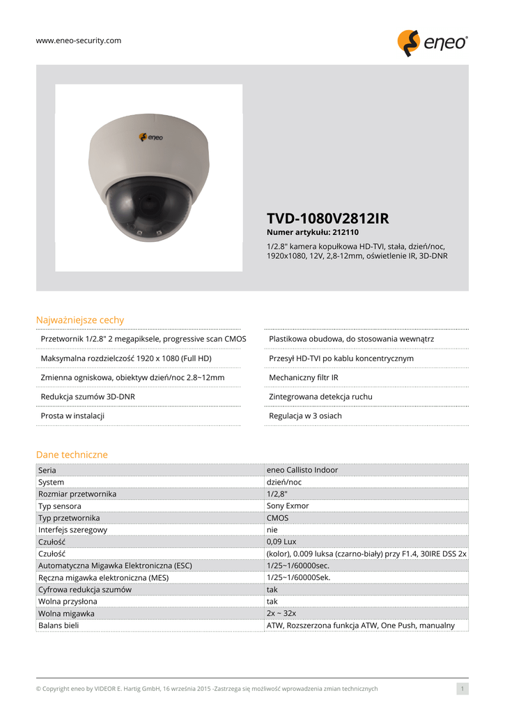 www.eneo-security.com TVD-1080V2812IR Numer artykułu: 212110 1/2.8" kamera kopułkowa HD-TVI, stała, dzień/noc, 1920x1080, 12V, 2,8-12mm, oświetlenie IR, 3D-DNR Najważniejsze cechy Przetwornik 1/2.8" 2 megapiksele, progressive scan CMOS Plastikowa obudowa, do stosowania wewnątrz Maksymalna rozdzielczość 1920 x 1080 (Full HD) Przesył HD-TVI po kablu koncentrycznym Zmienna ogniskowa, obiektyw dzień/noc 2.8~12mm Mechaniczny filtr IR Redukcja szumów 3D-DNR Zintegrowana detekcja ruchu Prosta w instalacji Regulacja w 3 osiach Dane techniczne Seria eneo Callisto Indoor System dzień/noc Rozmiar przetwornika 1/2,8" Typ sensora Sony Exmor Typ przetwornika CMOS Interfejs szeregowy nie Czułość 0,09 Lux Czułość (kolor), 0.009 luksa (czarno-biały) przy F1.4, 30IRE DSS 2x Automatyczna Migawka Elektroniczna (ESC) 1/25~1/60000sec. Ręczna migawka elektroniczna (MES) 1/25~1/60000Sek. Cyfrowa redukcja szumów tak Wolna przysłona tak Wolna migawka 2x ~ 32x Balans bieli ATW, Rozszerzona funkcja ATW, One Push, manualny © Copyright eneo by VIDEOR E. Hartig GmbH, 16 września 2015 -Zastrzega się możliwość wprowadzenia zmian technicznych 1 www.eneo-security.com TVD-1080V2812IR C.d. danych technicznych Kompensacja światła BLC, HLC Szeroki zakres dynamiki (WDR) WDR, D-WDR Wide Dynamic Range (WDR) 113dB Stosunek sygnału do szumu 50dB Filtr IR mechaniczny Przełączanie pomiędzy trybami D/N auto, dzień, noc, zewnętrzny (czujnik) Obracanie obrazu odbicie pionowe, odbicie poziome, odbicie poziome/pionowe Rozdzielczość 1920x1080 (16:9), 1280x720 (16:9) Ilość klatek na sekundę 1080 @ 25/30p, 720 przy 25/30p Wejścia alarmowe nie Wyjście alarmowe nie Strefy prywatności przełącznik on/off Detekcja ruchu tak Detekcja ruchu Przełącznik on/off Wyświetlanie tekstu nazwa kamery Wersje językowe menu angielski, niemiecki, francuski, hiszpański, włoski, polski, turecki, japoński Menu ekranowe OSD menu ekranowe Złącza zewnętrzne Wielozłączka, Wyjście HD BNC Wyjścia video HD-TVI, Serwisowe wyjście BNC Typ obiektywu zmiennogniskowy Ogniskowa 2,8 - 12 mm Zakres przysłony (F) F1,4 Poziomy kąt widzenia 102 - 32 ° Zoom cyfrowy 1,1x ~ 8x MOD (Minimum object distance) 0,5 m Oświetlenie IR Doświetlenie 2x dioda wysokiej mocy 855nm, 40° Illumination range około 30m Wsparcie e-PTZ nie Zakres obrotu/pochyłu +/-175 ° Zakres pochyłu w pionie 65° (od 25° do 90°, sufit jako punkt odniesienia) Funkcja korekcji migotania przełącznik on/off Zasilanie 12VDC Grzałka nie Sposób montażu montaż ścienny, montaż sufitowy Obudowy wewnętrzna Materiał obudowy plastik Kolor obudowy Pantone Cool Gray 1C Kolor klosza przezroczysty Standard wideo PAL Synchronizacja wewnętrzna Regulacja zewnętrzna Sterowanie poprzez menu Ustawienia ekspozycji automatyczne © Copyright eneo by VIDEOR E. Hartig GmbH, 16 września 2015 -Zastrzega się możliwość wprowadzenia zmian technicznych 2 www.eneo-security.com TVD-1080V2812IR C.d. danych technicznych Usuwanie martwych pikseli wybór pomiędzy funkcją on/off kompensacji pikseli Protokół sterowania Pelco C (UTC) Pobór mocy 4,5 W Zakres temperatur pracy -10° ~ +50°C Wentylator nie Wymiary (WxGxD) 80x116mm Waga 450g Certyfikaty CE W zestawie instrukcja obsługi, imbus, zestaw śrub, Przewód dodatkowego wyjścia wideo, szablon do wiercenia Funkcje specjalne Smart Motion Zoom -- Wyostrzanie obrazu na określonych ROI przy wykryciu ruchu Pointing Zoom -- umożliwia przybliżenie dowolnego fragmentu obrazu Asystent ustawiania ostrości © Copyright eneo by VIDEOR E. Hartig GmbH, 16 września 2015 -Zastrzega się możliwość wprowadzenia zmian technicznych 3 www.eneo-security.com TVD-1080V2812IR Dostępne akcesoria Bild Art. Nr. / Bezeichnung Beschreibung 203658 / VT-PS12DC-11 Zasilacz 100-240VAC/12VDC (1.0A), Stabilizowany, w wtyczką © Copyright eneo by VIDEOR E. Hartig GmbH, 16 września 2015 -Zastrzega się możliwość wprowadzenia zmian technicznych 4 www.eneo-security.com TVD-1080V2812IR Rysunek techniczny Osoba kontaktowa wyznaczona przez Ciebie eneo is a registered trademark of VIDEOR E. Hartig GmbH Carl-Zeiss-Straße 8 63322 Rödermark Deutschland Tel.: +49 6074-888-333 E-Mail: [email protected] Web: www.eneo-security.com © Copyright eneo by VIDEOR E. Hartig GmbH, 16 września 2015 -Zastrzega się możliwość wprowadzenia zmian technicznych 5