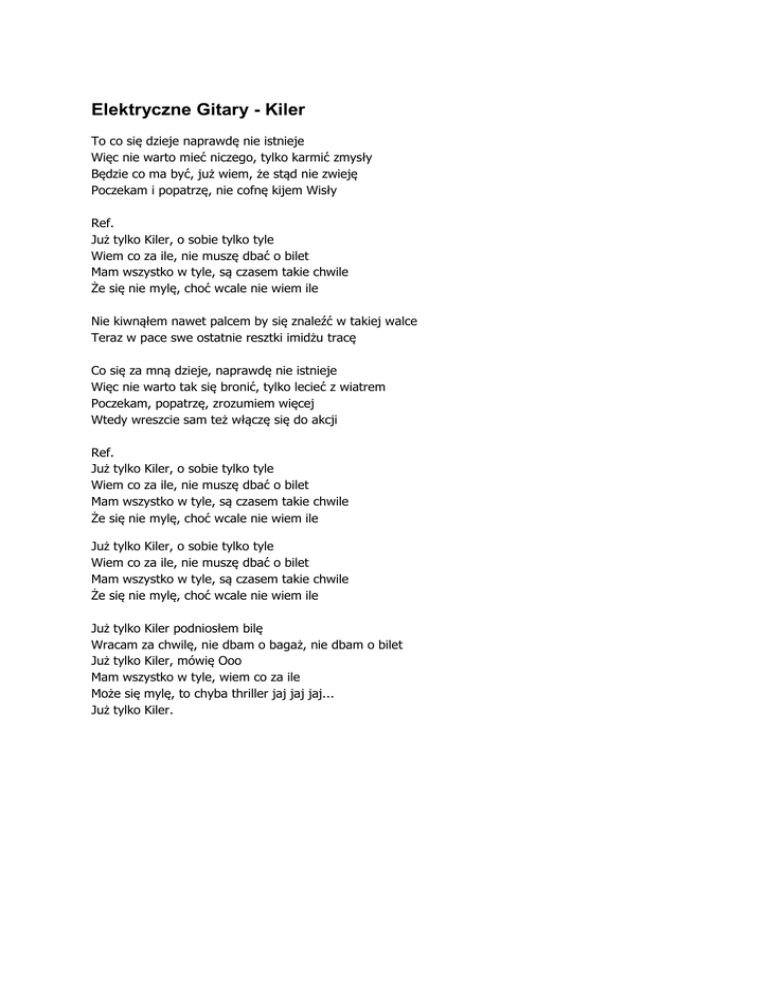 Elektryczne Gitary - Kiler To co się dzieje naprawdę nie istnieje Więc nie warto mieć niczego, tylko karmić zmysły Będzie co ma być, już wiem, że stąd nie zwieję Poczekam i popatrzę, nie cofnę kijem Wisły Ref. Już tylko Kiler, o sobie tylko tyle Wiem co za ile, nie muszę dbać o bilet Mam wszystko w tyle, są czasem takie chwile Że się nie mylę, choć wcale nie wiem ile Nie kiwnąłem nawet palcem by się znaleźć w takiej walce Teraz w pace swe ostatnie resztki imidżu tracę Co się za mną dzieje, naprawdę nie istnieje Więc nie warto tak się bronić, tylko lecieć z wiatrem Poczekam, popatrzę, zrozumiem więcej Wtedy wreszcie sam też włączę się do akcji Ref. Już tylko Kiler, o sobie tylko tyle Wiem co za ile, nie muszę dbać o bilet Mam wszystko w tyle, są czasem takie chwile Że się nie mylę, choć wcale nie wiem ile Już tylko Kiler, o sobie tylko tyle Wiem co za ile, nie muszę dbać o bilet Mam wszystko w tyle, są czasem takie chwile Że się nie mylę, choć wcale nie wiem ile Już tylko Kiler podniosłem bilę Wracam za chwilę, nie dbam o bagaż, nie dbam o bilet Już tylko Kiler, mówię Ooo Mam wszystko w tyle, wiem co za ile Może się mylę, to chyba thriller jaj jaj jaj... Już tylko Kiler.