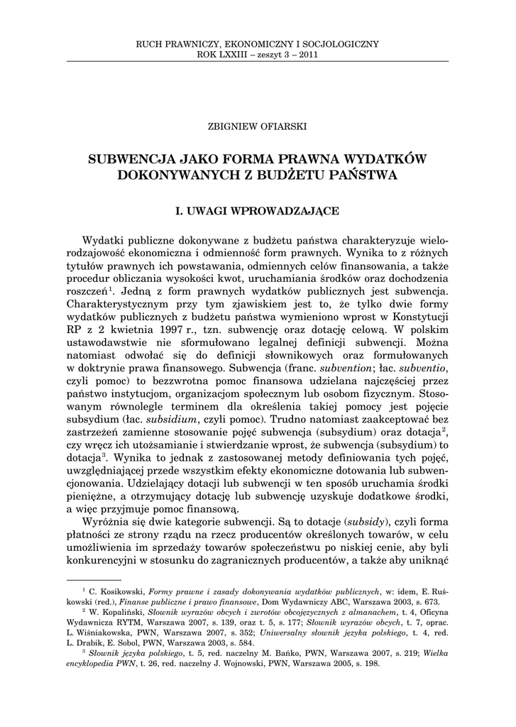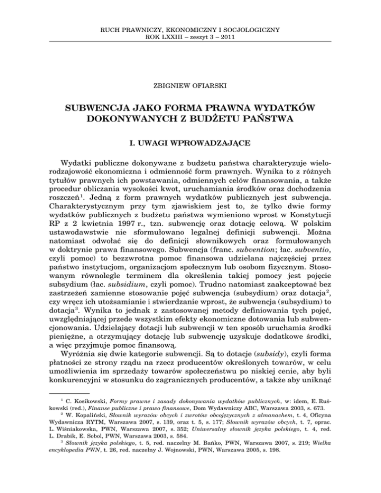 RUCH PRAWNICZY, EKONOMICZNY I SOCJOLOGICZNY ROK LXXIII – zeszyt 3 – 2011 ZBIGNIEW OFIARSKI Zbigniew Ofiarski SUBWENCJA JAKO FORMA PRAWNA WYDATKÓW DOKONYWANYCH Z BUDŻETU PAŃSTWA Subwencja jako forma prawna wydatków dokonywanych z budżetu państwa I. UWAGI WPROWADZAJA˛CE Wydatki publiczne dokonywane z budżetu państwa charakteryzuje wielorodzajowość ekonomiczna i odmienność form prawnych. Wynika to z różnych tytułów prawnych ich powstawania, odmiennych celów finansowania, a także procedur obliczania wysokości kwot, uruchamiania środków oraz dochodzenia roszczeń 1. Jedna˛ z form prawnych wydatków publicznych jest subwencja. Charakterystycznym przy tym zjawiskiem jest to, że tylko dwie formy wydatków publicznych z budżetu państwa wymieniono wprost w Konstytucji RP z 2 kwietnia 1997 r., tzn. subwencje˛ oraz dotacje˛ celowa˛. W polskim ustawodawstwie nie sformułowano legalnej definicji subwencji. Można natomiast odwołać sie˛ do definicji słownikowych oraz formułowanych w doktrynie prawa finansowego. Subwencja (franc. subvention; łac. subventio, czyli pomoc) to bezzwrotna pomoc finansowa udzielana najcze˛ściej przez państwo instytucjom, organizacjom społecznym lub osobom fizycznym. Stosowanym równolegle terminem dla określenia takiej pomocy jest poje˛cie subsydium (łac. subsidium, czyli pomoc). Trudno natomiast zaakceptować bez zastrzeżeń zamienne stosowanie poje˛ć subwencja (subsydium) oraz dotacja 2, czy wre˛cz ich utożsamianie i stwierdzanie wprost, że subwencja (subsydium) to dotacja 3. Wynika to jednak z zastosowanej metody definiowania tych poje˛ć, uwzgle˛dniaja˛cej przede wszystkim efekty ekonomiczne dotowania lub subwencjonowania. Udzielaja˛cy dotacji lub subwencji w ten sposób uruchamia środki pienie˛żne, a otrzymuja˛cy dotacje˛ lub subwencje˛ uzyskuje dodatkowe środki, a wie˛c przyjmuje pomoc finansowa˛. Wyróżnia sie˛ dwie kategorie subwencji. Sa˛ to dotacje (subsidy), czyli forma płatności ze strony rza˛du na rzecz producentów określonych towarów, w celu umożliwienia im sprzedaży towarów społeczeństwu po niskiej cenie, aby byli konkurencyjni w stosunku do zagranicznych producentów, a także aby unikna˛ć 1 C. Kosikowski, Formy prawne i zasady dokonywania wydatków publicznych, w: idem, E. Ruśkowski (red.), Finanse publiczne i prawo finansowe, Dom Wydawniczy ABC, Warszawa 2003, s. 673. 2 W. Kopaliński, Słownik wyrazów obcych i zwrotów obcoje˛ zycznych z almanachem, t. 4, Oficyna Wydawnicza RYTM, Warszawa 2007, s. 139, oraz t. 5, s. 177; Słownik wyrazów obcych, t. 7, oprac. L. Wiśniakowska, PWN, Warszawa 2007, s. 352; Uniwersalny słownik je˛ zyka polskiego, t. 4, red. L. Drabik, E. Sobol, PWN, Warszawa 2003, s. 584. 3 Słownik je˛ zyka polskiego, t. 5, red. naczelny M. Bańko, PWN, Warszawa 2007, s. 219; Wielka encyklopedia PWN, t. 26, red. naczelny J. Wojnowski, PWN, Warszawa 2005, s. 198. 94 Zbigniew Ofiarski redukcji zatrudnienia oraz wzrostu liczby bezrobotnych. Generalnie zniekształcaja˛ one konkurencje˛ na rynku. Odmienna˛ kategoria˛ sa˛ subwencje (grant-in-aid), czyli dowolna dotacja rza˛dowa dla władz komunalnych na świadczenie określonych usług, która jednak nie dotyczy pomocy podatkowej 4. Subwencja (subsydium) to także szczególny rodzaj dotacji udzielanej przeważnie z budżetu lub funduszu pozabudżetowego jednostkom niepaństwowym, na przykład organizacjom społecznym wykonuja˛cym działalność popierana˛ przez państwo 5. Uwzgle˛dniaja˛c aktualny stan polskiego ustawodawstwa reguluja˛cego funkcjonowanie sektora finansów publicznych, należy podkreślić, że w aspekcie prawnym subwencja oraz dotacja to dwie odre˛bne instytucje prawne, wywołuja˛ce wprawdzie podobne skutki finansowe po stronie podmiotu udzielaja˛cego oraz podmiotu otrzymuja˛cego pomoc pienie˛żna˛ w tych formach, ale procedury ich uruchomienia, wykorzystywania oraz rozliczania sa˛ odmienne i inne sa˛ skutki prawne – w tym odpowiedzialność – w razie naruszenia tych procedur. Definicje uwzgle˛dniaja˛ce ła˛cznie kryteria ekonomiczne i prawne wyraźnie rozróżniaja˛ subwencje (subsydia) i dotacje. Wskazuje sie˛, że subwencja (traktowana jako pomoc, zapomoga, zasiłek pienie˛żny, a nawet jednorazowa zapomoga) jest forma˛ redystrybucji środków publicznych, świadczeniem publicznoprawnym państwa na rzecz innych podmiotów. Subwencja stanowi forme˛ wydatku z budżetu państwa i – w odróżnieniu od dotacji – nie jest skierowana na ściśle określone cele 6. Pełni ona jednocześnie dwie istotne funkcje – jest forma˛ wydatku z budżetu państwa i źródłem dochodu budżetu jednostki samorza˛du terytorialnego (j.s.t.) 7. Dotacje również sa˛ forma˛ dokonywania wydatków z budżetu (państwa lub j.s.t.) na rzecz osób trzecich, w trybie władczym, ale podlegaja˛ szczególnym zasadom rozliczania 8. W doktrynalnym uje˛ciu subwencji dominuje metoda polegaja˛ca na wyliczaniu cech charakteryzuja˛cych taka˛ forme˛ dokonywania wydatków budżetowych 9. Wskazuje sie˛, że subwencja jest pienie˛żnym, właściwym, bezzwrotnym, nienabywczym i nieosobowym wydatkiem zwia˛zku publicznoprawnego w celu zasilenia podmiotu otrzymuja˛cego środki w tej formie 10. W zwia˛zku z pełnieniem funkcji zasilaja˛cej subwencje sa˛ charakterystyczne dla systemu budżetowego 11. Sa˛ świadczeniami publicznoprawnymi państwa na rzecz innych podmiotów publicznoprawnych (dotacje˛ może także otrzymać podmiot inny niż publicznoprawny) i stanowia˛ odzwierciedlenie ustrojowego podziału zadań publicznych mie˛dzy państwem i samorza˛dem 4 Słownik finansów i bankowości, red. R. Malczewski, PWN, Warszawa 2008, s. 400. H. Sochacka-Krysiak, Subwencja, w: Leksykon finansowo-bankowy, PWE, Warszawa 1991, s. 432. 6 M. Wróblewska, Subwencja, w: Leksykon prawa finansowego. 100 podstawowych poje˛ ć, red. A. Drwiłło, D. Maśniak, C. H. Beck, Warszawa 2009, s. 436. 7 A. H