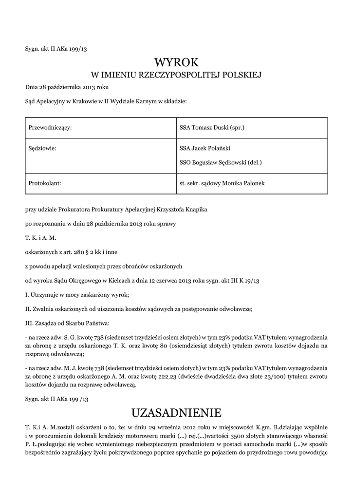 Sygn. akt II AKa 199/13 WYROK W IMIENIU RZECZYPOSPOLITEJ POLSKIEJ Dnia 28 października 2013 roku Sąd Apelacyjny w Krakowie w II Wydziale Karnym w składzie: Przewodniczący: SSA Tomasz Duski (spr.) Sędziowie: SSA Jacek Polański SSO Bogusław Sędkowski (del.) Protokolant: st. sekr. sądowy Monika Palonek przy udziale Prokuratora Prokuratury Apelacyjnej Krzysztofa Knapika po rozpoznaniu w dniu 28 października 2013 roku sprawy T. K. i A. M. oskarżonych z art. 280 § 2 kk i inne z powodu apelacji wniesionych przez obrońców oskarżonych od wyroku Sądu Okręgowego w Kielcach z dnia 12 czerwca 2013 roku sygn. akt III K 19/13 I. Utrzymuje w mocy zaskarżony wyrok; II. Zwalnia oskarżonych od uiszczenia kosztów sądowych za postępowanie odwoławcze; III. Zasądza od Skarbu Państwa: - na rzecz adw. S. G. kwotę 738 (siedemset trzydzieści osiem złotych) w tym 23% podatku VAT tytułem wynagrodzenia za obronę z urzędu oskarżonego T. K. oraz kwotę 80 (osiemdziesiąt złotych) tytułem zwrotu kosztów dojazdu na rozprawę odwoławczą; - na rzecz adw. M. J. kwotę 738 (siedemset trzydzieści osiem złotych) w tym 23% podatku VAT tytułem wynagrodzenia za obronę z urzędu oskarżonego A. M. oraz kwotę 222,23 (dwieście dwadzieścia dwa złote 23/100) tytułem zwrotu kosztów dojazdu na rozprawę odwoławczą. Sygn. akt II AKa 199 /13 UZASADNIENIE T. K.i A. M.zostali oskarżeni o to, że: w dniu 29 września 2012 roku w miejscowości K.gm. B.działając wspólnie i w porozumieniu dokonali kradzieży motoroweru marki (...) rej.(...)wartości 3500 złotych stanowiącego własność P. Ł.posługując się wobec wymienionego niebezpiecznym przedmiotem w postaci samochodu marki (...)w sposób bezpośrednio zagrażający życiu pokrzywdzonego poprzez spychanie go pojazdem do przydrożnego rowu powodując jego upadek i powstanie obrażeń ciała w postaci ogólnego potłuczenia ciała oraz utraty przytomności, które naruszyły prawidłowe funkcjonowanie narządów jego ciała na czas trwający nie dłużej niż siedem dni – tj. jest o przestępstwo z art. 280§ 2 kk w stosunku do T. K.i o przestępstwo z art. 280§ 2 kk i art. 157§ 2 kk w zw. z art. 11§ 2 kk w stosunku do A. M.. Sąd Okręgowy w Kielcach wyrokiem z dnia 12 czerwca 2013 r. (sygn. III K 19/13) orzekając w zakresie czynu zarzuconego w akcie oskarżenia uznał oskarżonych T. K.i A. M.za winnych tego, że: w dniu 29 września 2012 roku w miejscowości K.gmina B.działając wspólnie i w porozumieniu ze sobą, grożąc natychmiastowym użyciem przemocy wobec P. Ł.poprzez uderzenie samochodem marki (...)w poruszającego się motorowerem pokrzywdzonego, próbę zepchnięcia go ręką z motoroweru i zajechanie mu drogi samochodem spowodowali, że zjechał on do przydrożnego rowu i tam spadł z motoroweru, a następnie zabrali w celu przywłaszczenia motorower marki (...)rej. (...)wartości 3500 złotych na szkodę P. Ł.- tj. przestępstwa z art. 280§ 1 kk i na podstawie art. 280§ 1 kk wymierzył każdemu z oskarżonych karę dwóch lat i sześciu miesięcy pozbawienia wolności, a na podstawie art. 33 § 1 i 3 kk wymierzył każdemu z oskarżonych karę grzywny w wysokości 100 stawek dziennych przy ustaleniu jednej stawki na kwotę 20 zł. Sąd ten: na podstawie art. 63 § 1 kk na poczet wymierzonych oskarżonym kar pozbawienia wolności zaliczył okresy rzeczywistego pozbawienia wolności w sprawie: - A. M. okres od dnia 12 listopada 2012 roku do dnia 12 czerwca 2013 roku; - T. K. okres od dnia 11 listopada 2012 roku do dnia 12 czerwca 2013 roku; na podstawie art. 46 § 1 kk orzekł wobec oskarżonych A. M. i T. K. środek karny w postaci obowiązku naprawienia szkody wyrządzonej przestępstwem poprzez zapłatę solidarnie na rzecz pokrzywdzonego P. Ł. kwoty 3500 złotych; Ponadto Sąd zasądził od Skarbu Państwa na rzecz adw. M. J. kwotę 1549,80 zł z tytułu nieopłaconej pomocy prawnej udzielonej oskarżonemu A. M. z urzędu, a na rzecz adw. S. G. kwotę 1180,80 zł z tytułu nieopłaconej pomocy prawnej udzielonej oskarżonemu T. K. z urzędu oraz na podstawie art. 624 § 1 kpk zwolnił oskarżonych A. M. i T. K. w całości od ponoszenia kosztów sądowych, którymi obciążył Skarb Państwa. Wyrok został zaskarżony apelacjami obrońców. Obrońca oskarżonego T. K. zarzucił: - obrazę przepisów prawa materialnego poprzez błędne przyjęcie, że zachowanie oskarżonego T. K. w ustalonym przez Sąd stanie faktycznym wyczerpuje znamiona przestępstwa rozboju z art. 280§ 1 kk, w sytuacji gdy zawarte w wyroku w opisie czynu sposoby zachowania się oskarżonych w postaci uderzenia samochodem kierowanym przez A. M. w pokrzywdzonego poruszającego się motorowerem, próby zepchnięcia go ręką czy zajechanie pokrzywdzonemu drogi samochodem nie mogą być uznane za groźbę natychmiastowego użycia przemocy w rozumieniu przepisu art. 280§ 1 kk, w sytuacji gdy takiemu zachowaniu oskarżonych A. M. i T. K. nie towarzyszyło wypowiadanie przez nich jakichkolwiek gróźb pod adresem pokrzywdzonego, jak również wobec braku jakichkolwiek dowodów na to, aby zachowanie takie sami oskarżeni traktowali jako formę groźby użycia przemocy pod adresem pokrzywdzonego i aby taki sposób działania oskarżonych pokrzywdzony P. Ł. odebrał w chwili zdarzenia jako groźbę użycia przemocy, zmierzającą do zaboru motoroweru stanowiącego jego własność; - z ostrożności rażącą niewspółmierność wymierzonej oskarżonemu T. K. kary grzywny oraz bezwzględnego pozbawienia wolności w wymiarze 2 lat i 6 miesięcy w świetle dyrektyw i zasad wymiaru kary, w szczególności wobec faktu, iż oskarżony T. K. jest osobą bardzo młodą, wyraził szczerą skruchę i przeprosił pokrzywdzonego, nie osiągnął jakiejkolwiek korzyści majątkowej w wyniku czynu, jego rola była marginalna oraz działał wyraźnie pod wpływem starszego współoskarżonego A. M.. Wniósł o zmianę wyroku poprzez przyjęcie, iż zachow