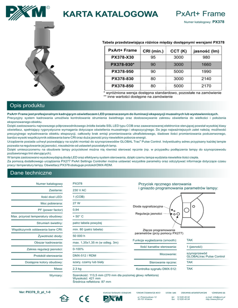 R PxArt+ Frame KARTA KATALOGOWA Numer katalogowy: PX378 Tabela przedstawiająca różnice między dostępnymi wersjami PX378 PxArt+ Frame CRI (min.) CCT (K) jasność (lm) PX378-X30 95 3000 980 PX378-930* 90 3000 1660 PX378-950 90 5000 1990 PX378-830 80 3000 2140 PX378-850 80 5000 2170 * wyróżniona wersja dostępna standardowo, pozostałe na zamówienie ** inne wartości dostępne na zamówienie Opis produktu PxArt+ Frame jest profesjonalnym kadrującym oświetlaczem LED przeznaczonym do iluminacji ekspozycji muzealnych lub wystawienniczych. Precyzyjny system kadrowania umożliwia kontrolowanie strumienia świetlnego oraz dostosowywanie zakresu oświetlenia do wielkości i położenia eksponowanego obiektu. Dzięki zastosowaniu najnowszego półprzewodnikowego źródła światła SSL LED typu COB oraz zaawansowanej elektronice sterującej powstał wysokiej klasy oświetlacz, spełniający rygorystyczne wymagania dotyczące oświetlenia muzealnego i ekspozycyjnego. Do jego najważniejszych zalet należą: możliwość precyzyjnego wykadrowania obiektu ekspozycji, całkowity brak emisji promieniowania ultrafioletowego, śladowe ilości promieniowania podczerwonego, bardzo wysoki współczynnik oddawania barw CRI oraz duża jasność przy niewielkim poborze energii. Urządzenie posiada uchwyt pozwalający na szybki montaż do szynoprzewodów GLOBAL Trac® Pulse Control. Indywidualny adres przypisany każdej lampie pozwala na regulowanie jej jasności, niezależnie od ustawień pozostałych lamp. Dzięki umieszczonemu na obudowie lampy przyciskowi można nią również sterować ręcznie (np. w przypadku podłączenia lampy do szynoprzewodu pozbawionego linii sterujących). W lampie zastosowano wysokowydajną diodę LED oraz efektywny system sterowania, dzięki czemu lampa wydziela niewielkie ilości ciepła. Za pomocą dodatkowego urządzenia PX277 PxArt Settings Controller można ustawiać wszystkie parametry oraz odczytywać informacje dotyczące czasu pracy i temperatury lampy. Oświetlacz PX378 obsługuje protokół DMX-RDM. Dane techniczne Numer katalogowy Zasilanie: PX378 Przycisk ręcznego sterowania i gniazdo programowania parametrów lampy: 230 V AC Ilość diod LED: 1 (COB) Moc pobierana: 27 W Dioda sygnalizacyjna PF (power factor) Max. przyrost temperatury obudowy: Strumień świetlny: Współczynnik oddawania barw CRI: Żywotność diody: Obszar kadrowania: Zakres regulacji jasności: Protokół sterowania: Dostępne kolory obudowy: Masa: Wymiary: Ver: PX378_D_pl_1-0 0,94 Regulacja jasności + 50° C patrz tabela powyżej min. 80 (patrz tabela) Złącze programowania parametrów (przy pomocy PX277) 50 000 h max. 1,35x1,35 m (w odleg. 3m) Funkcja wygładzania (smooth): Ilość kanałów sterowania: 0-100% Mocowanie: DMX-512 / RDM szary, czarny lub biały 2,3 kg TAK 1 (jasność) szynoprzewód GLOBALtrac Pulse Control Sterowanie ręczne: TAK Kontrolka sygnału DMX-512: TAK Szerokość: 113,5 mm (270 mm dla poziomej głowy reflektora) Wysokość: 421 mm Średnica reflektora: 87 mm Konsole teatralne i estradowE Cyfrowe ściemniacze mocy ul. Przemysłowa 12 30-701 Kraków SYSTEM dmx Sterowniki ARCHITEKTONICZNE tel: 12 626 46 92 fax: 12 626 46 94 OŚWIETLENIE LED e-mail: [email protected] http://www.pxm.pl R PX 378 Rysunek techniczny Schemat podłączenia 1 2 61 3 DMX+ GND DMX- 5 szynoprzewód 3-fazowy GLOBAL Trac® Pulse Control 2 końcówka zasilająca 3 przewód zasilania 4 przewód DMX (2 żyły w ekranie) 5 adapter GLOBALtrac GAC600 Ø 87 421 321,4 113,5 266 4 1 155 270 Wymiary w milimetrach Obszar kadrowania lampy Parametry świetlne: 280 lx 135x135 cm 510 lx 3m 95x95 cm 2350 lx 1m 2m 48x48 cm Konsole teatralne i estradowE Cyfrowe ściemniacze mocy ul. Przemysłowa 12 30-701 Kraków SYSTEM dmx Sterowniki ARCHITEKTONICZNE tel: 12 626 46 92 fax: 12 626 46 94 OŚWIETLENIE LED e-mail: [email protected] http://www.pxm.pl