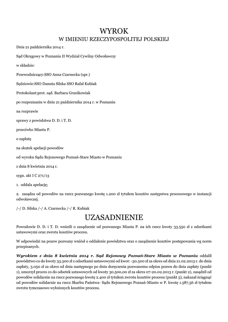 WYROK W IMIENIU RZECZYPOSPOLITEJ POLSKIEJ Dnia 21 października 2014 r. Sąd Okręgowy w Poznaniu II Wydział Cywilny Odwoławczy w składzie: Przewodniczący:SSO Anna Czarnecka (spr.) Sędziowie:SSO Danuta Silska SSO Rafał Kubiak Protokolant:prot. sąd. Barbara Grześkowiak po rozpoznaniu w dniu 21 października 2014 r. w Poznaniu na rozprawie sprawy z powództwa D. D. i T. D. przeciwko Miastu P. o zapłatę na skutek apelacji powodów od wyroku Sądu Rejonowego Poznań-Stare Miasto w Poznaniu z dnia 8 kwietnia 2014 r. sygn. akt I C 271/13 1. oddala apelację; 2. zasądza od powodów na rzecz pozwanego kwotę 1.200 zł tytułem kosztów zastępstwa procesowego w instancji odwoławczej. /-/ D. Silska /-/ A. Czarnecka /-/ R. Kubiak UZASADNIENIE Powodowie D. D. i T. D. wnieśli o zasądzenie od pozwanego Miasta P. na ich rzecz kwoty 33.550 zł z odsetkami ustawowymi oraz zwrotu kosztów procesu. W odpowiedzi na pozew pozwany wniósł o oddalenie powództwa oraz o zasądzenie kosztów postępowania wg norm przepisanych. Wyrokiem z dnia 8 kwietnia 2014 r. Sąd Rejonowy Poznań-Stare Miasto w Poznaniu oddalił powództwo co do kwoty 33.500 zł z odsetkami ustawowymi od kwot: -30.500 zł za okres od dnia 21.02.2013 r. do dnia zapłaty, 3.050 zł za okres od dnia następnego po dniu doręczenia pozwanemu odpisu pozwu do dnia zapłaty (punkt 1), umorzył proces co do odsetek ustawowych od kwoty 30.500,00 zł za okres 07-20.02.2013 r. (punkt 2), zasądził od powodów solidarnie na rzecz pozwanego kwotę 2.400 zł tytułem zwrotu kosztów procesu (punkt 3), nakazał ściągnąć od powodów solidarnie na rzecz Skarbu Państwa- Sądu Rejonowego Poznań-Miasto w P. kwotę 1.587,56 zł tytułem zwrotu tymczasowo wyłożonych kosztów procesu. Powyższe rozstrzygnięcie zapadło w oparciu o następujące ustalenia faktyczne i rozważania prawne: M.in. w okresie 01.04.2012-28.02.2013 r. powodowie byli współwłaścicielami nieruchomości zabudowanej położonej przy ul. (...) w P.. Wyrokiem z 31.12.2009 r., w sprawie(...), Sąd Rejonowy Poznań-Stare Miasto w P. orzekł eksmisję C. C. (1), T. C., Z. C., E. C. (1), A. C. (2), J. C., T. S., małoletnich M. C., S. C. i E. C. (2) z lokalu nr (...) położonego na w/w nieruchomości. Orzekł o uprawnieniu J. C. i C. C. (1) solidarnie, T. C., A. C. (2), małoletniego M. C. solidarnie, T. S., małoletnich S. C. i E. C. (2) solidarnie do lokalu socjalnego i nakazał wstrzymać wykonanie eksmisji wobec tych osób do czasu złożenia im przez pozwanego oferty najmu lokalu socjalnego. W okresie od 01.04.2012 do 28.02.2013 r.: J. C., C. C. (1), T. C., A. C. (2), M. C., T. S., S. C. i E. C. (2) nadal mieszkali w w/w lokalu i z tego tytułu nie zapłacili żadnej kwoty. W okresie 01.04.2012 do 28.02.2013 r. lokal był zdewastowany (były rozebrane piece, wszystko było poniszczone, drzwi, sanitariaty). Powodowie mieli wolę wynajęcia lokalu. W w/w stanie w/w lokal nie zostałby wynajęty, także na zasadzie zwolnienia najemcy z zapłaty czynszu za pewien okres w zamian za sfinansowanie przez tego najemcę remontu lokalu. Gdyby w okresie 01.04.2012-28.02.2013 r. w/w lokal nie był zdewastowany, ale nadawał się do zamieszkania, choć wymagał prac remontowych i modernizacyjnych (standard pogorszony) zostałby wynajęty na wolnym rynku za zapłatą czynszu najmu w łącznej kwocie 21.750 zł (po 1977,26 zł miesięcznie). Sąd Rejonowy stwierdzil, że powyższy stan faktyczny ustalił na podstawie zgromadzonych dokumentów, których autentyczność nie była kwestionowana. Sąd dał wiarę zeznaniom świadka, gdyż są one logiczne, zgodne z wiedzą i doświadczeniem życiowym, dowodami z dokumentów oraz zeznaniami powoda. W w/w zakresie sąd dał wiarę zeznaniom powoda, gdyż w tym zakresie są one logiczne, zgodne z wiedzą i doświadczeniem życiowym, dowodami z dokumentów oraz zeznaniami świadka. Sąd wskazał, że podczas uzupełniającego przesłuchania powód zeznał, że zeznając pierwotnie o dewastacji lokalu miał na uwadze samowolne zrobienie kotłowni i wyprowadzenie spalin wywietrznikiem, co skutkowało popękaniem kominów. W lokalu był bałagan i niechlujstwo, co powód odebrał jako dewastację (k. 193-194). W świetle zdjęć kotłowni urządzonej w lokalu (k. 77, 86v akt (...)), pisma do C. C. z 20.06.2012 r., którym podniesiono, że zawiadomienie o uzasadnionym podejrzeniu popełnienia przestępstwa obejmuje zniszczenie mienia polegającego na trwałej i istotnej deprecjacji substancji budowlanej w rozumieniu art. 288 § 1 kk (k. 82-83 akt (...)) oraz uzupełniających zeznań powoda, zgodnie z którymi byli lokatorzy niszczyli klatkę schodową (ryli napisy w tynku), lokal nie był zdewastowany, nie podważają wiarygodności pierwotnych zeznań. Przy czym zgodnie z zeznaniami powoda zdjęcia złożone podczas rozprawy w dniu 01.04.2014 r. zostały wykonane w 2013 nie pamiętał dokładnie kiedy (k. 194), co nie wyklucza możliwości ich wykonania znacznie po okresie objętym żądaniem pozwu, tj. po 28.02.2013 r. Sąd dał wiarę opinii biegłego, zgodnie z którą przy założeniu pogorszonego standardu lokalu, lokal ten zostałby w okresie objętym żądaniem pozwu wynajęty za zapłatą czynszu najmu w łącznej wysokości 21.750 zł, gdyż przyjęta przez biegłego metoda nie budzi wątpliwości, a wnioski logiczne i zgodnie z zasadami doświadczenia wynikają z ustalonych przesłanek. Sąd dał wiarę biegłemu także co do nie występowania na rynku najmu powierzchni mieszkalnych umów, zgodnie z którymi najemca wykonuje remont lokalu za zwolnieniem z zapłaty czynszu najmu za pewien okres. Sąd Rejonowy zważył, że jeżeli gmina nie dostarczyła lokalu socjalnego osobie uprawnionej do niego z mocy wyroku, właścicielowi przysługuje roszczenie odszkodowawcze do gminy, na podstawie art. 417 kc (art. 18 ustawy o ochronie praw lokatorów). Za szkodę zaś wyrządzoną przez niezgodne z prawem działanie lub zaniechanie przy wy