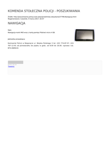 KOMENDA STOŁECZNA POLICJI - POSZUKIWANIA Źródło: http://poszukiwania.policja.waw.pl/pz/przedmioty-odzyskane/27799,Nawigacja.html Wygenerowano: Czwartek, 9 marca 2017, 02:57 NAWIGACJA Opis: Nawigacja marki MIO wraz z kartą pamięci Platinet micro 4 GB. Jednostka prowadząca: Komisariat Policji w Nieporęcie ul. Wojska Polskiego 3 tel. (22) 774-87-57, (22) 767-12-91 od poniedziałku do piątku w godz. od 8.00 do 16.00. (sprawa l.dz. KP-II-2829/13) Ocena: 0/5 (0) Tweetnij