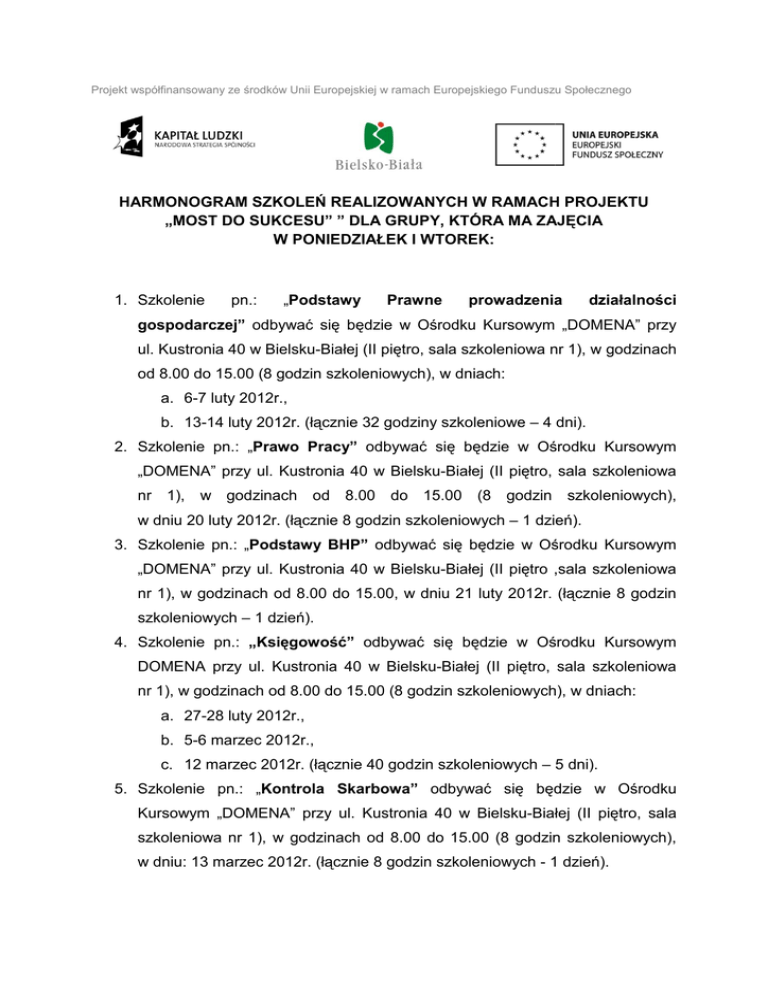 Projekt współfinansowany ze środków rodków Unii Europejskiej w ramach Europejskiego Funduszu Społecznego HARMONOGRAM SZKOLEŃ SZKOLE REALIZOWANYCH W RAMACH PROJEKTU „MOST DO SUKCESU” ” DLA GRUPY, KTÓRA MA ZAJĘCIA ZAJ W PONIEDZIAŁEK I WTOREK: 1. Szkolenie pn.: „Podstawy Podstawy Prawne prowadzenia działalno działalności gospodarczej” odbywać odbywa się będzie w Ośrodku rodku Kursowym „DOMENA” przy ul. Kustronia 40 w Bielsku-Białej Bielsku (II piętro, tro, sala szkoleniowa nr 1), 1) w godzinach od 8.00 do 15.00 (8 godzin szkoleniowych), w dniach: a. 6-7 luty 2012r., 2012r. b. 13-14 luty 2012r. (łącznie ( 32 godziny szkoleniowe – 4 dni). 2. Szkolenie pn.: „Prawo Prawo Pracy” Pracy odbywać się będzie w Ośrodku środku Kursowym „DOMENA” przy ul.. Kustronia 40 w Bielsku-Białej (II piętro, tro, sala szkoleniowa nr 1),, w godzinach od 8.00 do 15.00 (8 godzin szkoleniowych), w dniu 20 luty 2012r. (łącznie 8 godzin szkoleniowych – 1 dzień). dzień 3. Szkolenie pn.: „Podstawy Podstawy BHP” BHP odbywać się będzie w Ośśrodku Kursowym „DOMENA” przy ul. Kustronia 40 w Bielsku-Białej (II piętro tro ,sala szkoleniowa nr 1), w godzinach od 8.00 do 15.00, w dniu 21 luty 2012r. (łącznie (ł 8 godzin szkoleniowych – 1 dzień). dzie 4. Szkolenie pn.: „Księ Księgowość” odbywać się będzie w Ośrodku środku Kursowym Kursow DOMENA przy ul. Kustronia 40 w Bielsku-Białej (II piętro, tro, sala szkoleniowa nr 1),, w godzinach od 8.00 8 do 15.00 (8 godzin szkoleniowych), szkoleniowych w dniach: a. 27-28 luty 2012r., b. 5-6 marzec 2012r., 2012r. c. 12 marzec 2012r. (łącznie (ł 40 godzin szkoleniowych – 5 dni). 5. Szkolenie pn.: „Kontrola Kontrola Skarbowa” Skarbowa odbywać się będzie ędzie w Ośrodku Kursowym „DOMENA DOMENA” przy ul. Kustronia 40 w Bielsku-Białej Białej (II piętro, sala szkoleniowa nr 1),, w godzinach godzina od 8.00 do 15.00 (8 godzin szkoleniowych), w dniu: 13 marzec 2012r. (łącznie (ł 8 godzin szkoleniowych - 1 dzień). dzie 6. Szkolenie pn.: „Marketing i obsługa klienta” odbywać się będzie w Ośrodku Kursowym „DOMENA” przy ul. Kustronia 40 w Bielsku-Białej (II piętro, sala szkoleniowa nr 1), w godzinach od 8.00 do15.00 (8 godzin szkoleniowych), w dniach: a. 19-20 marzec 2012r., b. 26-27 marzec 2012r. (łącznie 32 godziny szkoleniowe – 4 dni). 7. Szkolenie pn.: „Podstawy Obsługi Komputera” odbywać się będzie w Ośrodku Kursowym „DOMENA” przy ul. Kustronia 40 w Bielsku-Białej (II piętro, sala szkoleniowa nr 1), w godzinach od 8.00 do 15.00 (8 godzin szkoleniowych), w dniach: a. 2-3 kwiecień 2012r., b. 10 kwiecień 2012r., c. 16 kwiecień 2012r. 8. Szkolenie pn.: „Biznes Plan” odbywać się będzie w Ośrodku Kursowym „DOMENA” przy ul. Kustronia 40 w Bielsku-Białej (II piętro, sala szkoleniowa nr 1), w godzinach od 8.00 do 15.00 (8 godzin szkoleniowych), w dniach: a. 17 kwiecień 2012r., b. 23-24 kwiecień 2012r., c. 30 kwiecień 2012r., d. 7 maj 2012r. (łącznie 40 godzin szkoleniowych – 5 dni).