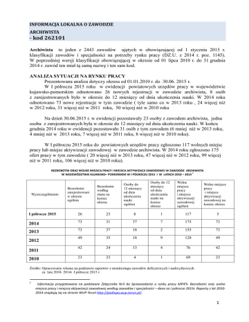 INFORMACJA LOKALNA O ZAWODZIE ARCHIWISTA - kod 262101 Archiwista to jeden z 2443 zawodów ujętych w obowiązującej od 1 stycznia 2015 r. klasyfikacji zawodów i specjalności na potrzeby rynku pracy (DZ.U. z 2014 r. poz. 1145). W poprzedniej wersji klasyfikacji obowiązującej w okresie od 01 lipca 2010 r. do 31 grudnia 2014 r. zawód ten miał tą samą nazwę i ten sam kod. ANALIZA SYTUACJI NA RYNKU PRACY Prezentowana analiza dotyczy okresu od 01.01.2010 r. do 30.06. 2015 r. W I półroczu 2015 roku w ewidencji powiatowych urzędów pracy w województwie kujawsko-pomorskim odnotowano 26 nowych rejestracji w zawodzie archiwista, 8 osób z zarejestrowanych było w okresie do 12 miesięcy od dnia ukończenia nauki. W 2014 roku odnotowano 73 nowe rejestracje w tym zawodzie ( tyle samo co w 2013 roku , 24 więcej niż w 2012 roku, 31 więcej niż w 2011 roku, 50 więcej niż w 2010 roku Na dzień 30.06.2015 r. w ewidencji pozostawały 23 osoby z zawodem archiwista, jedna osoba z zarejestrowanych była w okresie do 12 miesięcy od dnia ukończenia nauki. W końcu grudnia 2014 roku w ewidencji pozostawało 31 osób z tym zawodem (6 mniej niż w 2013 roku, 4 mniej niż w 2013 roku, 7 więcej niż w 2011 roku, 8 więcej niż w 2010 roku). W I półroczu 2015 roku do powiatowych urzędów pracy zgłoszono 117 wolnych miejsc pracy lub miejsc aktywizacji zawodowej w zawodzie archiwista. W 2014 roku zgłoszono 175 ofert pracy w tym zawodzie ( 20 więcej niż w 2013 roku, 47 więcej niż w 2012 roku, 99 więcej niż w 2011 roku, 106 więcej niż w 2010 roku). BEZROBOTNI ORAZ WOLNE MIEJSCA PRACY I MIEJSCA AKTYWIZACJI ZAWODOWEJ W ZAWODZIE ARCHIWISTA W WOJEWÓDZTWIE KUJAWSKO– POMORSKIM W I PÓŁROCZU 2015 I W LATACH 2010 – 2014 1 Wyszczególnienie Bezrobotni zarejestrowani w okresie ogółem Bezrobotni według stanu na koniec okresu Osoby do 12 miesięcy od dnia ukończenia nauki ogółem Osoby do 12 miesięcy od dnia ukończenia nauki na koniec okresu Wolne miejsca pracy i miejsca aktywizacji zawodowej ogółem Wolne miejsca pracy i miejsca aktywizacji zawodowej na koniec okresu I półrocze 2015 26 23 8 1 117 5 2014 73 31 37 7 175 73 2013 73 37 18 2 155 73 49 35 18 9 128 49 42 24 13 4 76 42 23 23 4 1 69 23 2012 2011 2010 Źródło: Opracowanie własne na podstawie raportów z monitoringu zawodów deficytowych i nadwyżkowych za lata 2010- 2014i I półrocze 2015 r 1 Informacja przygotowana na podstawie Załącznika Nr3 do Sprawozdania o rynku pracy MPiPS- Bezrobotni oraz wolne miejsca pracy i miejsca aktywizacji zawodowej według zawodów i specjalności – dane za I półrocze 2015r. Raporty z lat 20102014 znajdują się na stronie WUP Toruń http://podlupa.wup.torun.pl/. 1 W I półroczu 2015 r. zarejestrowało się 26 osób z zawodem archiwista natomiast pracodawcy zgłosili 117 wolnych miejsc pracy. Z uwagi na nową metodologię prowadzenia monitoringu zawodów deficytowych i nadwyżkowych , zawód archiwista w I półroczu 2015r. nie miał określonego statusu na rynku pracy. 2 W analizowanym okresie 2010 - 2014 zawód archiwista został sklasyfikowany jako zawód deficytowy tzn. taki, na który na rynku pracy istnieje większe zapotrzebowanie niż liczba osób poszukujących pracy w zawodzie 3 BEZROBOTNI Z ZAWODEM ARCHIWISTA WEDŁUG POWIATÓW ARCHIWISTA WYSZCZEGÓLNIENIE Województwo kujawsko-pomorskie Bydgoszcz grodzki Bydgoszcz ziemski Grudziądz grodzki Grudziądz ziemski Toruń grodzki Toruń ziemski Włocławek grodzki Włocławek ziemski Aleksandrów Kujawski Brodnica Chełmno Golub-Dobrzyń Inowrocław Lipno Mogilno Nakło nad Notecią Radziejów Rypin Sępólno Krajeńskie Świecie Tuchola Wąbrzeźno Żnin Bezrobotni nowozarejestrowani w I półroczu 2015r. Wolne miejsca pracy i miejsca aktywizacji zawodowejzgłoszone w I półroczu 2015r. Bezrobotni wg stanu w dniu 30.06.2015r. 26 117 23 1 0 1 0 3 6 2 3 2 0 0 2 3 0 0 0 2 1 0 0 0 0 0 3 0 16 8 2 26 6 5 3 0 3 5 6 0 15 2 0 0 0 0 0 4 13 1 0 0 0 5 1 2 7 0 1 0 1 2 0 0 0 0 1 0 1 0 0 1 Źródło: Opracowanie własne na podstawie raportów z monitoringu zawodów deficytowych i nadwyżkowych za I półrocze 2015 r. 2 Wyniki z monitoringu zawodów zawarte w „Informacji sygnalnej z monitoringu zawodów deficytowych w województwie kujawsko-pomorskim w I półroczu 2015r.” dostępne są na stronie internetowej http://podlupa.wup.torun.pl/biblioteka/raportywyniki/ . Metodologia prowadzenia monitoringu w 2015r. dostępna jest na stronie internetowej http://podlupa.wup.torun.pl/w zakładce Biblioteka/Materiały ze spotkań. 3 Podziału na zawody deficytowe, zrównoważone i nadwyżkowe dokonuje się na podstawie wskaźnika intensywności nadwyżki (deficytu) wyrażonego jako iloraz liczby zgłoszonych wolnych miejsc pracy i miejsc aktywizacji zawodowej w badanym okresie, w danym zawodzie i liczby zarejestrowanych bezrobotnych w badanym okresie, w danym zawodzie. Zawody deficytowe to takie, dla których wskaźnik przekracza wartość 1,1; zawody zrównoważone to te, dla których wartość wskaźnika mieści się w przedziale od 0,9 do 1,1; natomiast zawody nadwyżkowe to te, w których przypadku wskaźnik wynosi poniżej 0,9. W 2012 r. 79,0% wszystkich zawodów, którymi legitymowali się bezrobotni lub zgłoszono w nich wolne miejsca pracy i miejsca aktywizacji zawodowej zostały sklasyfikowane jako nadwyżkowe (w 2011 r. – 78,0%). Zawody deficytowe stanowiły 16,8% zawodów (w 2011 r. – 18,0%) a zrównoważone 5,0% (w 2011 r. – 4,0%). 2 WYNIKI BADAŃ PRACODAWCÓW W wynikach badań przeprowadzonych wśród pracodawców przez Wojewódzki Urząd Pracy w Toruniu w latach 2010-2014 nie ma informacji na temat planów zatrudnienia lub zwolnienia osób z zawodem archiwista.4 WYNIKI BADAŃ OFERT INTERNETOWYCH W badaniu internetowych ofert pracy realizowanym na zlecenie Wojewódzkiego Urzędu Pracy w Toruniu, obejmującym okres wrzesień-listopad 2014 oraz luty-kwiecień 2015 zawód archiwista nie wystąpił. 5 ANALIZA KSZTAŁCENIA W ZAWODZIE