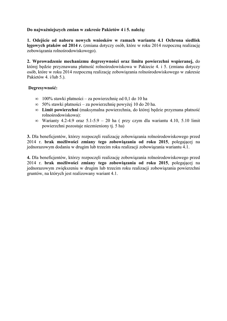 Do najważniejszych zmian w zakresie Pakietów 4 i 5. należą: 1. Odejście od naboru nowych wniosków w ramach wariantu 4.1 Ochrona siedlisk lęgowych ptaków od 2014 r. (zmiana dotyczy osób, które w roku 2014 rozpoczną realizację zobowiązania rolnośrodowiskowego). 2. Wprowadzenie mechanizmu degresywności oraz limitu powierzchni wspieranej, do której będzie przyznawana płatność rolnośrodowiskowa w Pakiecie 4. i 5. (zmiana dotyczy osób, które w roku 2014 rozpoczną realizację zobowiązania rolnośrodowiskowego w zakresie Pakietów 4. i/lub 5.). Degresywność: • • • • 100% stawki płatności – za powierzchnię od 0,1 do 10 ha 50% stawki płatności – za powierzchnię powyżej 10 do 20 ha. Limit powierzchni (maksymalna powierzchnia, do której będzie przyznana płatność rolnośrodowiskowa): Warianty 4.2-4.9 oraz 5.1-5.9 – 20 ha ( przy czym dla wariantu 4.10, 5.10 limit powierzchni pozostaje niezmieniony tj. 5 ha) 3. Dla beneficjentów, którzy rozpoczęli realizację zobowiązania rolnośrodowiskowego przed 2014 r. brak możliwości zmiany tego zobowiązania od roku 2015, polegającej na jednorazowym dodaniu w drugim lub trzecim roku realizacji zobowiązania wariantu 4.1. 4. Dla beneficjentów, którzy rozpoczęli realizację zobowiązania rolnośrodowiskowego przed 2014 r. brak możliwości zmiany tego zobowiązania od roku 2015, polegającej na jednorazowym zwiększeniu w drugim lub trzecim roku realizacji zobowiązania powierzchni gruntów, na których jest realizowany wariant 4.1.
