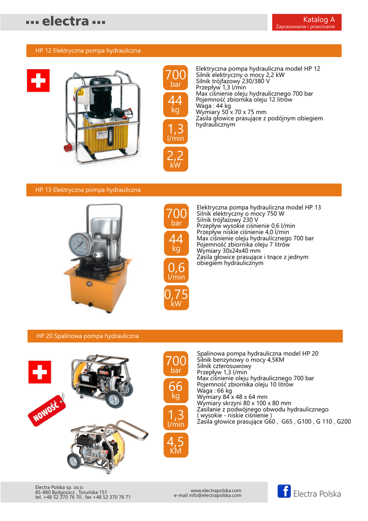 Katalog A Zaprasowanie i przecinanie HP 12 Elektryczna pompa hydrauliczna 700 bar 44 kg 1,3 Elektryczna pompa hydrauliczna model HP 12 Silnik elektryczny o mocy 2,2 kW Silnik trójfazowy 230/380 V Przepływ 1,3 l/min Max ciśnienie oleju hydraulicznego 700 bar Pojemność zbiornika oleju 12 litrów Waga : 44 kg Wymiary 50 x 70 x 75 mm Zasila głowice prasujące z podójnym obiegiem hydraulicznym l/min 2,2 kW HP 13 Elektryczna pompa hydrauliczna 700 bar 44 kg 0,6 Elektryczna pompa hydrauliczna model HP 13 Silnik elektryczny o mocy 750 W Silnik trójfazowy 230 V Przepływ wysokie ciśnienie 0,6 l/min Przepływ niskie ciśnienie 4,0 l/min Max ciśnienie oleju hydraulicznego 700 bar Pojemność zbiornika oleju 7 litrów Wymiary 30x24x40 mm Zasila głowice prasujące i tnące z jednym obiegiem hydraulicznym l/min 0,75 kW HP 20 Spalinowa pompa hydrauliczna 700 bar 66 kg 1,3 l/min Spalinowa pompa hydrauliczna model HP 20 Silnik benzynowy o mocy 4,5KM Silnik czterosuwowy Przepływ 1,3 l/min Max ciśnienie oleju hydraulicznego 700 bar Pojemność zbiornika oleju 10 litrów Waga : 66 kg Wymiary 84 x 48 x 64 mm Wymiary skrzyni 80 x 100 x 80 mm Zasilanie z podwójnego obwodu hydraulicznego ( wysokie - niskie ciśnienie ) Zasila głowice prasujące G60 , G65 , G100 , G 110 , G200 4,5 KM Electra Polska sp. zo.o. 85-880 Bydgoszcz , Toruńska 151 tel. +48 52 370 76 70 , fax +48 52 370 76 71 www.electrapolska.com e-mail [email protected] Electra Polska