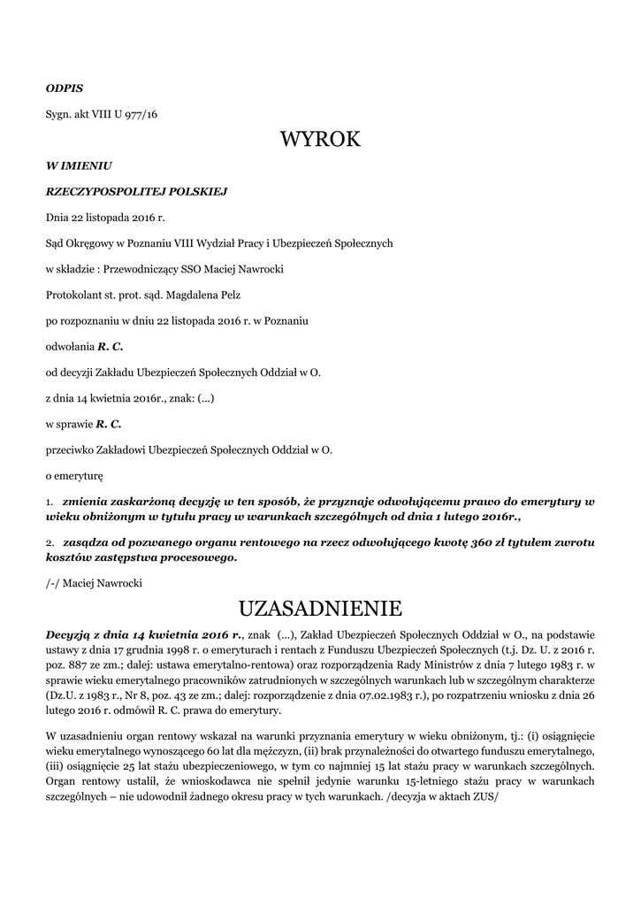 ODPIS Sygn. akt VIII U 977/16 WYROK W IMIENIU RZECZYPOSPOLITEJ POLSKIEJ Dnia 22 listopada 2016 r. Sąd Okręgowy w Poznaniu VIII Wydział Pracy i Ubezpieczeń Społecznych w składzie : Przewodniczący SSO Maciej Nawrocki Protokolant st. prot. sąd. Magdalena Pelz po rozpoznaniu w dniu 22 listopada 2016 r. w Poznaniu odwołania R. C. od decyzji Zakładu Ubezpieczeń Społecznych Oddział w O. z dnia 14 kwietnia 2016r., znak: (...) w sprawie R. C. przeciwko Zakładowi Ubezpieczeń Społecznych Oddział w O. o emeryturę 1. zmienia zaskarżoną decyzję w ten sposób, że przyznaje odwołującemu prawo do emerytury w wieku obniżonym w tytułu pracy w warunkach szczególnych od dnia 1 lutego 2016r., 2. zasądza od pozwanego organu rentowego na rzecz odwołującego kwotę 360 zł tytułem zwrotu kosztów zastępstwa procesowego. /-/ Maciej Nawrocki UZASADNIENIE Decyzją z dnia 14 kwietnia 2016 r., znak (...), Zakład Ubezpieczeń Społecznych Oddział w O., na podstawie ustawy z dnia 17 grudnia 1998 r. o emeryturach i rentach z Funduszu Ubezpieczeń Społecznych (t.j. Dz. U. z 2016 r. poz. 887 ze zm.; dalej: ustawa emerytalno-rentowa) oraz rozporządzenia Rady Ministrów z dnia 7 lutego 1983 r. w sprawie wieku emerytalnego pracowników zatrudnionych w szczególnych warunkach lub w szczególnym charakterze (Dz.U. z 1983 r., Nr 8, poz. 43 ze zm.; dalej: rozporządzenie z dnia 07.02.1983 r.), po rozpatrzeniu wniosku z dnia 26 lutego 2016 r. odmówił R. C. prawa do emerytury. W uzasadnieniu organ rentowy wskazał na warunki przyznania emerytury w wieku obniżonym, tj.: (i) osiągnięcie wieku emerytalnego wynoszącego 60 lat dla mężczyzn, (ii) brak przynależności do otwartego funduszu emerytalnego, (iii) osiągnięcie 25 lat stażu ubezpieczeniowego, w tym co najmniej 15 lat stażu pracy w warunkach szczególnych. Organ rentowy ustalił, że wnioskodawca nie spełnił jedynie warunku 15-letniego stażu pracy w warunkach szczególnych – nie udowodnił żadnego okresu pracy w tych warunkach. /decyzja w aktach ZUS/ R. C., w formie i terminie przewidzianym prawem, złożył odwołanie od powyższej decyzji. W uzasadnieniu wskazał na świadectwo pracy w warunkach szczególnych z dnia 31 grudnia 1994 r. wystawione przez (...) S.A. w L., w którym nie ma daty początkowej zatrudnienia w (...) Przedsiębiorstwie (...) w L., czyli u poprzednika prawnego (...) S.A. Na okoliczność okresu i charakteru swej pracy odwołujący powołał dowód z zeznań świadka A. K.. /odwołanie – k. 2-3 akt/ W odpowiedzi na odwołanie organ rentowy wniósł o jego oddalenie, przytaczając argumentację prawną i faktyczną zaprezentowaną w zaskarżonej decyzji. /odpowiedź na odwołanie – k. 6 akt/ W piśmie procesowym z dnia 13 lipca 2016 r., odwołujący działając przez profesjonalnego pełnomocnika podtrzymał, uporządkował i rozwinął wcześniejszą argumentację. Nadto wniósł o zasądzenie od pozwanego zwrotu kosztów procesu, w tym kosztów zastępstwa procesowego według norm przepisanych. /pismo procesowe – k. 12-21/ Sąd ustalił następujący stan faktyczny: R. C. urodził się dnia (...) Jest członkiem OFE, ale wniósł o przekazanie środków zgromadzonych na rachunku w OFE na dochody budżetu państwa. Odwołujący legitymuje się okresem ubezpieczenia wynoszącym na dzień 31 grudnia 1998 r. 27 lat + 6 m-cy + 18 dni okresów składkowych oraz 2 m-ce + 12 dni okresów nieskładkowych. Dnia 26 lutego 2016 r. odwołujący złożył wniosek o przyznanie prawa do emerytury przy wieku obniżonym z tytułu wykonywania pracy w warunkach szczególnych. Do wniosku załączył dokumenty obrazu przebieg jego zatrudnienia i ubezpieczenia, w tym w szczególności: (i) świadectwo pracy z dnia 01.06.1992 r., stwierdzające zatrudnienie odwołującego w okresie od dnia 06.02.1978 r. do dnia 31.05.1992 r. w (...) Przedsiębiorstwie (...) w L., na stanowisku kierowcy, (ii) świadectwo wykonywania prac w szczególnych warunkach z dnia 31.12.1994 r., stwierdzające, że w okresie zatrudnienia w (...) Przedsiębiorstwie (...) w L. do dnia 31.05.1992 r., a następnie w (...) S.A. w L. (następcy prawnym (...) Przedsiębiorstwa (...) w L.) w okresie od dnia 01.06.1992 r. do dnia 31.12.1994 r. odwołujący stale i w pełnym wymiarze godzin wykonywał pracę kierowcy na stanowisku kierowcy samochodu ciężarowego o dopuszczalnym ciężarze całkowitym powyżej 3,5 tony (dział VIII, poz. 2 pkt 1 wykazu B, stanowiącego załącznik nr 1 do Zarządzenia nr 55 Ministra Rolnictwa i Gospodarki Żywnościowej z dnia 14.07.1983 r. w sprawie prac wykonywanych w szczególnych warunkach) ( (...)) zaświadczenie o zatrudnieniu i wynagrodzeniu z dnia 20.03.2006 r., wystawione przez Agencję (...) S.A. w L. w likwidacji, stwierdzające, zatrudnienie odwołującego w (...) Przedsiębiorstwie (...) w L. w okresie od dnia 06.02.1978 r. do dnia 31.05.1992 r. oraz w (...) w L. w okresie od dnia 01.06.1992 r. do dnia 31.12.1994 r., na stanowisku kierowcy, przy czym stale i w pełnym wymiarze godzin wykonywał pracę kierowcy na stanowisku kierowcy samochodu ciężarowego o dopuszczalnym ciężarze całkowitym powyżej 3,5 tony (dział VIII, poz. 2 pkt 1 wykazu B, stanowiącego załącznik nr 1 do Zarządzenia nr 55 Ministra Rolnictwa i Gospodarki Żywnościowej z dnia 14.07.1983 r. w sprawie prac wykonywanych w szczególnych warunkach), (iv) świadectwo pracy z dnia 31.12.1994 r., stwierdzające zatrudnienie odwołującego w okresie od dnia 01.06.1992 r. do dnia 31.12.1994 r. w Przedsiębiorstwie Budownictwa (...) S.A. w L., w pełnym wymiarze godzin, na stanowisku kierowcy. W oparciu o przedłożone dokumenty, organ rentowy decyzją z dnia 14 kwietnia 2016 r. odmówił odwołującemu przyznania prawa do emerytury, ze względu na brak wymaganych 15 lat pracy w szczególnych warunkach. bezsporne; nadto dowód: dokumenty w aktach ZUS, w tym pismo odwołującego z dnia 01.04.2016 r. Dnia 20 kwietnia 1977 r. odwołujący uzyskał 