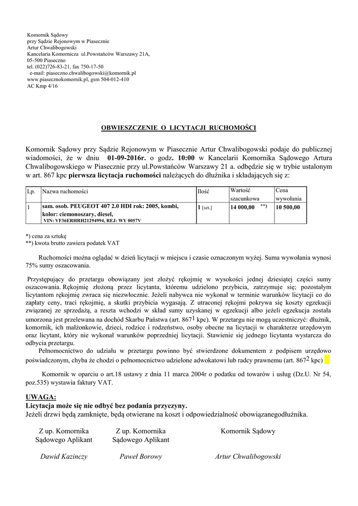 Komornik Sądowy przy Sądzie Rejonowym w Piasecznie Artur Chwalibogowski Kancelaria Komornicza ul.Powstańców Warszawy 21A, 05-500 Piaseczno tel. (022)726-83-21, fax 750-17-50 e-mail: [email protected] www.piasecznokomornik.pl, gsm 504-012-410 AC Kmp 4/16 OBWIESZCZENIE O LICYTACJI RUCHOMOŚCI Komornik Sądowy przy Sądzie Rejonowym w Piasecznie Artur Chwalibogowski podaje do publicznej wiadomości, że w dniu 01-09-2016r. o godz. 10:00 w Kancelarii Komornika Sądowego Artura Chwalibogowskiego w Piasecznie przy ul.Powstańców Warszawy 21 a. odbędzie się w trybie ustalonym w art. 867 kpc pierwsza licytacja ruchomości należących do dłużnika i składających się z: Lp. Nazwa ruchomości Ilość 1 sam. osob. PEUGEOT 407 2.0 HDI rok: 2005, kombi, kolor: ciemonoszary, diesel, 1 [szt.] Wartość szacunkowa 14 000,00 **) Cena wywołania 10 500,00 .VIN: VF36ERHRH21294994, REJ: WY 0057V *) cena za sztukę **) kwota brutto zawiera podatek VAT Ruchomości można oglądać w dzień licytacji w miejscu i czasie oznaczonym wyżej. Suma wywołania wynosi 75% sumy oszacowania. Przystępujący do przetargu obowiązany jest złożyć rękojmię w wysokości jednej dziesiątej części sumy oszacowania. Rękojmię złożoną przez licytanta, któremu udzielono przybicia, zatrzymuje się; pozostałym licytantom rękojmię zwraca się niezwłocznie. Jeżeli nabywca nie wykonał w terminie warunków licytacji co do zapłaty ceny, traci rękojmię, a skutki przybicia wygasają. Z utraconej rękojmi pokrywa się koszty egzekucji związanej ze sprzedażą, a reszta wchodzi w skład sumy uzyskanej w egzekucji albo jeżeli egzekucja została umorzona jest przelewana na dochód Skarbu Państwa (art. 8671 kpc). W przetargu nie mogą uczestniczyć: dłużnik, komornik, ich małżonkowie, dzieci, rodzice i rodzeństwo, osoby obecne na licytacji w charakterze urzędowym oraz licytant, który nie wykonał warunków poprzedniej licytacji. Stawienie się jednego licytanta wystarcza do odbycia przetargu. Pełnomocnictwo do udziału w przetargu powinno być stwierdzone dokumentem z podpisem urzędowo poświadczonym, chyba że chodzi o pełnomocnictwo udzielone adwokatowi lub radcy prawnemu (art. 8672 kpc) Komornik w oparciu o art.18 ustawy z dnia 11 marca 2004r o podatku od towarów i usług (Dz.U. Nr 54, poz.535) wystawia faktury VAT. UWAGA: Licytacja może się nie odbyć bez podania przyczyny. Jeżeli drzwi będą zamknięte, będą otwierane na koszt i odpowiedzialność obowiązanegodłużnika. Z up. Komornika Sądowego Aplikant Z up. Komornika Sądowego Aplikant Komornik Sądowy Dawid Kazinczy Paweł Borowy Artur Chwalibogowski