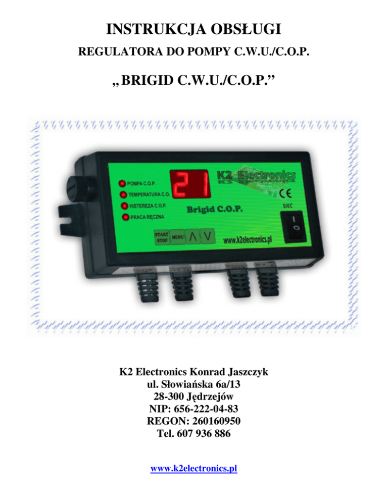 INSTRUKCJA OBSŁUGI REGULATORA DO POMPY C.W.U./C.O.P. „ BRIGID C.W.U./C.O.P.” K2 Electronics Konrad Jaszczyk ul. Słowiańska 6a/13 28-300 Jędrzejów NIP: 656-222-04-83 REGON: 260160950 Tel. 607 936 886 www.k2electronics.pl Deklaracja zgodności nr 3/2007 My, firma K2 Electronics, ul. Słowiańska 6a/13, 28-300 Jędrzejów, deklarujemy z pełną odpowiedzialnością, że produkowany przez nas regulator „BRIGID C.W.U/C.O.P.” 230V, 50Hz spełnia wymagania Rozporządzenia Ministra Gospodarki Pracy i Polityki Społecznej. (Dz.U.03.49.414) z dnia 12 marca 2003 roku, wdrażającego postanowienia Dyrektywy Niskonapięciowej (LVD) 2006/95/WE, oraz Rozporządzenia Ministra Infrastruktury (Dz.U.03.90.848) z dnia 02.04.2003r wdrażającego postanowienia dyrektywy EMC 89/336/EWG. Do ocen zgodności zastosowano normy zharmonizowane PN-EN 60730-2-1:2002. Wyrób oznaczono CE po raz pierwszy 01.10.2007. Właściciel: Konrad Jaszczyk Jędrzejów 01.10.2007 UWAGA! URZĄDZENIE ELEKTRYCZNE POD NAPIĘCIEM! Przed dokonaniem jakichkolwiek czynności związanych z zasilaniem (podłączanie przewodów, instalacja urządzenia, itp.) należy upewnić się, że regulator nie jest podłączony do sieci! Montażu powinna dokonać osoba posiadająca odpowiednie uprawnienia elektryczne Przed uruchomieniem sterownika należy dokonać pomiaru skuteczności zerowania silników elektrycznych, kotła oraz pomiaru izolacji przewodów elektrycznych. ZASADA DZIAŁANIA Mikroprocesorowy regulator „BRIGID C.W.U/C.O.P. ” przeznaczony jest do sterowania pompą C.W.U./C.O.P. (ciepłej wody użytkowej / centralnego ogrzewania podłogowego). Jego zadanie polega na sterowaniu pompą w taki sposób by temp. na bojlerze / podłodze utrzymywała się na stałym poziomie zadeklarowanym przez użytkownika. OPIS FUNKCJI STEROWNIKA Ustawianie temp. zadanej Jest to temp. jaką użytkownik chce mieć na C.W.U./C.O.P. Zmiany dokonujemy naciskając przyciski lub . Po zadeklarowaniu temp. po około 4 sekundach na wyświetlaczu pojawi się temperatura jaka jest aktualnie na czujniku C.W.U/C.O.P. Gdy sterownik osiągnie temp. zadaną pompa zostanie automatycznie wyłączona. Ponowne załączenie nastąpi gdy temp. na czujniku C.W.U./C.O.P. spadnie poniżej temp. histerezy zadeklarowanej przez użytkownika. Histereza Funkcja ta zapobiega ciągłemu załączaniu i wyłączaniu się pompy C.W.U./C.O.P. w przypadku gdy temp. będzie się wahać pomiędzy 50*C, a 49*C. Histereza jest to różnica pomiędzy temperaturą zadaną, a temperaturą powrotu do trybu pracy np.: gdy temperatura zadana ma wartość 50*C, a histereza wynosi 2*C, przejście w cykl pracy pompy nastąpi gdy temperatura spadnie poniżej 48*C. Histerezę można ustawiać od 1*C do 10*C. Temp załączenia pompy C.W.U. / C.O.P. Wartość temp. przy której załącza się pompa możemy ustawić trzymając naciśnięty przycisk MENU przez ok. 5 sekund po tym czasie zaczyna migać wyświetlacz oraz dioda z opisem TEMPERATURA C.O. następnie za pomocą przycisków ustawiamy żądaną wartość temperatury. Temperatura załączenia pompy może być regulowana w zakresie od 25*C do wartości temperatury zadanej pomniejszonej o wartość histerezy ale nie większej niż 50*C [przykładowo jeżeli temperatura zadana wynosi 50*C, a histereza C.W.U. / C.O.P. 3*C to maksymalna temperatura załączenia pompy nie może być wyższa niż 47*C]. Domyślnie jest to wartość 30*C. W momencie gdy temp. na piecu osiągnie wartość 30*C pompa zostanie załączona co zasygnalizuje dioda. Wyłączenie nastąpi gdy temp. na piecu spadnie do 28*C [dwa stopnie poniżej temp. jaką zadeklarowaliśmy]. dT różnica temp. pomiędzy kotłem a C.W.U. / C.O.P. W funkcji tej deklarujemy o ile temp. na kotle ma być wyższa od temp. na C.W.U. / C.O.P. by realizowane było dogrzewanie. Różnicę temperatur możemy ustawić trzymając naciśnięty przycisk [START] przez ok. 5 sekund po tym czasie zaczyna migać wyświetlacz oraz dioda z opisem HISTEREZA C.W.U. / C.O.P. następnie za pomocą przycisków ustawiamy żądaną wartość z zakresu od 1 – 10*C. Praca ręczna Sterownik wyposażony jest w dodatkowy przycisk [START/STOP]. Naciśnięcie przycisku umożliwia ręczne załączenie pompy co sygnalizuje dioda z opisem PRACA RĘCZNA oraz POMPA C.W.U./POMPA C.O.P. ponowne naciśnięcie przycisku powoduje wyłączenie pracy ręcznej i przejście sterownika w stan pracy automatycznej. Ustawienia fabryczne Aby powrócić do ustawień fabrycznych należy wyłącznikiem przełączyć sterownik na pozycję „0” poczym trzymając naciśnięty przycisk załączamy wyłącznik na „1” gdy na wyświetlaczu pojawi się napis dS zwalniamy przycisk. Ustawienia będą wyglądały następująco: - temp. zadana 40*C - histereza C.W.U / C.O.P. 3*C -dT 5*C - załączenie pompy 30 *C. ZABEZPIECZENIA Regulator wyposażony jest w zabezpieczenia przed przegrzaniem kotła, które sygnalizowane są na wyświetlaczu LED oraz dźwiękowo: c1 - sygnalizuje przekroczenie temperatury 90*C na kotle, c2 - sygnalizuje uszkodzenie czujnika temperatury W przypadku wystąpienia alarmu c1 nie należy wyłączać sterownika ponieważ spowoduje to wyłączenie pompy obiegowej. Alarm dźwiękowy wyłączamy naciskając klawisz [MENU]. W przypadku błędu c2 należy skontaktować się z serwisem. DODATKOWE FUNKCJE Anty stop funkcja ta zapobiega zatarciu pompy w sezonie letnim gdy jest ona nieużywana. Regulator co 10 dni załącza pompę na 1 minutę Anty zamarzanie zapobiega zamarznięciu wody w instalacji C.O. załączając pompę poniżej 5*C. Sygnalizacja dźwiękowa – po przekroczeniu temp. 90*C na kotle C.O. załącza się alarm. Temperatura C.O. – naciskając przycisk [MENU] możemy sprawdzić jaka jest aktualnie temp. na kotle C.O. W każdym przypadku aby funkcje te były aktywne załącznik SIEĆ musi być załączony na pozycję „1”. KONSERWACJA Przed sezonem grzewczym i w czasie jego trwania należy sprawdzić stan techn