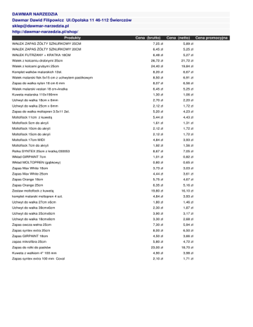 DAWMAR NARZEDZIA Dawmar Dawid Filipowicz Ul.Opolska 11 46-112 Świerczów [email protected] http://dawmar-narzedzia.pl/shop/ Produkty Cena (brutto) Cena (netto) WAŁEK ZAPAS ŻÓŁTY SZNURKOWY 25CM 7,25 zł 5,89 zł WAŁEK ZAPAS ŻÓŁTY SZNURKOWY 20CM 6,45 zł 5,25 zł WAŁEK FUTRZANY + KRATKA 18CM 6,48 zł 5,27 zł Wałek z kolcamiu drobnymi 25cm 26,72 zł 21,72 zł Wałek z kolcami grubymi 25cm 24,40 zł 19,84 zł Komplet wałków malarskich 12el. 8,20 zł 6,67 zł Wałek malarski flok 5x15 cm z uchwytem pastikowym 8,50 zł 6,91 zł Zapas do wałka nylon 18 cm 6 mm 8,07 zł 6,56 zł Wałek malarski vestan 18 cm+kratka 6,45 zł 5,25 zł Kuweta malarska 110x190mm 1,30 zł 1,06 zł Uchwyt do wałka 18cm x 6mm 2,70 zł 2,20 zł Uchwyt do wałka 25cm x 6mm 2,12 zł 1,72 zł Zapas do wałka moltopren 3.5x11 2el. 5,20 zł 4,23 zł Moltoflock 11cm z kuwetą 5,44 zł 4,43 zł Moltoflock 5cm do akryli 1,61 zł 1,31 zł Moltoflock 10cm do akryli 2,12 zł 1,72 zł Moltoflock 15cm do akryli 2,12 zł 1,72 zł Moltoflock 17cm MIDI 4,84 zł 3,93 zł Moltoflock 7cm do akryli 1,92 zł 1,56 zł Rolka SYNTEX 25cm z kratką 030053 8,67 zł 7,05 zł Wkład GIRPAINT 7cm 1,01 zł 0,82 zł Wkład MOLTOPREN (gąbkowy) 0,80 zł 0,65 zł Zapas Max White 18cm 3,73 zł 3,03 zł Zapas Max White 25cm 4,44 zł 3,61 zł Zapas Orange 18cm 5,75 zł 4,67 zł Zapas Orange 25cm 6,35 zł 5,16 zł 19,80 zł 16,10 zł komplet malarski moltopren 4 szt. 4,84 zł 3,93 zł Uchwyt do wałka 27cm x6cm 1,80 zł 1,46 zł Uchwyt do wałka 39cmx6cm 2,30 zł 1,87 zł Uchwyt do wałka 25cmx8cm 3,90 zł 3,17 zł Uchwyt do wałka 18cmx8cm 3,30 zł 2,68 zł Zapas owcza wełna 25cm 7,30 zł 5,94 zł Zapas syntex extra 25cm 8,00 zł 6,50 zł Zapas GIRPAINT 18cm 4,50 zł 3,66 zł Zestaw moltoflock z kuwetą zapas mikrofibra 25cm 5,80 zł 4,72 zł 23,00 zł 18,70 zł Kuweta z wałkiem 4" 100 mm 4,90 zł 3,98 zł Zapas syntex extra 100 mm Coval 2,10 zł 1,71 zł Zapas do rolki do pasków Cena promocyjna