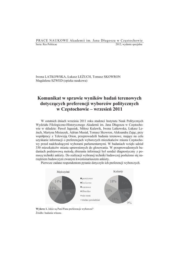 PRACE NAUKOWE Akademii im. Jana Dáugosza w CzĊstochowie Seria: Res Politicae 2012, wydanie specjalne Iwona LATKOWSKA, àukasz LEĩUCH, Tomasz SKOWRON Magdalena SZWED (opieka naukowa) Komunikat w sprawie wyników badaĔ terenowych dotyczących preferencji wyborców politycznych w CzĊstochowie – wrzesieĔ 2011 W ostatnich dniach wrzeĞnia 2011 roku studenci Instytutu Nauk Politycznych Wydziaáu Filologiczno-Historycznego Akademii im. Jana Dáugosza w CzĊstochowie w skáadzie: Paweá Jagusiak, Miáosz Kulawik, Iwona Latkowska, àukasz LeĪuch, Martyna Misiaszek, Adrian Musiaá, Tomasz Skowron, Aleksandra Zając, przy wspóápracy z Telewizją Orion, przeprowadzili badania terenowe, mające na celu uzyskanie informacji o preferencjach wyborczych mieszkaĔców miasta CzĊstochowy przed nadchodzącymi wyborami parlamentarnymi. W badaniach wziĊáo udziaá 330 mieszkaĔców miasta uprawnionych do gáosowania. W przeprowadzonych badaniach podstawową metodą zbierania informacji byá sondaĪ diagnostyczny z pomocą techniki ankiety. Do realizacji wybranej techniki badawczej posáuĪono siĊ narzĊdziem badawczym zwanym kwestionariuszem ankiety. Pierwsze zadane respondentom pytanie dotyczyáo ich preferencji wyborczych. 20% Wykres 1. Jakie są Pani/Pana preferencje wyborcze? ħródáo: badania wáasne. 13% 380 Iwona LATKOWSKA, àukasz LEĩUCH, Tomasz SKOWRON Z analizy badaĔ wynika, Īe wĞród mieszkaĔców CzĊstochowy dominują preferencje prawicowe, które zarówno wĞród mĊĪczyzn, jak i kobiet zdeklarowaáo 24% badanych. Poglądy lewicowe zdeklarowaáo 20% mĊĪczyzn oraz 13% kobiet, równieĪ poglądy centrowe mają wiĊcej zwolenników wĞród mĊĪczyzn (16%) niĪ wĞród kobiet (9%). Natomiast wiĊcej kobiet niĪ mĊĪczyzn posiada poglądy liberalne, jest to odpowiednio 18 i 15%. Preferencji wyborczych ze wzglĊdu na poglądy nie posiada 11% mĊĪczyzn i 18% kobiet, natomiast 14% mĊĪczyzn i 18% kobiet trudno jest owe preferencje jednoznacznie okreĞliü (wykres 1). Wysokie poparcie dla prawicy byáo zaskakujące dla badających, zwaĪywszy na fakt, Īe obecny prezydent oraz wiĊkszoĞü radnych miasta CzĊstochowy reprezentuje Sojusz Lewicy Demokratycznej (SLD). Wykres poniĪej pokazuje równieĪ, Īe partie lewicowe miaáy w CzĊstochowie wiĊksze poparcie procentowe w stosunku do wyników krajowych (wykres 2). Wykres 2. Poparcie dla lewicy w CzĊstochowie ħródáo: www.pkw.gov.pl; badania wáasne. Z analizy powyĪszego wykresu, przedstawiającego wyniki wyborów w poszczególnych latach dla partii lewicowych, moĪemy wnioskowaü, Īe w roku 2001 partie te miaáy w CzĊstochowie poparcie o prawie 10% wyĪsze niĪ w caáym kraju, w roku 2005 róĪnica wyniosáa juĪ tylko ok. 1%. W 2007 roku partie lewicowe uzyskaáy w CzĊstochowie wynik o 2% wyĪszy niĪ w skali kraju. W 2011 róĪnica wynosiáa 1% przewagi CzĊstochowy, i mimo Īe ankietowani deklarowali poparcie na poziomie 20%, ogólny wynik partii lewicowych byá najniĪszy w ostatnich latach i wyniósá 10%. Kolejnym poruszonym przez studentów problemem byáa frekwencja, a uzyskane wyniki ilustrują poniĪsze wykresy. 381 Komunikat w sprawie wyników badaĔ… 82% 84% Wykres 3. Czy weĨmie Pan/i udziaá w najbliĪszych wyborach do Parlamentu RP? ħródáo: badania wáasne. Z analizy badaĔ wynika ze ponad 80% kobiet i mĊĪczyzn zadeklarowaáo chĊü udziaáu w wyborach do parlamentu, co niestety nie znalazáo odzwierciedlenia w rzeczywistoĞci, poniewaĪ realna frekwencja w CzĊstochowie wyniosáa 47,52%1. W czasie przeprowadzania badaĔ juĪ 4% mĊĪczyzn oraz 5% kobiet byáo pewnych, Īe nie weĨmie udziaáu w wyborach, natomiast 14% mĊĪczyzn i 11% kobiet byáo niezdecydowanych (wykres 3). Aby móc sprawdziü, jak zmieniają siĊ preferencje mieszkaĔców CzĊstochowy, respondentom zostaáo zadane pytanie o to, na którą partiĊ oddali swój gáos w poprzednich wyborach, wyniki ukazuje wykres 4. 36% 54% Wykres 4. Na jakie ugrupowanie oddaá/a Pan/i gáos w poprzednich wyborach do parlamentu RP? ħródáo: badania wáasne. 1 ħródáo: http://wybory2011.pkw.gov.pl/att/240000/pl/okr-28.html#tabs-1 [stan z 14.01.2012]. 382 Iwona LATKOWSKA, àukasz LEĩUCH, Tomasz SKOWRON Badania wykazaáy, Īe w 2007 roku najwiĊkszym poparciem cieszyáa siĊ Platforma Obywatelska (PO), zarówno wĞród kobiet (54%), jak i mĊĪczyzn (36%). Na drugim miejscu uplasowaáo siĊ Prawo i SprawiedliwoĞü (PiS) z wynikiem po 19% u obu páci. Trzecie miejsce z poparciem na poziomie 18% wĞród mĊĪczyzn i 7% wĞród kobiet zająá Sojusz Lewicy Demokratycznej (SLD). Polskie Stronnictwo Ludowe (PSL) otrzymaáo wĞród mĊĪczyzn 11% poparcia, natomiast wĞród kobiet 4%. Dokonanego wyboru nie pamiĊta 16% zarówno mĊĪczyzn, jak i kobiet. Na szczególną uwagĊ zasáuguje odpowiedĨ na pytanie, w którym poproszono respondentów o wskazanie kandydatów z ugrupowaĔ, na które zamierzają zagáosowaü w tegorocznych wyborach. Wyniki tego badania przedstawiaáy siĊ nastĊpująco: 27% odpowiedziaáo, Īe wybierze kandydata Platformy Obywatelskiej (PO), 15% odda swój gáos na kandydata Prawa i SprawiedliwoĞci (PiS), 14% na przedstawiciela Sojuszu Lewicy Demokratycznej (SLD), a 6% na kandydata Polskiego Stronnictwa Ludowego (PSL). Na inne niĪ wymienione w ankiecie ugrupowanie odda gáos 12% respondentów, a 26% nie wie, na kogo zagáosuje (wykres 5.) 26% PIS 15% PO PSL 12% 27% SLD INNE 14% 6% Wykres 5. Na które ugrupowanie zamierza Pan/i oddaü swój gáos? ħródáo: badania wáasne. Wyniki badania sondaĪowego znalazáy odzwierciedlenie w dniu wyborów. W CzĊstochowie wygraáy partie „prawicowe”: Platforma Obywatelska (PO) otrzymaáa 35% a Prawo i SprawiedliwoĞü (PiS) 27%, nastĊpnie Sojusz Lewicy Demokratycznej (SLD) 11%, Polskie Stronnictwo Ludowe (PSL) 9% i 18% wybraáo inne ugrupowania polityczne (wykres 6). 383 Komunikat w sprawie wyników badaĔ… 35% Wykres 6. Wyniki wyborów dla miasta CzĊstochowy ħródáo: www.pkw.g