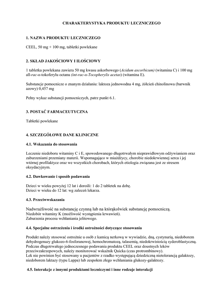CHARAKTERYSTYKA PRODUKTU LECZNICZEGO 1. NAZWA PRODUKTU LECZNICZEGO CEEL, 50 mg + 100 mg, tabletki powlekane 2. SKŁAD JAKOŚCIOWY I ILOŚCIOWY 1 tabletka powlekana zawiera 50 mg kwasu askorbowego (Acidum ascorbicum) (witamina C) i 100 mg all-rac-α-tokoferylu octanu (int-rac-α-Tocopherylis acetas) (witamina E). Substancje pomocnicze o znanym działaniu: laktoza jednowodna 4 mg, żółcień chinolinowa (barwnik azowy) 0,457 mg Pełny wykaz substancji pomocniczych, patrz punkt 6.1. 3. POSTAĆ FARMACEUTYCZNA Tabletki powlekane 4. SZCZEGÓŁOWE DANE KLINICZNE 4.1. Wskazania do stosowania Leczenie niedoboru witaminy C i E, spowodowanego długotrwałym nieprawidłowym odżywianiem oraz zaburzeniami przemiany materii. Wspomagająco w miażdżycy, chorobie niedokrwiennej serca i jej wtórnej profilaktyce oraz we wszystkich chorobach, których etiologia związana jest ze stresem oksydacyjnym. 4.2. Dawkowanie i sposób podawania Dzieci w wieku powyżej 12 lat i dorośli: 1 do 2 tabletek na dobę. Dzieci w wieku do 12 lat: wg zaleceń lekarza. 4.3. Przeciwwskazania Nadwrażliwość na substancję czynną lub na którąkolwiek substancję pomocniczą. Niedobór witaminy K (możliwość wystąpienia krwawień). Zaburzenia procesu wchłaniania jelitowego. 4.4. Specjalne ostrzeżenia i środki ostrożności dotyczące stosowania Produkt należy stosować ostrożnie u osób z kamicą nerkową w wywiadzie, dną, cystynurią, niedoborem dehydrogenazy glukozo-6-fosforanowej, hemochromatozą, talasemią, niedokrwistością syderoblastyczną. Podczas długotrwałego jednoczesnego podawania produktu CEEL oraz doustnych leków przeciwzakrzepowych, należy monitorować wskaźnik Quicka (czas protrombinowy). Lek nie powinien być stosowany u pacjentów z rzadko występującą dziedziczną nietolerancją galaktozy, niedoborem laktazy (typu Lappa) lub zespołem złego wchłaniania glukozy-galaktozy. 4.5. Interakcje z innymi produktami leczniczymi i inne rodzaje interakcji 2 Witamina E może nasilać działanie leków przeciwzakrzepowych. Kolestyramina i kolestypol mogą zmniejszać skuteczność preparatu. Witamina E stosowana jednocześnie z preparatami żelaza może osłabiać ich działanie, zwłaszcza u dzieci z niedokrwistością z niedoboru żelaza. 4.6. Wpływ na płodność, ciążę i laktację Nie wiadomo, czy lek może powodować zagrożenie dla płodu u zwierząt, ponieważ nie przeprowadzono odpowiednich badań. Nie przeprowadzono też odpowiednio liczebnych, dobrze kontrolowanych obserwacji u człowieka. Preparat może być stosowany w ciąży jedynie w przypadkach, gdy w opinii lekarza korzyść dla matki przeważa nad potencjalnym zagrożeniem dla płodu. Witaminy C i E przenikają do mleka kobiecego. Należy zachować ostrożność podczas stosowania produktu CEEL u kobiet karmiących piersią. 4.7. Wpływ na zdolność prowadzenia pojazdów i obsługiwania maszyn Produkt leczniczy nie wpływa na zdolność prowadzenia pojazdów i obsługiwania maszyn. 4.8. Działania niepożądane Działania niepożądane dla produktu CEEL nie są znane. Tolerancja witaminy E jest dobra. Po przekroczeniu zalecanych dawek mogą wystąpić: uczucie zmęczenia, osłabienia, bóle głowy, nudności, biegunka, wzdęcia, wysypka. Witamina C występuje w tabletkach CEEL w dawce dwukrotnie niższej od zalecanego dziennego spożycia i dlatego działania niepożądane związane z jej zawartością są mało prawdopodobne. Zgłaszanie podejrzewanych działań niepożądanych Po dopuszczeniu produktu leczniczego do obrotu istotne jest zgłaszanie podejrzewanych działań niepożądanych. Umożliwia to nieprzerwane monitorowanie stosunku korzyści do ryzyka stosowania produktu leczniczego. Osoby należące do fachowego personelu medycznego powinny zgłaszać wszelkie podejrzewane działania niepożądane za pośrednictwem Departamentu Monitorowania Niepożądanych Działań Produktów Leczniczych Urzędu Rejestracji Produktów Leczniczych, Wyrobów Medycznych i Produktów Biobójczych Al. Jerozolimskie 181C, 02-222 Warszawa Tel.: + 48 22 49 21 301 Faks: + 48 22 49 21 309 e-mail: [email protected]. 4.9. Przedawkowanie Hiperwitaminozy E nie stwierdzono u ludzi; nie stwierdzono również istotnych zmian przy nadmiernym podawaniu witaminy E u zwierząt. Po przedawkowaniu preparatu CEEL można się spodziewać łagodnych objawów ze strony przewodu pokarmowego, przy braku toksyczności ogólnoustrojowej. 5. WŁAŚCIWOŚCI FARMAKOLOGICZNE 5.1. Właściwości farmakodynamiczne Grupa farmakoterapeutyczna: kwas as korbowy (witamina C); preparaty złożone. Kod ATC: A11GB. Produkt CEEL zawiera jako substancje czynne witaminę E (octan DL-α-tokoferolu) oraz witaminę C (kwas L-askorbowy). Aktywność biologiczna witaminy E i witaminy C wynika przede wszystkim z ich właściwości antyoksydacyjnych. Witamina E stanowi główny antyoksydant fazy lipidowej komórek, natomiast witamina C jest głównym antyoksydantem fazy wodnej. Połączenie tych witamin w jednym 3 preparacie pozwala wykorzystać synergizm działania obu składników, oraz działanie ochronne witaminy C w stosunku do witaminy E. Dzięki temu mieszanina obu witamin skuteczniej hamuje peroksydację lipidów niż każda z witamin zastosowana osobno. Witamina E chroni przed utlenianiem inne witaminy, zwłaszcza witaminę A, oraz hormony i enzymy. Zapobiega tworzeniu się nadtlenków z nienasyconych kwasów tłuszczowych, witamina E stabilizuje błony komórkowe i lizosomalne. Modeluje także biosyntezę prostaglandyn oraz agregację płytek krwi. Przypisuje się jej też istotną rolę w ochronie organizmu przed szkodliwym działaniem wolnych rodników i nadtlenków lipidowych. Badania epidemiologiczne wskazują na związek pomiędzy dzienną podażą witaminy E, a zagrożeniem chorobą niedokrwienną serca, miażdżycą i innymi chorobami, których patogeneza związana jest ze stresem oksydacyjnym. Witamina C jest związkiem niezbędnym w procesach oksydoredukcyjnych, w syn