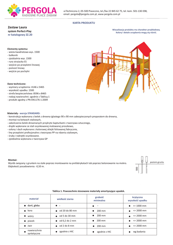 ul.Techniczna 2, 05-500 Piaseczno, tel./fax 22 845 62 75, tel. kom. 501-130-598, email: [email protected], www pergola.com.pl KARTA PRODUKTU Zestaw Laura Wizualizacja produktu ma charakter przyk³adowy. Kolory i detale urz¹dzenia mog¹ siê ró¿niæ. system Perfect-Play nr katalogowy ZZ.20 Elementy systemu: - wie¿a kwadratowa wys. 1500 - balkonik - zje¿dzalnia wys. 1500 - rura stra¿acka ES - wejœcie po przeplotni linowej - pomost linowy - wejœcie po pochylni Dane techniczne: - wymiary urz¹dzenia: 4146 x 5465 - wysokoœæ upadku: 1500 - strefa bezpieczeñstwa: 8596 x 8465 - rodzaj nawierzchni: zgodnie z Tablic¹ 1 - produkt zgodny z PN-EN1176-1:2009 Materia³y - wersja STANDARD: - konstrukcja wykonana z belek z drewna iglastego 90 x 90 mm zabezpieczonych preparatem do drewna, - monta¿ na kotwach stalowych, - zakoñczenia belek drewnianych przykryte kapturkami z tworzywa sztucznego, - dr¹¿ki wykonane ze stali ocynkowanej malowanej proszkowo, - os³ony i dach wykonane z kolorowej sklejki foliowanej fabrycznie, - liny przeplotni profesjonalne z tworzywa PP na rdzeniu stalowym, - œruby i nakrêtki ocynkowane. - zje¿dzalnia wykonana z tworzywa GP poziom gruntu 500 Monta¿: Wyrób zwi¹zany z gruntem na sta³e poprzez montowanie na prefabrykatach lub poprzez betonowanie na mokro. G³êbokoœæ posadowienia: -0,50 m. Tablica 1. Powszechnie stosowane materia³y amortyzuj¹ce upadek. materia³ wielkoœæ ziarna gruboœæ minimalna krytyczna wysokoœæ upadku darñ, gleba - - <= 1000 mm kora od 20 do 80 mm 200 mm <= 2000 mm wióry od 5 do 30 mm 200 mm <= 2000 mm piasek od 0,2 do 2 mm 200 mm <= 2000 mm ¿wir od 2 do 8 mm 200 mm <= 2000 mm nawierzchnie syntetyczne zgodnie z HIC zgodnie z HIC wg badania ul.Techniczna 2, 05-500 Piaseczno, tel./fax 22 845 62 75, tel. kom. 501-130-598, email: [email protected], www pergola.com.pl KARTA PRODUKTU Zestaw Laura system Perfect-Play nr katalogowy ZZ.20 rzut poziomy ze stref¹ bezpieczeñstwa skala 1:100 R2150 R1500 R1500 R1500 R1500 R1500 R1500 1000 2300 R1500 R1000 1000 R1000 5465 8465 rzut pionowy skala 1:100 1820 890 1500 2310 1500 2400 3573 510 890 8596 4146 R1500