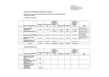 Załącznik nr 16 Do Uchwały Nr XL/524/09 Rady Miejskiej w Pabianicach Z dnia 28.01.2009 r INFORMACJA O STANIE MIENIA KOMUNALNEGO NA 30.09.2008 r Mienie komunalne stanowiące własność Gminy Miasta Pabianic nabyte w drodze komunalizacji Bądź będące we władaniu I. Wartość mienia zakładów Lp 1 Podmiot rodzaj użytkowania 2 1 Zakład Gospodarki Mieszkaniowej 2 Miejski Zakład Pogrzebowy Wartość inwentarzowa majątku na Powierzchnia Wartość gruntu 30.09.2007 r (w Zwiększenia Zmniejszenia w ha w zł zł ) 3 4 5 6 7 58,7595 38 207 360 Uwagi 9 65 827 797 375 929 856 962 65 346 764 Przyjęcie budynku ,zakupy sprzętu komputerowych i programów ,monitoringu,samochodu ,wykupy mieszkań likwidacja i przekazanie samochdoów 2 078 167 158 636 12 815 2 223 988 Przyjęcie pawilonu handlowego i ogrodzenia zakup programów komp. I osprzetu 33 460 393 Wykonanie nawierzch asfaltowej,zakup kotła co,autom.zesp.spal.,zakup walca stalow.,samochodu, sprzętu mechanicznego,przekazanie budynku,likwidacja samochodu 22 582 374 Prace modernizacyjne obiektów ośrodka,budowa placu zabaw,boiska ,zakup ciągnika ,spawarki,szlifierki fizyczna likwidacja zużytego sprzętu,przekazanie budynku 3 Zarząd Dróg i Zieleni Miejskiej 4 Miejski Ośrodek Sportu i Rekreacji 30,5100 7 621 398 22 307 356 5 Samodzielny Publiczny Zakład Opieki Zdrowotnej 8,6874 3 292 670 9 557 736 250,9087 63 799 551 132 526 215 Razem I 152,9518 14 678 123 Wartość inwentarzowa majątku na 30.09.2008 r ( w zł) 8 32 755 159 775 845 432 019 70 611 157 001 9 557 736 1 742 429 1 097 389 133 171 255 II.Wartość pozostałego mienia Lp 1 1 2 3 Podmiot rodzaj użytkowania 2 Dzierżawa i najem osób fizycznych i prawnych -rolne inwestycyjne Spółdzielnie pracy i spółki prawa handlowego użytkowanie wieczyste użytkowanie Użytkowanie wieczystemieszkalnictwo osoby fizyczne osoby prawne Wartość inwentarzowa majątku na Powierzchnia Wartość gruntu 30.09.2007 r w ha w zł ( w zł ) 3 4 5 6,08 22,51 0,09 5,61 42,05 116,36 Wartość inwentarzowa majątku na 30.09.2008 r (w Zwiększenia Zmniejszenia zł ) 6 7 8 Uwagi 9 4 5 6 7 8 Użytkowanie wieczyste handel ,usługi,rzemiosł osoby fizyczne osoby prawne Zasoby w tym rolne – 2,77 ha Ogródki działkowe użytkowanie użytkowanie wieczyste Trwały zarząd jednostek i zakładów budżetowych Zasoby poza terenem Pabianic Gmina Dobroń-Dobroń A Poduchowny 8,36 9,02 101,60 32,8 25,3 11,73 9,46 B Gmina Pabianice -Szynkielew C Gmina Pabianice -Piątkowisko D Gmina Łódź -Łaskowice Łącznie grunty Wydziału Gospodarki Nieruchomościami i Urbanistyki Łaskowice -składowisko 1 odpadów 2 Infrastruktura społeczna 390,97 94 695 898 10,38 2 592 924 14,9874 6 659 201 27 252 106 1 317 276 121 759 28 447 623 Przyjęcie obiektów i zaplecza maszynowego zakup pomocy dydakt,sprzetu AGD,likwidacja zużytego sprzętu A Przedszkola 4,6605 2 603 639 5 683 293 305 613 70 603 5 918 303 B Szkoły 9,2008 3 774 262 13 415 169 635 741 10 923 14 039 987 C Żłobek 0,9430 235 561 939 436 49 659 3 593 985 502 D Biblioteka,MOK, Muzeum 0,1831 45 738 7 214 208 326 263 36 640 7 503 831 25 762 986 3 336 950 3 830 948 25 268 988 623 131 14 044 6 146 631 029 Modernizacja budynku ,fizyczna likwidacja zuzytego sprzetu 3 732 497 125 542 5 302 3 852 737 Zakup sprzętu komputerowego i urządzeń ,modernizcja budynku, fizyczna likwdacja 57 370 720 4 793 812 3 964 155 58 200 377 3 Urząd Miejski w Pabianicach 4 Schronisko dla zwierząt 5 Miejskie Centrum Pomocy Społecznej Razem II RAZEM I + II 416,3374 103 948 023 667,2461 167 747 574 189 896 935 6 536 241 5 061 544 191 371 632 Zakup pomocy dydakt.,komputerów, likwidacja zużytego sprzętu Zakup wyposażenie , fizyczna likwidacja zużytego Zakup sprzętu komputerowego, księgozbiorów, fizyczna likwidacja Przyjęcie kanalizacji ,sieci wodociągow ,zakup sprzętu komputerow.środk.transportu. wyposażenia ,sprzetu biurowego sprzedaż budynków,przekazanie do sp.gminnych obiektów inzynierii lądowej .i wodnej 1.Powierzchnia w ha 667,2461 2.Wartość gruntu w zł 167 747 574 3.Wartość inwentarzowa majątku na 30.09.2007 r 4.Wartość inwentarzowa majątku na 30.09.2008 r - 189 896 935 191 371 632 Gmina w drodze komunalizacji uzyskała prawo własności do nieruchomości o pow. 4,59 ha , w trybie art.73 ustawy Przepisy wprowadzające ustawy reformujące ustawy reformujące administrację publiczną – 2,24 ha w trybie art. 2A ustawy o drogach publicznych – 13,94 ha W okresie od października 2007 r do września 2008 r nastąpił zwrot nieruchomości gminnych na rzecz poprzednich właścicieli na ogólną pow. ok. 0,33 ha Metoda wyceny gruntów -Uchwała Nr XIX/210/99 Rady Miasta Pabianic z dn.22 grudnia 1999 r w sprawie ustalenia stawek 1 m2 do wyceny inwestycji mienia komunalnego gminy miejskiej Pabianice drogi gruntowe 1,50 zł drogi utwardzone 21,60 zł grunty rolne i leśne 3,49 zł grunty inwestycyjne 24,98 zł oraz rozporządzenie Rady Ministrów z dn.21.09.2004 r -metody wyceny są zależne od celów na jakie wykonany ma być operat np. na potrzeby Sprzedaży wartość rynkowa nieruchomości określana jest w podejściu porównawczym i każdorazowo zlecane jest wykonanie operatu ,w którym brane są pod uwagę indywidualne cechy wycenianej nieruchomości. Powierzchnia miasta ogółem ~ 3.300 ha mienia komunalnego ~ 667,2461 ha udział mienia komunalnego w pow. Miasta 20,22 % III.Akcje spółek 1.Regionalna Agencja Poszanowania Energii-S.A. akcje imiennne uprzywilejowane seria A Nr -21,22,23,24 - 4 akcje wartość nominalna akcji 2.500 zł Wartość ogółem- 10.000 zł 2.Fabryka Szlifierek FUM-Pabianice S.A. akcej imienne zwykłe - 8.085 szt wartość nominalna akcji - 10 zł wartość nominalna ogółem - 8.085 szt x 10 zł = 80.850 zł wartość księgowa akcji - 216.090 zł IV.Udziały 1."EKO-REGION" sp z o.o. siedziba Bełchatów 384 szt x 5.000 zł = 1.920.000 zł 2. Targowiska Miejskie sp z o.o w Pabianicach 5.169 szt x 50 zł = 258.450 zł 3. Miejski Zakła