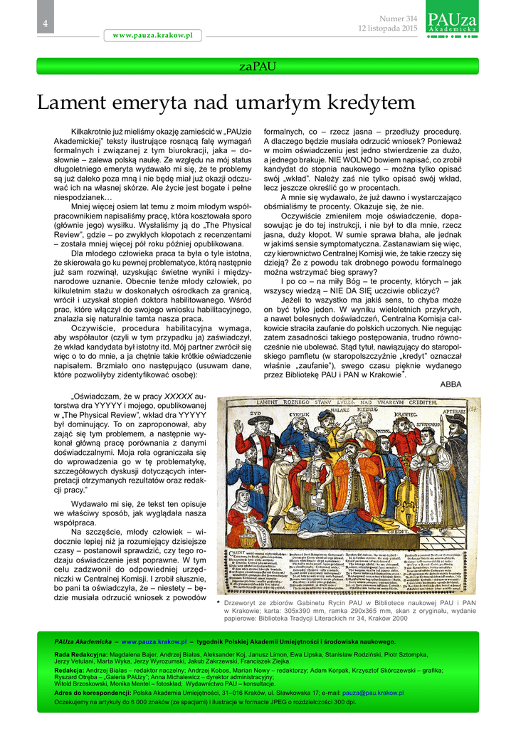 Numer 314 12 listopada 2015 4 www.pauza.krakow.pl zaPAU Lament emeryta nad umarłym kredytem Kilkakrotnie już mieliśmy okazję zamieścić w „PAUzie Akademickiej” teksty ilustrujące rosnącą falę wymagań formalnych i związanej z tym biurokracji, jaka – dosłownie – zalewa polską naukę. Ze względu na mój status długoletniego emeryta wydawało mi się, że te problemy są już daleko poza mną i nie będę miał już okazji odczuwać ich na własnej skórze. Ale życie jest bogate i pełne niespodzianek… Mniej więcej osiem lat temu z moim młodym współpracownikiem napisaliśmy pracę, która kosztowała sporo (głównie jego) wysiłku. Wysłaliśmy ją do „The Physical Review”, gdzie – po zwykłych kłopotach z recenzentami – została mniej więcej pół roku później opublikowana. Dla młodego człowieka praca ta była o tyle istotna, że skierowała go ku pewnej problematyce, którą następnie już sam rozwinął, uzyskując świetne wyniki i międzynarodowe uznanie. Obecnie tenże młody człowiek, po kilkuletnim stażu w doskonałych ośrodkach za granicą, wrócił i uzyskał stopień doktora habilitowanego. Wśród prac, które włączył do swojego wniosku habilitacyjnego, znalazła się naturalnie tamta nasza praca. Oczywiście, procedura habilitacyjna wymaga, aby współautor (czyli w tym przypadku ja) zaświadczył, że wkład kandydata był istotny itd. Mój partner zwrócił się więc o to do mnie, a ja chętnie takie krótkie oświadczenie napisałem. Brzmiało ono następująco (usuwam dane, które pozwoliłyby zidentyfikować osobę): formalnych, co – rzecz jasna – przedłuży procedurę. A dlaczego będzie musiała odrzucić wniosek? Ponieważ w moim oświadczeniu jest jedno stwierdzenie za dużo, a jednego brakuje. NIE WOLNO bowiem napisać, co zrobił kandydat do stopnia naukowego – można tylko opisać swój „wkład”. Należy zaś nie tylko opisać swój wkład, lecz jeszcze określić go w procentach. A mnie się wydawało, że już dawno i wystarczająco obśmialiśmy te procenty. Okazuje się, że nie. Oczywiście zmieniłem moje oświadczenie, dopasowując je do tej instrukcji, i nie był to dla mnie, rzecz jasna, duży kłopot. W sumie sprawa błaha, ale jednak w jakimś sensie symptomatyczna. Zastanawiam się więc, czy kierownictwo Centralnej Komisji wie, że takie rzeczy się dzieją? Że z powodu tak drobnego powodu formalnego można wstrzymać bieg sprawy? I po co – na miły Bóg – te procenty, których – jak wszyscy wiedzą – NIE DA SIĘ uczciwie obliczyć? Jeżeli to wszystko ma jakiś sens, to chyba może on być tylko jeden. W wyniku wieloletnich przykrych, a nawet bolesnych doświadczeń, Centralna Komisja całkowicie straciła zaufanie do polskich uczonych. Nie negując zatem zasadności takiego postępowania, trudno równocześnie nie ubolewać. Stąd tytuł, nawiązujący do staropolskiego pamfletu (w staropolszczyźnie „kredyt” oznaczał właśnie „zaufanie”), swego czasu pięknie wydanego przez Bibliotekę PAU i PAN w Krakowie *. ABBA „Oświadczam, że w pracy XXXXX autorstwa dra YYYYY i mojego, opublikowanej w „The Physical Review”, wkład dra YYYYY był dominujący. To on zaproponował, aby zająć się tym problemem, a następnie wykonał główną pracę porównania z danymi doświadczalnymi. Moja rola ograniczała się do wprowadzenia go w tę problematykę, szczegółowych dyskusji dotyczących interpretacji otrzymanych rezultatów oraz redakcji pracy.” Wydawało mi się, że tekst ten opisuje we właściwy sposób, jak wyglądała nasza współpraca. Na szczęście, młody człowiek – widocznie lepiej niż ja rozumiejący dzisiejsze czasy – postanowił sprawdzić, czy tego rodzaju oświadczenie jest poprawne. W tym celu zadzwonił do odpowiedniej urzędniczki w Centralnej Komisji. I zrobił słusznie, bo pani ta oświadczyła, że – niestety – będzie musiała odrzucić wniosek z powodów * Drzeworyt ze zbiorów Gabinetu Rycin PAU w Bibliotece naukowej PAU i PAN w Krakowie; karta: 305x390 mm, ramka 290x365 mm, skan z oryginału, wydanie papierowe: Biblioteka Tradycji Literackich nr 34, Kraków 2000 PAUza Akademicka – www.pauza.krakow.pl – tygodnik Polskiej Akademii Umiejętności i środowiska naukowego. Rada Redakcyjna: Magdalena Bajer, Andrzej Białas, Aleksander Koj, Janusz Limon, Ewa Lipska, Stanisław Rodziński, Piotr Sztompka, Jerzy Vetulani, Marta Wyka, Jerzy Wyrozumski, Jakub Zakrzewski, Franciszek Ziejka. Redakcja: Andrzej Białas – redaktor naczelny; Andrzej Kobos, Marian Nowy – redaktorzy; Adam Korpak, Krzysztof Skórczewski – grafika; Ryszard Otręba – „Galeria PAUzy”; Anna Michalewicz – dyrektor administracyjny; Witold Brzoskowski, Monika Mentel – fotoskład; Wydawnictwo PAU – konsultacje. Adres do korespondencji: Polska Akademia Umiejętności, 31–016 Kraków, ul. Sławkowska 17; e-mail: [email protected] Oczekujemy na artykuły do 6 000 znaków (ze spacjami) i ilustracje w formacie JPEG o rozdzielczości 300 dpi.