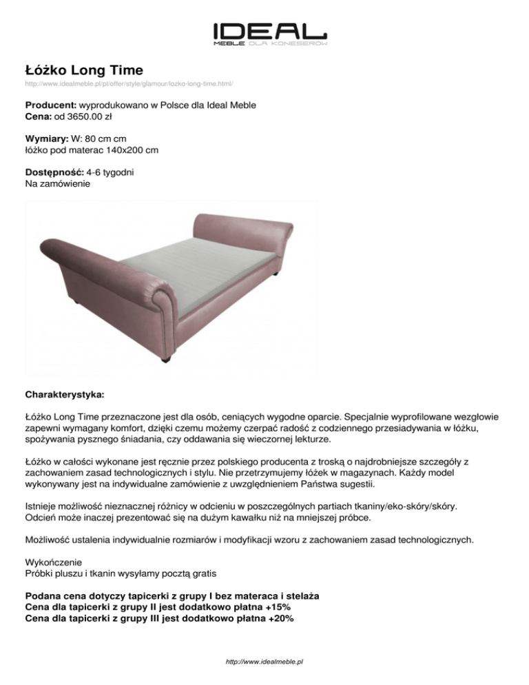 Łóżko Long Time http://www.idealmeble.pl/pl/offer/style/glamour/lozko-long-time.html/ Producent: wyprodukowano w Polsce dla Ideal Meble Cena: od 3650.00 zł Wymiary: W: 80 cm cm łóżko pod materac 140x200 cm Dostępność: 4-6 tygodni Na zamówienie Charakterystyka: Łóżko Long Time przeznaczone jest dla osób, ceniących wygodne oparcie. Specjalnie wyprofilowane wezgłowie zapewni wymagany komfort, dzięki czemu możemy czerpać radość z codziennego przesiadywania w łóżku, spożywania pysznego śniadania, czy oddawania się wieczornej lekturze. Łóżko w całości wykonane jest ręcznie przez polskiego producenta z troską o najdrobniejsze szczegóły z zachowaniem zasad technologicznych i stylu. Nie przetrzymujemy łóżek w magazynach. Każdy model wykonywany jest na indywidualne zamówienie z uwzględnieniem Państwa sugestii. Istnieje możliwość nieznacznej różnicy w odcieniu w poszczególnych partiach tkaniny/eko-skóry/skóry. Odcień może inaczej prezentować się na dużym kawałku niż na mniejszej próbce. Możliwość ustalenia indywidualnie rozmiarów i modyfikacji wzoru z zachowaniem zasad technologicznych. Wykończenie Próbki pluszu i tkanin wysyłamy pocztą gratis Podana cena dotyczy tapicerki z grupy I bez materaca i stelaża Cena dla tapicerki z grupy II jest dodatkowo płatna +15% Cena dla tapicerki z grupy III jest dodatkowo płatna +20% http://www.idealmeble.pl W przypadku tapicerki skórzanej prosimy o kontakt. http://www.idealmeble.pl Dostępne wersje produktu: nazwa produktu warianty Łóżko Long Time pod Tapicerka materiał, materac 140x200 cm tkanina, plusz gr I cena 3650.00zł Zwykły stelaż (+350.00 zł) Podnoszony stelaż bez siłownika (+450.00 zł) Podnoszony stelaż z siłownikiem (+700.00 zł) Łóżko Long Time Tapicerka materiał, 0.00zł wymiar indywidualny tkanina, plusz gr I http://www.idealmeble.pl dostępne 4-6 tygodni Zapytaj Zdjęcia produktu: http://www.idealmeble.pl Powered by TCPDF (www.tcpdf.org)