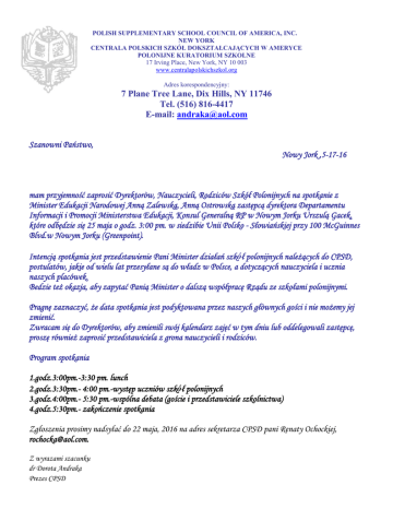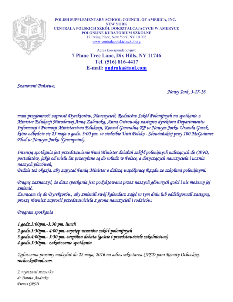 POLISH SUPPLEMENTARY SCHOOL COUNCIL OF AMERICA, INC. NEW YORK CENTRALA POLSKICH SZKÓŁ DOKSZTAŁCAJĄCYCH W AMERYCE POLONIJNE KURATORIUM SZKOLNE 17 Irving Place, New York, NY 10 003 www.centralapolskichszkol.org Adres korespondencyjny: 7 Plane Tree Lane, Dix Hills, NY 11746 Tel. (516) 816-4417 E-mail: [email protected] Szanowni Państwo, Nowy Jork ,5-17-16 mam przyjemność zaprosić Dyrektoròw, Nauczycieli, Rodziców Szkół Polonijnych na spotkanie z Minister Edukacji Narodowej Anną Zalewską, Anną Ostrowską zastępcą dyrektora Departamentu Informacji i Promocji Ministerstwa Edukacji, Konsul Generalną RP w Nowym Jorku Urszulą Gacek, które odbędzie się 25 maja o godz. 3:00 pm. w siedzibie Unii Polsko - Słowiańskiej przy 100 McGuinnes Blvd.w Nowym Jorku (Greenpoint). Intencją spotkania jest przedstawienie Pani Minister działań szkół polonijnych należących do CPSD, postulatów, jakie od wielu lat przesyłane są do władz w Polsce, a dotyczących nauczyciela i ucznia naszych placówek. Bedzie też okazja, aby zapytać Panią Minister o dalszą współpracę Rządu ze szkołami polonijnymi. Pragnę zaznaczyć, że data spotkania jest podyktowana przez naszych głòwnych gości i nie możemy jej zmienić. Zwracam się do Dyrektorów, aby zmienili swój kalendarz zajęć w tym dniu lub oddelegowali zastępcę, proszę również zaprosić przedstawiciela z grona nauczycieli i rodziców. Program spotkania 1.godz.3:00pm.-3:30 pm. lunch 2.godz.3:30pm.- 4:00 pm.-występ uczniów szkół polonijnych 3.godz.4:00pm.- 5:30 pm.-wspólna debata (goście i przedstawiciele szkolnictwa) 4.godz.5:30pm.- zakończenie spotkania Zgłoszenia prosimy nadsyłać do 22 maja, 2016 na adres sekretarza CPSD pani Renaty Ochockiej, [email protected]. Z wyrazami szacunku dr Dorota Andraka Prezes CPSD