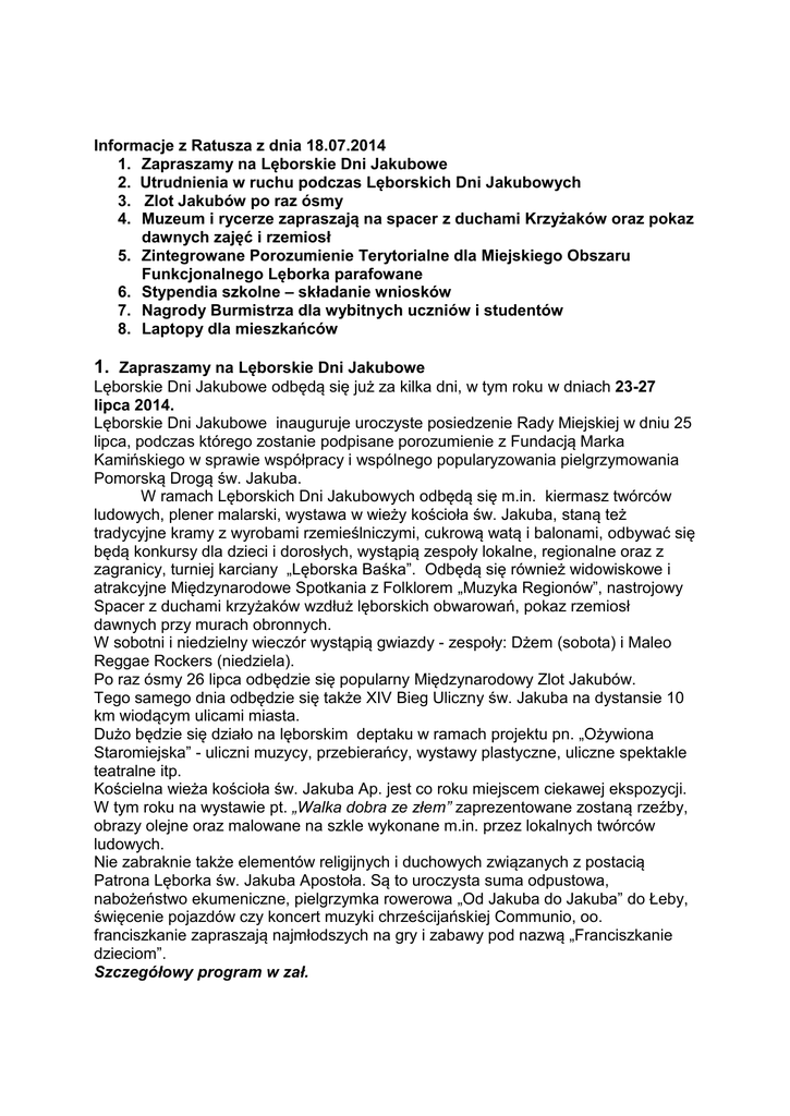 Informacje z Ratusza z dnia 18.07.2014 1. Zapraszamy na