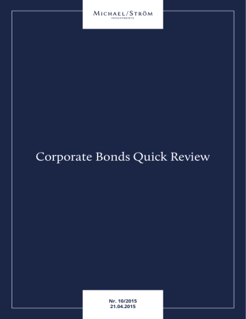 Numer wydania: 1/2015 Data wydania: 18.02.2015 Corporate Bonds Quick Review Nr. 10/2015 21.04.2015 Corporate Bonds Quick Review Nr. 10 / 21.04.2015 Informacje ze spółek Tabela 1. Catalyst – obligacje wg największego wzrostu cen Spółka Klon (17.04) - debiut obligacji serii G o wartości 2,5 mln PLN Seria Zmiana Obrót (p.p.) (tys. PLN) Kurs CZERWONA TOREBKA CZT0416 6,99 158,51 89,00 SAF SAF1115 2,00 2,93 97,00 KLEBA INVEST KIN0615 1,51 9,25 99,90 PRÓCHNIK PRC1215 1,20 6,90 97,70 Admiral Boats (14-16.04) - wykup obligacji serii H i C o wartościach 5,25 mln PLN i 5,38 mln PLN oraz emisja obligacji serii K o wartości 0,83 mln PLN 2C PARTNERS 2CP0517 1,00 20,86 101,00 BBI DEVELOPMENT BBI0218 1,00 12,24 101,00 EFM EFM0915 1,00 23,25 100,00 KRUK KRU1018 1,00 36,09 106,00 Marka (15.04) - emisja obligacji serii I i J o łącznej wartości 0,7 mln PLN MURAPOL MUL1116 1,00 20,33 101,00 PKN ORLEN PKN0420 1,00 354,86 106,80 EUROCENT ERC0916 0,99 43,69 100,99 Fast Finance (15.04) - skup własny obligacji serii J ALIOR BANK ALR0924 0,90 323,47 101,15 PCZ PCZ0617 0,80 27,16 96,50 GETIN NOBLE BANK GNB0320 0,79 150,33 97,30 PCC KOSMET KOS1117 0,74 2,25 101,40 Ghelamco Invest (16.04) - zawarcie 7-letniej umowy najmu na 21 082 mkw. z Samsungiem Polnord (14.04) - ustanowienie publicznego programu emisji obligacji do kwoty 100 mln PLN Źródło: Michael/Ström Dom Maklerski, GPW Catalyst Ghelamco Invest (14.04) - możliwa wypłata 100 mln EUR dywidendy przez poręczyciela obligacji spółki Tabela 2. Catalyst – obligacje wg największego spadku cen Hyperion (13.04) - emisja obligacji serii D o wartości 8,17 mln PLN Spółka Seria Zmiana Obrót (p.p.) (tys. PLN) Kurs MEXPOL MPL0316 -5,95 14,52 90,00 EGB Investments (13.04) - wykup obligacji serii G i H o wartościach 9,2 mln PLN i 1,4 mln PLN E-KANCELARIA EKA0515 -4,10 4,10 52,90 WŁODARZEWSKA WLO0516 -3,14 15,57 74,01 PC Guard (13.04) - brak wykupu obligacji serii B o wartości 5,02 mln PLN FKD FKD0516 -3,00 31,01 88,00 GHELAMCO INVEST GHE0619 -2,99 101,46 96,01 GRUPA EMMERSON GEM0715 -2,91 48,07 88,09 PTI PTI0615 -2,40 16,30 92,50 FAST FINANCE FFI0116 -1,85 14,10 98,10 KREDYT INKASO KRI0116 -1,73 106,42 100,00 ERBUD ERB0318 -1,51 20,30 101,18 GETIN NOBLE BANK GNB0321 -1,45 20,28 96,05 VOXEL VOX0716 -1,45 256,12 97,45 PCC AUTOCHEM AUT0217 -1,29 5,58 101,61 2C PARTNERS 2CP0316 -1,10 12,60 101,90 PCZ PCZ0416 -1,09 25,46 97,20 Fundusze polskich obligacji korporacyjnych w marcu 2015 r. • Wartość aktywów netto funduszy polskich obligacji korporacyjnych od początku 2015 r. Źródło: Michael/Ström Dom Maklerski, GPW Catalyst • Wzrost wartości aktywów funduszy polskich obligacji korporacyjnych o 533,18 mln PLN w marcu 2015 r. Tabela 3. Catalyst – obligacje wg tygodniowego obrotu • Stopy zwrotu z funduszy polskich obligacji korporacyjnych Spółka Dobry rok deweloperów mieszkaniowych • Podsumowanie wyników poszczególnych spółek z segmentu deweloperów mieszkaniowych Seria Obrót Zmiana (tys. PLN) (p.p.) Kurs BGK BGK0517 5 054,95 0,10 100,15 ACTION ACT0717 2 740,07 0,17 100,52 MULTIMEDIA POLSKA MMP0520 2 046,36 0,00 100,10 POZBUD T&R POZ0219 2 027,12 0,00 100,60 PKN ORLEN PKN0418 1 986,05 0,14 100,95 ECHO INVESTMENT ECH0616 1 388,20 -0,24 101,20 GETIN NOBLE BANK GNB0318 1 239,21 -0,85 99,10 ECHO INVESTMENT ECH0418 1 171,96 0,00 102,80 MULTIMEDIA POLSKA MMP0520 1 023,18 0,00 100,10 PKN ORLEN PK11117 819,37 -0,52 100,88 GETIN NOBLE BANK GNB0819 753,07 -0,20 99,00 PCC ROKITA PCR0416 637,60 -0,10 102,90 ECHO INVESTMENT ECH0318 516,59 -0,30 102,00 BANK ZACHODNI WBK BZW1216 511,40 -0,17 101,22 GETIN NOBLE BANK GNB0218 506,48 0,20 100,30 Źródło: Michael/Ström Dom Maklerski, GPW Catalyst Rafał Rewczuk Analityk [email protected] 2 Corporate Bonds Quick Review Nr. 10 / 21.04.2015 Obroty, wzrosty i spadki Tabela 4. Catalyst – obligacje z najwyższą premią Spółka Obroty na rynku Catalyst w ubiegłym tygodniu wyniosły 31,64 mln PLN. Transakcje sesyjne wyniosły 30,16 mln PLN. Transakcje pakietowe wyniosły 1,48 mln PLN. Najwyższy obrót w wysokości 5,05 mln PLN odnotowano na obligacjach BGK, serii BGK0517. Całość obrotu stanowiły transakcje sesyjne. Największy wzrost kursu odnotowano na obligacjach CZERWONA TOREBKA, serii CZT0416. Kurs serii wzrósł o 6,99 p.p. z 82,01% do 89,00%. Obrót na serii wyniósł 158,51 tys. PLN, całość stanowiły transakcje sesyjne. Najwyższy spadek kursu odnotowano na obligacjach MEXPOL, serii MPL0316. Kurs serii spadł o 5,95 p.p. z 95,95% do 90,00%. Obrót serii wyniósł 14,52 tys. PLN, całość stanowiły transakcje sesyjne. Seria Kurs Oprocentowanie BGK IDS1022 121,00 5,75% BGK IDS1018 115,10 6,25% POZNAŃSKA 37 POA0117 108,85 8,00% NORDIC DEVELOPMENT NOR1016 108,50 12,00% POZNAŃSKA 37 POB0117 108,00 8,00% PKN ORLEN PKN0420 106,80 5,00% KRUK KRU1018 106,00 WIBOR 3M + (4,50% - 5,00%) KREDYT INKASO KRI0916 106,00 WIBOR 6M + 5,70% WARIMPEX WXF0218 106,00 WIBOR 6M + 6,00% NOVAVIS NVV1217 105,20 8,00% WARIMPEX WXF0316 105,20 4,88% MERITUM BANK MRT0421 105,00 WIBOR 6M + 5,80% KRUK KRU0818 104,95 WIBOR 3M + (4,50% - 5,00%) CIECH CI21217 104,90 WIBOR 6M + 4,90% KRUK KRU0618 104,80 WIBOR 3M + (4,50% - 5,00%) Źródło: Michael/Ström Dom Maklerski, GPW Catalyst Najwyższa premia i dyskonto Tabela 5. Catalyst – obligacje z najwyższym dyskontem Spółka W minionym tygodniu obligacje BANKU GOSPODARSTWA KRAJOWEGO serii IDS1022 i IDS1018 notowane były z najwyższą premią. Kurs papierów wyceniano odpowiednio na 121,00% i 115,10%. Seria Kurs Oprocentowanie E-KANCELARIA EKA1215 39,99 WIBOR 3M + 6,30% E-KANCELARIA EKA0515 52,90 12,00% E-KANCELARIA EKA0616 64,00 10,00% E-KANCELARIA EKA1115 64,80 10,00% E-KANCELARIA EKA0715 68,00 WIBOR 6M + 7,86% E-KANCELARIA EKA0816 69,80 WIBOR 3M + 6,29% E-KANCELARIA EKA1016 71,00 WIBOR 6M + 6,29% WŁODARZEWSKA WLO0516 74,01 WIBOR 3M + 7,50% E-KANCELARIA EKA0916 74,90 WIBOR 3M + 6,39% Papiery spółki Włodarzewska serii WLO0516 wyceniano na 74,01%, zaś PPUH VIG s