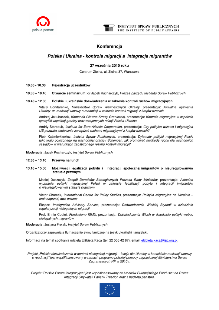 Konferencja Polska i Ukraina - kontrola migracji a integracja migrantów 27 września 2010 roku Centrum Zielna, ul. Zielna 37, Warszawa 10.00 - 10.30 Rejestracja uczestników 10.30 – 10.40 Otwarcie seminarium: dr Jacek Kucharczyk, Prezes Zarządu Instytutu Spraw Publicznych 10.40 – 12.30 Polskie i ukraińskie doświadczenia w zakresie kontroli ruchów migracyjnych Vitaliy Bondarenko, Ministerstwo Spraw Wewnętrznych Ukrainy, prezentacja: Aktualne wyzwania Ukrainy w realizacji umowy o readmisji w zakresie kontroli migracji z krajów trzecich Andrzej Jakubaszek, Komenda Główna Straży Granicznej, prezentacja: Kontrola migracyjna w aspekcie specyfiki wspólnej granicy oraz wzajemnych relacji Polska-Ukraina Andriy Starodub, Institute for Euro-Atlantic Cooperation, prezentacja: Czy polityka wizowa i migracyjna UE pozwala skutecznie zarządzać ruchami migracyjnymi z krajów trzecich? Piotr Kaźmierkiewicz, Instytut Spraw Publicznych, prezentacja: Dylematy polityki migracyjnej Polski jako kraju położonego na wschodniej granicy Schengen: jak promować swobodę ruchu dla wschodnich sąsiadów w warunkach zaostrzonego reżimu kontroli migracji? Moderacja: Jacek Kucharczyk, Instytut Spraw Publicznych 12.30 – 13.10 Przerwa na lunch 13.10 – 15.00 Możliwości legalizacji pobytu i statusie prawnym integracji społecznej imigrantów o nieuregulowanym Maciej Duszczyk, Zespół Doradców Strategicznych Prezesa Rady Ministrów, prezentacja: Aktualne wyzwania polityki migracyjnej Polski w zakresie legalizacji pobytu i integracji imigrantów o nieuregulowanym statusie prawnym Victor Chumak, International Centre for Policy Studies, prezentacja: Polityka migracyjna na Ukrainie – krok naprzód, dwa wstecz Ekspert Immigration Advisory Service, prezentacja: Doświadczenia Wielkiej Brytanii w dziedzinie regularyzacji nielegalnych migracji Prof. Ennio Codini, Fondazione ISMU, prezentacja: Doświadczenia Włoch w dziedzinie polityki wobec nielegalnych migrantów Moderacja: Justyna Frelak, Instytut Spraw Publicznych Organizatorzy zapewniają tłumaczenie symultaniczne na język ukraiński i angielski. Informacji na temat spotkania udziela Elżbieta Kaca (tel. 22 556 42 87), email: [email protected]. Projekt „Polskie doświadczenia w kontroli nielegalnej migracji – lekcja dla Ukrainy w kontekście realizacji umowy o readmisji” jest współfinansowany w ramach programu polskiej pomocy zagranicznej Ministerstwa Spraw Zagranicznych RP w 2010 r. Projekt ”Polskie Forum Integracyjne” jest współfinansowany ze środków Europejskiego Funduszu na Rzecz Integracji Obywateli Państw Trzecich oraz z budżetu państwa.