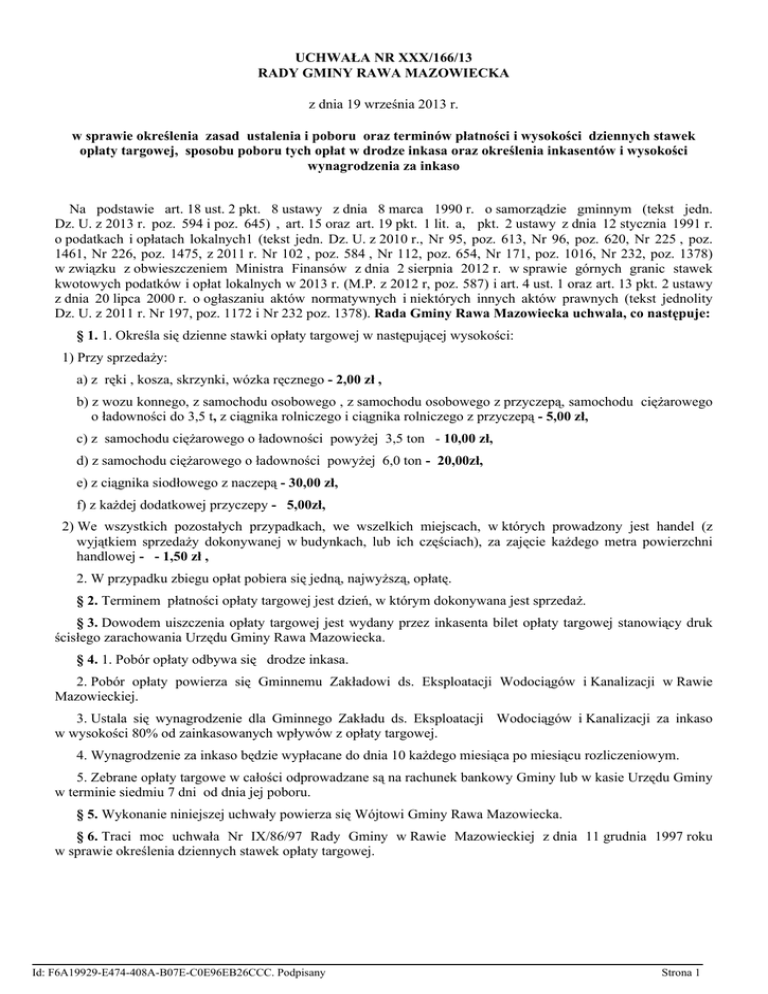 UCHWAŁA NR XXX/166/13 RADY GMINY RAWA MAZOWIECKA z dnia 19 września 2013 r. w sprawie określenia zasad ustalenia i poboru oraz terminów płatności i wysokości dziennych stawek opłaty targowej, sposobu poboru tych opłat w drodze inkasa oraz określenia inkasentów i wysokości wynagrodzenia za inkaso Na podstawie art. 18 ust. 2 pkt. 8 ustawy z dnia 8 marca 1990 r. o samorządzie gminnym (tekst jedn. Dz. U. z 2013 r. poz. 594 i poz. 645) , art. 15 oraz art. 19 pkt. 1 lit. a, pkt. 2 ustawy z dnia 12 stycznia 1991 r. o podatkach i opłatach lokalnych1 (tekst jedn. Dz. U. z 2010 r., Nr 95, poz. 613, Nr 96, poz. 620, Nr 225 , poz. 1461, Nr 226, poz. 1475, z 2011 r. Nr 102 , poz. 584 , Nr 112, poz. 654, Nr 171, poz. 1016, Nr 232, poz. 1378) w związku z obwieszczeniem Ministra Finansów z dnia 2 sierpnia 2012 r. w sprawie górnych granic stawek kwotowych podatków i opłat lokalnych w 2013 r. (M.P. z 2012 r, poz. 587) i art. 4 ust. 1 oraz art. 13 pkt. 2 ustawy z dnia 20 lipca 2000 r. o ogłaszaniu aktów normatywnych i niektórych innych aktów prawnych (tekst jednolity Dz. U. z 2011 r. Nr 197, poz. 1172 i Nr 232 poz. 1378). Rada Gminy Rawa Mazowiecka uchwala, co następuje: § 1. 1. Określa się dzienne stawki opłaty targowej w następującej wysokości: 1) Przy sprzedaży: a) z ręki , kosza, skrzynki, wózka ręcznego - 2,00 zł , b) z wozu konnego, z samochodu osobowego , z samochodu osobowego z przyczepą, samochodu ciężarowego o ładowności do 3,5 t, z ciągnika rolniczego i ciągnika rolniczego z przyczepą - 5,00 zł, c) z samochodu ciężarowego o ładowności powyżej 3,5 ton - 10,00 zł, d) z samochodu ciężarowego o ładowności powyżej 6,0 ton - 20,00zł, e) z ciągnika siodłowego z naczepą - 30,00 zł, f) z każdej dodatkowej przyczepy - 5,00zł, 2) We wszystkich pozostałych przypadkach, we wszelkich miejscach, w których prowadzony jest handel (z wyjątkiem sprzedaży dokonywanej w budynkach, lub ich częściach), za zajęcie każdego metra powierzchni handlowej - - 1,50 zł , 2. W przypadku zbiegu opłat pobiera się jedną, najwyższą, opłatę. § 2. Terminem płatności opłaty targowej jest dzień, w którym dokonywana jest sprzedaż. § 3. Dowodem uiszczenia opłaty targowej jest wydany przez inkasenta bilet opłaty targowej stanowiący druk ścisłego zarachowania Urzędu Gminy Rawa Mazowiecka. § 4. 1. Pobór opłaty odbywa się drodze inkasa. 2. Pobór opłaty powierza się Gminnemu Zakładowi ds. Eksploatacji Wodociągów i Kanalizacji w Rawie Mazowieckiej. 3. Ustala się wynagrodzenie dla Gminnego Zakładu ds. Eksploatacji Wodociągów i Kanalizacji za inkaso w wysokości 80% od zainkasowanych wpływów z opłaty targowej. 4. Wynagrodzenie za inkaso będzie wypłacane do dnia 10 każdego miesiąca po miesiącu rozliczeniowym. 5. Zebrane opłaty targowe w całości odprowadzane są na rachunek bankowy Gminy lub w kasie Urzędu Gminy w terminie siedmiu 7 dni od dnia jej poboru. § 5. Wykonanie niniejszej uchwały powierza się Wójtowi Gminy Rawa Mazowiecka. § 6. Traci moc uchwała Nr IX/86/97 Rady Gminy w Rawie Mazowieckiej z dnia 11 grudnia 1997 roku w sprawie określenia dziennych stawek opłaty targowej. Id: F6A19929-E474-408A-B07E-C0E96EB26CCC. Podpisany Strona 1 § 7. Uchwała wchodzi w życie po upływie 14 dni od dnia ogłoszenia w Dzienniku Urzędowym Województwa Łódzkiego. Przewodniczący Rady Gminy Rawa Mazowiecka Tadeusz Pazurek Id: F6A19929-E474-408A-B07E-C0E96EB26CCC. Podpisany Strona 2