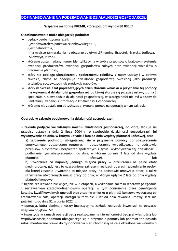 DOFINANSOWANIE NA PODEJMOWANIE DZIAŁALNOŚCI GOSPODARCZEJ Wsparcie ma formę PREMII, której poziom wynosi 80 000 zł. O dofinansowanie może ubiegać się podmiot: będący osobą fizyczną jeżeli: - jest obywatelem państwa członkowskiego UE, - jest pełnoletnia, - ma miejsce zamieszkania na obszarze objętym LSR (gminy: Brzostek, Brzyska, Jodłowa, Skołyszyn, Pilzno), któremu został nadany numer identyfikacyjny w trybie przepisów o krajowym systemie ewidencji producentów, ewidencji gospodarstw rolnych oraz ewidencji wniosków o przyznanie płatności, który nie podlega ubezpieczeniu społecznemu rolników z mocy ustawy i w pełnym zakresie, chyba że podejmuje działalność gospodarczą określoną jako produkcja artykułów spożywczych lub produkcja napojów, który w okresie 2 lat poprzedzających dzień złożenia wniosku o przyznanie tej pomocy nie wykonywał działalności gospodarczej, do której stosuje się przepisy ustawy z dnia 2 lipca 2004 r. o swobodzie działalności gospodarczej, w szczególności nie był wpisany do Centralnej Ewidencji i Informacji o Działalności Gospodarczej, któremu nie została mu dotychczas przyznana pomoc na operację w tym zakresie. Operacja w zakresie podejmowania działalności gospodarczej: • zakłada podjęcie we własnym imieniu działalności gospodarczej, do której stosuje się przepisy ustawy z dnia 2 lipca 2004 r. o swobodzie działalności gospodarczej, jej wykonywanie do dnia, w którym upłynie 2 lata od dnia wypłaty płatności końcowej, oraz a) zgłoszenie podmiotu ubiegającego się o przyznanie pomocy do ubezpieczenia emerytalnego, ubezpieczeń rentowych i ubezpieczenia wypadkowego na podstawie przepisów o systemie ubezpieczeń społecznych z tytułu wykonywania tej działalności i podleganie tym ubezpieczeniom do dnia, w którym upłynie 2 lata od dnia wypłaty płatności końcowej, lub b) utworzenie co najmniej jednego miejsca pracy w przeliczeniu na pełne etaty średnioroczne, gdy jest to uzasadnione zakresem realizacji operacji, zatrudnienie osoby, dla której zostanie utworzone to miejsce pracy, na podstawie umowy o pracę, a także utrzymanie utworzonych miejsc pracy do dnia, w którym upłynie 2 lata od dnia wypłaty płatności końcowej; • będzie realizowana nie więcej niż w 2 etapach, a wykonanie zakresu rzeczowego zgodnie z zestawieniem rzeczowo-finansowym operacji, w tym poniesienie przez beneficjenta kosztów kwalifikowalnych operacji oraz złożenie wniosku o płatność końcową wypłacaną po zrealizowaniu całej operacji, nastąpi w terminie 2 lat od dnia zawarcia umowy, lecz nie później niż do dnia 31 grudnia 2022 r.; • operacja, która obejmuje koszty inwestycyjne, zakłada realizację inwestycji na obszarze wiejskim objętym LSR; • inwestycje w ramach operacji będą realizowane na nieruchomości będącej własnością lub współwłasnością podmiotu ubiegającego się o przyznanie pomocy lub podmiot ten posiada udokumentowane prawo do dysponowania nieruchomością na cele określone we wniosku o 1 przyznanie pomocy co najmniej przez okres realizacji operacji oraz okres podlegania zobowiązaniu do zapewnienia trwałości operacji; • jest uzasadniona ekonomicznie i będzie realizowana zgodnie z biznesplanem; • jej realizacja nie jest możliwa bez udziału środków publicznych; • została wydana ostateczna decyzja środowiskowa, jeżeli jej wydanie jest wymagane przepisami odrębnymi; • koszty kwalifikowalne operacji nie są współfinansowane z innych środków publicznych; • kwota pomocy wynosi 80 tys. złotych (zgodnie z LSR); • minimalna całkowita wartość operacji wynosi nie mniej niż 50 tys. złotych. Do kosztów kwalifikowanych zalicza się następujące koszty dotyczące operacji: 1) ogólne (związane z wydatkami dot. budowy, nabycia nieruchomości, maszyn, takie jak honoraria architektów, inżynierów, opłaty za konsultacje, opłaty za doradztwo w zakresie zrównoważenia środowiskowego i gospodarczego, w tym studia wykonalności), 2) zakupu robót budowlanych lub usług, 3) zakupu lub rozwoju oprogramowania komputerowego oraz zakupu patentów, licencji lub wynagrodzeń za przeniesienie autorskich praw majątkowych lub znaków towarowych, 4) najmu lub dzierżawy maszyn, wyposażenia lub nieruchomości, 5) zakupu nowych maszyn lub wyposażenia, 6) zakupu środków transportu, z wyłączeniem zakupu samochodów osobowych przeznaczonych do przewozu mniej niż 8 osób łącznie z kierowcą, 7) zakupu rzeczy innych niż wymienione w pkt 5 i 6, w tym materiałów, 9) podatku od towarów i usług (VAT), z wyjątkiem podatku, który można odzyskać na mocy prawodawstwa krajowego VAT, - które są uzasadnione zakresem operacji, niezbędne do osiągnięcia jej celu oraz racjonalne. Przy ustalaniu wysokości pomocy koszty ogólne są uwzględniane w wysokości nieprzekraczającej 10% pozostałych kosztów kwalifikowalnych operacji, a koszty zakupu środków transportu - w wysokości nieprzekraczającej 30% pozostałych kosztów kwalifikowalnych operacji, pomniejszonych o koszty ogólne. Lokalne kryteria wyboru premiują operacje, które w możliwie największym stopniu przyczyniać się będą do realizacji wskaźników zawartych w LSR. Kryteria te będą premiować operacje które: ─ są realizowane przez grupy defaworyzowane (młodzi do 25 lat, osoby niepełnosprawne, osoby długotrwale bezrobotne, osoby w wieku 50+) lub przewidują zatrudnienie ww. grup defaworyzowanych, ─ wykorzystują lokalne zasoby (kulturowe, historyczne, przyrodnicze, lokalne produkty), ─ wpływają na rozwój turystyki obszaru LGD, ─ są innowacyjne (zastosowanie lub wprowadzenie nowych lub ulepszonych produktów, procesów (technologii), metod organizacji lub marketingu przez wykorzystanie nie praktykowanych dotąd lokalnie rozwiązań technologicznych lub rozwiązań wykorzystujących lokalne zasoby, lokalny potencjał), ─ wykorzystują odnawialne źródła energii, 
