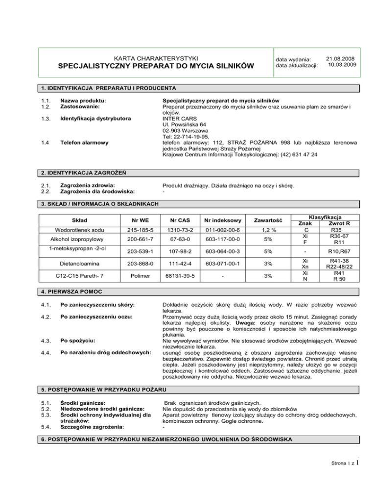 KARTA CHARAKTERYSTYKI data wydania: data aktualizacji: SPECJALISTYCZNY PREPARAT DO MYCIA SILNIKÓW 21.08.2008 10.03.2009 1. IDENTYFIKACJA PREPARATU I PRODUCENTA 1.1. 1.2. Nazwa produktu: Zastosowanie: 1.3. Identyfikacja dystrybutora 1.4 Telefon alarmowy Specjalistyczny preparat do mycia silników Preparat przeznaczony do mycia silników oraz usuwania plam ze smarów i olejów. INTER CARS Ul. Powsińska 64 02-903 Warszawa Tel: 22-714-19-95, telefon alarmowy: 112, STRAŻ POŻARNA 998 lub najbliższa terenowa jednostka Państwowej Straży Pożarnej Krajowe Centrum Informacji Toksykologicznej: (42) 631 47 24 2. IDENTYFIKACJA ZAGROŻEŃ 2.1. 2.2. Zagrożenia zdrowia: Zagrożenia dla środowiska: Produkt drażniący. Działa drażniąco na oczy i skórę. - 3. SKŁAD / INFORMACJA O SKŁADNIKACH Skład Nr WE Nr CAS Nr indeksowy Zawartość Wodorotlenek sodu 215-185-5 1310-73-2 011-002-00-6 1,2 % Alkohol izopropylowy 200-661-7 67-63-0 603-117-00-0 5% 203-539-1 107-98-2 603-064-00-3 5% Dietanoloamina 203-868-0 111-42-4 603-071-00-1 3% C12-C15 Pareth- 7 Polimer 68131-39-5 - 3% 1-metoksypropan -2-ol Klasyfikacja Znak Zwrot R C R35 Xi R36-67 F R11 - R10,R67 Xi Xn Xi N R41-38 R22-48/22 R41 R 50 4. PIERWSZA POMOC 4.1. Po zanieczyszczeniu skóry: 4.2. Po zanieczyszczeniu oczu: 4.3. Po spożyciu: 4.4. Po narażeniu dróg oddechowych: Dokładnie oczyścić skórę dużą ilością wody. W razie potrzeby wezwać lekarza. Przemywać oczy dużą ilością wody przez około 15 minut. Zasięgnąć porady lekarza najlepiej okulisty. Uwaga: osoby narażone na skażenie oczu powinny być pouczone o konieczności i sposobie ich natychmiastowego płukania. Nie wywoływać wymiotów. Nie stosować środków zobojętniających. Wezwać niezwłocznie lekarza. usunąć osobę poszkodowaną z obszaru zagrożenia zachowując własne bezpieczeństwo. Zapewnić dostęp świeżego powietrza. Chronić przed utratą ciepła. Jeżeli poszkodowany jest nieprzytomny, należy ułożyć go w pozycji bezpiecznej i kontrolować oddech. Zastosować sztuczne oddychanie, jeżeli poszkodowany nie oddycha. Niezwłocznie wezwać lekarza. 5. POSTĘPOWANIE W PRZYPADKU POŻARU 5.1. 5.2. 5.3. 5.4. Środki gaśnicze: Niedozwolone środki gaśnicze: Środki ochrony indywidualnej dla strażaków: Szczególne zagrożenia: Brak ograniczeń środków gaśniczych. Nie dopuścić do przedostania się wody do zbiorników Aparat powietrzny tlenowy izolujący służący do ochrony dróg oddechowych, kombinezon ochronny. Gogle ochronne. - 6. POSTĘPOWANIE W PRZYPADKU NIEZAMIERZONEGO UWOLNIENIA DO ŚRODOWISKA P. Kutyła Strona 1 z 1 KARTA CHARAKTERYSTYKI SPECJALISTYCZNY PREPARAT DO MYCIA SILNIKÓW 6.1. Środki ochrony osobistej: 6.2. Środki ochrony środowiska: 6.3. Usuwanie zanieczyszczeń: data wydania: data aktualizacji: 21.08.2008 10.03.2009 ochronę osobistą powinny stanowić ubrania ochronne, rękawice gumowe oraz hełm z osłoną części twarzowej lub część twarzowa maski przeciw gazowej lub okulary szczelnie przylegające do twarzy. Nie wdychać par. Zapewnić wentylację. zlokalizować miejsce wycieku i przystąpić do jego likwidacji unikając zbędnego ryzyka. Zabezpieczyć przez uszczelnienie, teren na którym wystąpił wyciek przed możliwością rozprzestrzeniania. Unikać tworzenia i wdychania oparów. Pokryć piaskiem lub ziemią. Zebrać do szczelnie zamkniętych , oznakowanych pojemników i przekazać do utylizacji. Zanieczyszczoną powierzchnię zobojętnić kwasem siarkowym , spłukać dużą ilością wody. 7. POSTĘPOWANIE Z SUBSTANCJĄ / PREPARATEM I JEJ / JEGO MAGAZYNOWANIE 7.1. Postępowanie z substancją: 7.2. Magazynowanie: nie dopuszczać do rozlania, kontaktu z oczami, skórą i oblania odzieży. Unikać wdychania oparów. Stosować sprawną wentylację pomieszczeń. Postępować zgodnie z zasadami bezpieczeństwa i higieny pracy. przechowywać w oryginalnych, szczelnie zamkniętych opakowaniach, w suchych i przewiewnych pomieszczeniach magazynowych, w temperaturze powyżej 10 C. Przestrzegać zasad gospodarki magazynowej. Podjąć niezbędne środki w celu uniknięcia przedostania się preparatu do kanalizacji, zbiorników wodnych, rzek, wód gruntowych i do gleby z powodu rozszczelnienia się opakowań lub systemów przesyłowych. Stosować zgodnie z przeznaczeniem. Chronić przed wilgocią . 8. KONTROLA NARAŻENIA I ŚRODKI OCHRONY INDYWIDUALNEJ Stosowane środki ochrony indywidualnej powinny spełniać wymogi Rozporządzenia Ministra Gospodarki z dnia 21 grudnia 2005 r. w sprawie zasadniczych wymagań dla środków ochrony indywidualnej (Dz.U. 2005 nr 259, poz. 2173). Środki ochrony osobistej należy oczyścić w celu ponownego użycia. 8.1. 8.3. 8.4. NDS dla NaOH NDSCh dla NaOH NDS dla alkoholu izopropylowego NDSChdla alkoholu izopropylowego Kontrola narażenia w miejscu pracy: Środki ochrony indywidualnej: 3 0,5 mg/m 1,0 3 mg/m 900 mg/m 1200 3 3 mg/m Wentylacja miejscowa wywiewna oraz wentylacja ogólna pomieszczenia. Unikać kontaktu z oczami. Rękawice ochronne gumowe, okulary ochronne, odpowiednia odzież ochronna i obuwie ochronne. Udostępnić myjkę do mycia oczu lub możliwość szybkiego przemycia oczu. 9. WŁAŚCIWOŚCI FIZYCZNE I CHEMICZNE 9.1. 9.2. 9.3. 9.4. 9.5. 9.6. 9.7. 9.8. 9.9. 9.10. 9.11. 9.12. 9.13. 9.14. 9.15. 9.16. Postać: Barwa: Zapach: pH: Temperatura wrzenia: Temperatura topnienia: Temperatura zapłonu: Temperatura samozapłonu: Palność: Granice wybuchowości: Właściwości utleniające: Prężność par w 20C: Gęstość w 20C: Rozpuszczalność w wodzie: Rozpuszczalność w innych rozpuszczalnikach: Lepkość w 25 C ciecz Jasnożółta do brązowej Charakterystyczny dla użytych składników Około 8,5 – 9,5 Nie dotyczy Nie ustalone nie ustalone nie stwarza zagrożenia wybuchowego Nie ustalone Nie ustalone Nie ustalone Całkowicie rozpuszczalny w wodzie - Strona 2 z 5 KARTA CHARAKTERYSTYKI SPECJALISTYCZNY PREPARAT DO MYCIA SILNIKÓW data wydania: data aktualizacji: 21.08.2008 10.0