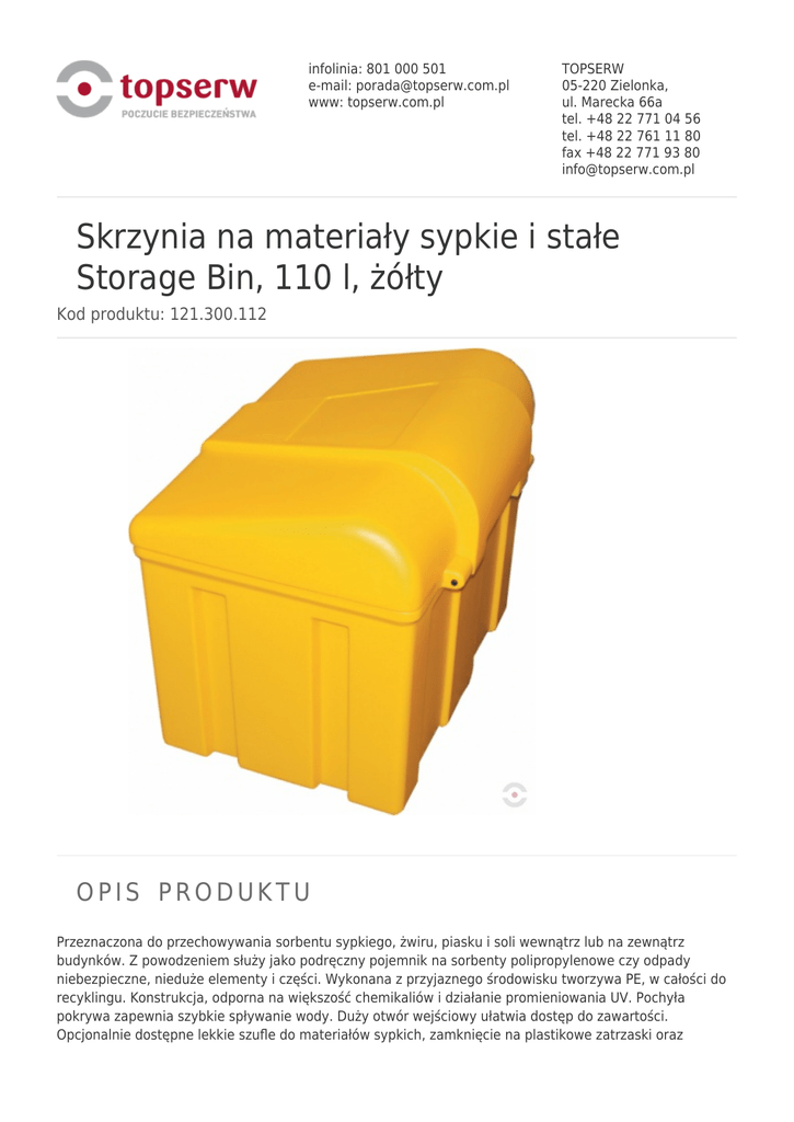 infolinia: 801 000 501 e-mail: [email protected] www: topserw.com.pl TOPSERW 05-220 Zielonka, ul. Marecka 66a tel. +48 22 771 04 56 tel. +48 22 761 11 80 fax +48 22 771 93 80 [email protected] Skrzynia na materiały sypkie i stałe Storage Bin, 110 l, żółty Kod produktu: 121.300.112 OPIS PRODUKTU Przeznaczona do przechowywania sorbentu sypkiego, żwiru, piasku i soli wewnątrz lub na zewnątrz budynków. Z powodzeniem służy jako podręczny pojemnik na sorbenty polipropylenowe czy odpady niebezpieczne, nieduże elementy i części. Wykonana z przyjaznego środowisku tworzywa PE, w całości do recyklingu. Konstrukcja, odporna na większość chemikaliów i działanie promieniowania UV. Pochyła pokrywa zapewnia szybkie spływanie wody. Duży otwór wejściowy ułatwia dostęp do zawartości. Opcjonalnie dostępne lekkie szufle do materiałów sypkich, zamknięcie na plastikowe zatrzaski oraz możliwość umieszczenia loga firmowego na pokrywie. Wymiary W*S*G 570 x 650 x 500 mm, waga 8 kg, pojemność 110 l, kolor żółty. DANE TECHNICZNE AKCESORIA Lekka szufla teleskopowa, uchwyt mocujący, czerwony 121.399.005 Lekka szufla teleskopowa, b/uchwytu mocującego, czerwony 121.399.004 Lekka szufla składana 121.399.003 POWIĄZANE Produkt Waga [kg] Pojemność [l] Wymiary W*S*G [mm] Kolor Skrzynia na materiały sypkie i stałe Storage Bin, 110 l, żółty -- -- -- -- Skrzynia na materiały sypkie i stałe Storage Bin, 110 l, zielony -- -- -- -- Skrzynia na materiały sypkie i stałe Storage Bin, 110 l, czerwony -- -- -- --