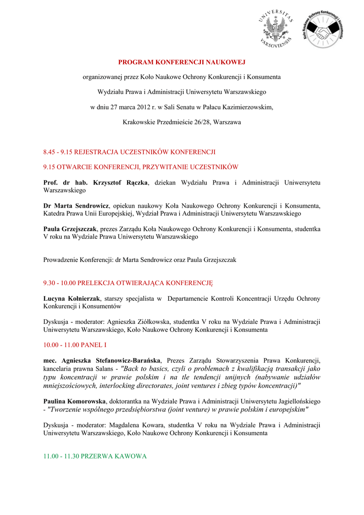PROGRAM KONFERENCJI NAUKOWEJ organizowanej przez Koło Naukowe Ochrony Konkurencji i Konsumenta Wydziału Prawa i Administracji Uniwersytetu Warszawskiego w dniu 27 marca 2012 r. w Sali Senatu w Pałacu Kazimierzowskim, Krakowskie Przedmieście 26/28, Warszawa 8.45 - 9.15 REJESTRACJA UCZESTNIKÓW KONFERENCJI 9.15 OTWARCIE KONFERENCJI, PRZYWITANIE UCZESTNIKÓW Prof. dr hab. Krzysztof Rączka, dziekan Wydziału Prawa i Administracji Uniwersytetu Warszawskiego Dr Marta Sendrowicz, opiekun naukowy Koła Naukowego Ochrony Konkurencji i Konsumenta, Katedra Prawa Unii Europejskiej, Wydział Prawa i Administracji Uniwersytetu Warszawskiego Paula Grzejszczak, prezes Zarządu Koła Naukowego Ochrony Konkurencji i Konsumenta, studentka V roku na Wydziale Prawa Uniwersytetu Warszawskiego Prowadzenie Konferencji: dr Marta Sendrowicz oraz Paula Grzejszczak 9.30 - 10.00 PRELEKCJA OTWIERAJĄCA KONFERENCJĘ Lucyna Kołnierzak, starszy specjalista w Departamencie Kontroli Koncentracji Urzędu Ochrony Konkurencji i Konsumentów Dyskusja - moderator: Agnieszka Ziółkowska, studentka V roku na Wydziale Prawa i Administracji Uniwersytetu Warszawskiego, Koło Naukowe Ochrony Konkurencji i Konsumenta 10.00 - 11.00 PANEL I mec. Agnieszka Stefanowicz-Barańska, Prezes Zarządu Stowarzyszenia Prawa Konkurencji, kancelaria prawna Salans - "Back to basics, czyli o problemach z kwalifikacją transakcji jako typu koncentracji w prawie polskim i na tle tendencji unijnych (nabywanie udziałów mniejszościowych, interlocking directorates, joint ventures i zbieg typów koncentracji)" Paulina Komorowska, doktorantka na Wydziale Prawa i Administracji Uniwersytetu Jagiellońskiego - "Tworzenie wspólnego przedsiębiorstwa (joint venture) w prawie polskim i europejskim" Dyskusja - moderator: Magdalena Kowara, studentka V roku na Wydziale Prawa i Administracji Uniwersytetu Warszawskiego, Koło Naukowe Ochrony Konkurencji i Konsumenta 11.00 - 11.30 PRZERWA KAWOWA 11.30 - 12.30 PANEL II dr Małgorzata Kozak, Wydział Prawa i Administracji Uczelni Łazarskiego - "Kontrola koncentracji spółek, w których właścicielem jest Skarb Państwa" Maciej Syska, doktorant w Katedrze Prawa Cywilnego na Wydziale Prawa i Administracji Uniwersytetu Warszawskiego - "Deliktowa (pozaumowna) odpowiedzialność Unii Europejskiej i Skarbu Państwa za szkodę wynikającą z niezgodnych z prawem decyzji zakazujących koncentracji" Dyskusja - moderator: Adrian Ziółkowski, student IV roku na Wydziale Prawa i Administracji Uniwersytetu Warszawskiego, Koło Naukowe Ochrony Konkurencji i Konsumenta 12.30 - 13.30 PANEL III dr Marta Sendrowicz, Katedra Prawa Unii Europejskiej, Wydział Prawa i Administracji Uniwersytetu Warszawskiego - "Zagadnienie wymiany informacji w procesie zgłoszenia zamiaru koncentracji do organu ochrony konkurencji" Szymon Syp, doktorant w Zakładzie Prawa Międzynarodowego oraz Ochrony Konkurencji i Konsumenta w Szkole Głównej Handlowej - "Analiza ekonomiczna w procesie badania kontroli koncentracji na przykładzie tzw. doktryny upadającej firmy" Dyskusja - moderator: Agnieszka Kolasińska, studentka V roku na Wydziale Prawa i Administracji Uniwersytetu Warszawskiego, Koło Naukowe Ochrony Konkurencji i Konsumenta 13.30 - 14.30 PRZERWA, LUNCH 14.30 - 15.30 PANEL IV mec. Małgorzata Szwaj, kancelaria prawna Linklaters - "Decyzja warunkowa w sprawach koncentracji" Ewa Lewandowska, studentka na Wydziale Prawa i Administracji Uniwersytetu Łódzkiego - "System odsyłania spraw między Komisją Europejską a organami ochrony konkurencji państw członkowskich jako element współpracy organów krajowych i unijnych w sprawach kontroli koncentracji przedsiębiorstw" Dyskusja – moderator: Jan Fotek, student V roku na Wydziale Prawa i Administracji Uniwersytetu Warszawskiego, Koło Naukowe Ochrony Konkurencji i Konsumenta 15.30 - 16.00 ROZWIĄZANIE KONKURSU NA NAJLEPSZE ROZWIĄZANIE KAZUSU POŚWIĘCONEGO WYBRANYM ZAGADNIENIOM KONTROLI KONCENTRACJI Wyłonienie zwycięzcy, zaprezentowanie rozwiązania kazusu przez zwycięzcę, wręczenie nagród prowadząca: Dominika Strupiechowska, studentka V roku na Wydziale Prawa i Administracji Uniwersytetu Warszawskiego, Koło Naukowe Ochrony Konkurencji i Konsumenta 16.15 – 16.30 O DZIAŁALNOŚCI NAUKOWEJ – INSTYTUT ALLERHANDA dr Wojciech Rogowski, Wiceprezes Zarządu Instytutu Allerhanda, ekspert w Instytucie Ekonomicznym NBP, adiunkt w Kolegium Gospodarki Światowej w Szkole Głównej Handlowej w Warszawie 16.15 ZAKOŃCZENIE KONFERENCJI prowadzący: Jan Polański, student IV roku na Wydziale Prawa i Administracji Uniwersytetu Warszawskiego oraz Olimpia Borowska, studentka V roku na Wydziale Prawa i Administracji Uniwersytetu Warszawskiego, Koło Naukowe Ochrony Konkurencji i Konsumenta