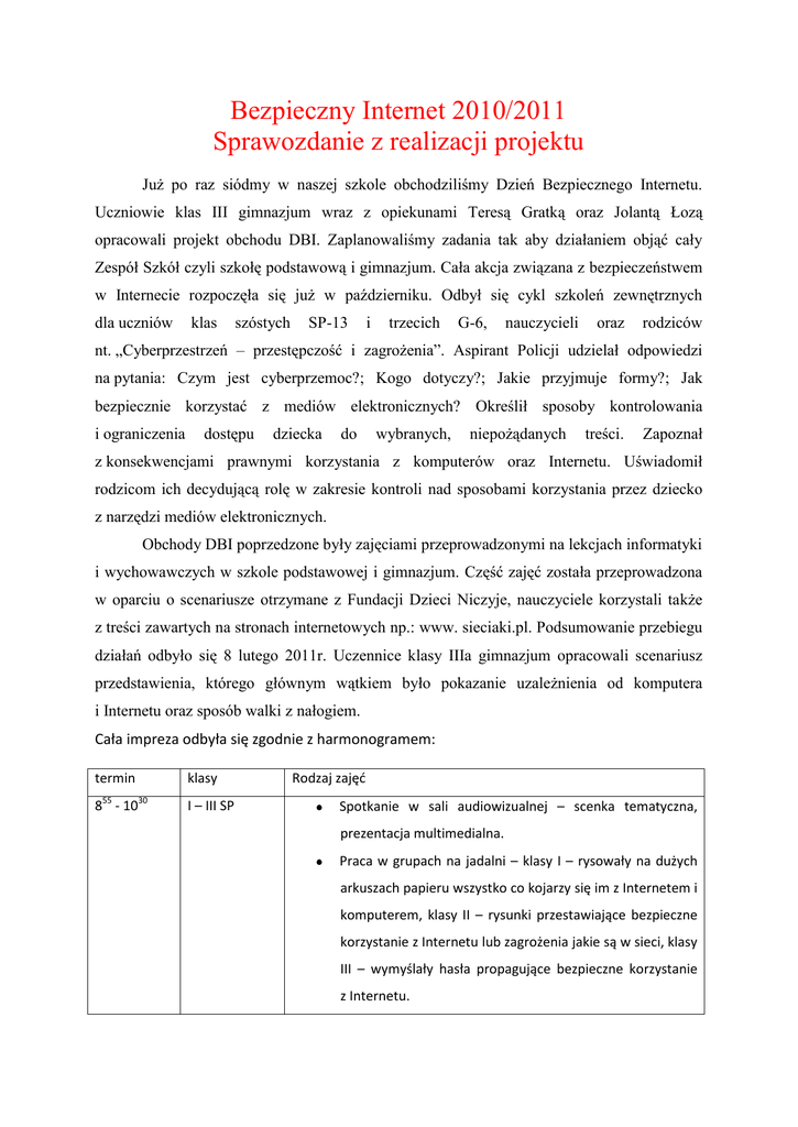 Bezpieczny Internet 2010/2011 Sprawozdanie z realizacji projektu