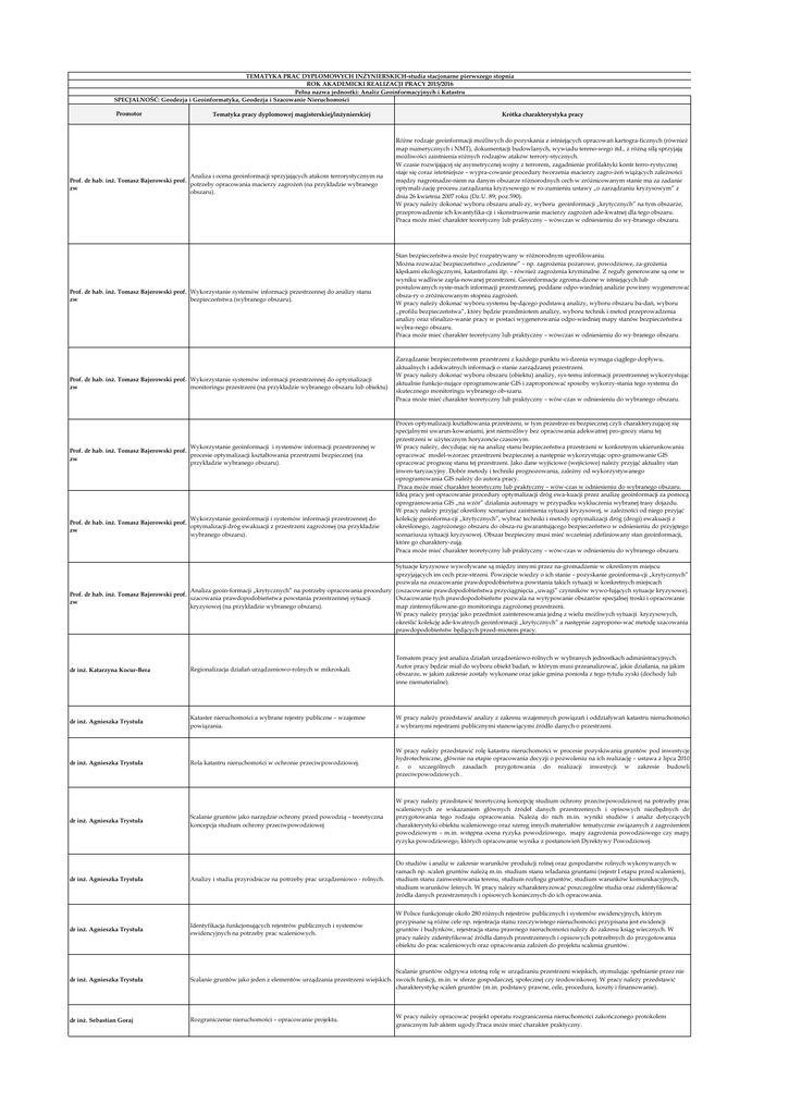 TEMATYKA PRAC DYPLOMOWYCH INŻYNIERSKICH-studia stacjonarne pierwszego stopnia ROK AKADEMICKI REALIZACJI PRACY 2015/2016 Pełna nazwa jednostki: Analiz Geoinformacyjnych i Katastru SPECJALNOŚĆ: Geodezja i Geoinformatyka, Geodezja i Szacowanie Nieruchomości Promotor Tematyka pracy dyplomowej magisterskiej/inżynierskiej Analiza i ocena geoinformacji sprzyjających atakom terrorystycznym na Prof. dr hab. inż. Tomasz Bajerowski prof. potrzeby opracowania macierzy zagrożeń (na przykładzie wybranego zw obszaru). Prof. dr hab. inż. Tomasz Bajerowski prof. Wykorzystanie systemów informacji przestrzennej do analizy stanu zw bezpieczeństwa (wybranego obszaru). Prof. dr hab. inż. Tomasz Bajerowski prof. Wykorzystanie systemów informacji przestrzennej do optymalizacji zw monitoringu przestrzeni (na przykładzie wybranego obszaru lub obiektu) Wykorzystanie geoinformacji i systemów informacji przestrzennej w Prof. dr hab. inż. Tomasz Bajerowski prof. procesie optymalizacji kształtowania przestrzeni bezpiecznej (na zw przykładzie wybranego obszaru). Wykorzystanie geoinformacji i systemów informacji przestrzennej do Prof. dr hab. inż. Tomasz Bajerowski prof. optymalizacji dróg ewakuacji z przestrzeni zagrożonej (na przykładzie zw wybranego obszaru). Krótka charakterystyka pracy Różne rodzaje geoinformacji możliwych do pozyskania z istniejących opracowań kartogra-ficznych (również map numerycznych i NMT), dokumentacji budowlanych, wywiadu tereno-wego itd., z różną siłą sprzyjają możliwości zaistnienia różnych rodzajów ataków terrory-stycznych. W czasie rozwijającej się asymetrycznej wojny z terrorem, zagadnienie profilaktyki kontr terro-rystycznej staje się coraz istotniejsze – wypra-cowanie procedury tworzenia macierzy zagro-żeń wiążących zależności między nagromadze-niem na danym obszarze różnorodnych cech w zróżnicowanym stanie ma za zadanie optymali-zację procesu zarządzania kryzysowego w ro-zumieniu ustawy „o zarządzaniu kryzysowym” z dnia 26 kwietnia 2007 roku (Dz.U. 89; poz.590). W pracy należy dokonać wyboru obszaru anali-zy, wyboru geoinformacji „krytycznych” na tym obszarze, przeprowadzenie ich kwantyfika-cji i skonstruowanie macierzy zagrożeń ade-kwatnej dla tego obszaru. Praca może mieć charakter teoretyczny lub praktyczny – wówczas w odniesieniu do wy-branego obszaru. Stan bezpieczeństwa może być rozpatrywany w różnorodnym uprofilowaniu. Można rozważać bezpieczeństwo „codzienne” – np. zagrożenia pożarowe, powodziowe, za-grożenia klęskami ekologicznymi, katastrofami itp. – również zagrożenia kryminalne. Z reguły generowane są one w wyniku wadliwie zapla-nowanej przestrzeni. Geoinformacje zgroma-dzone w istniejących lub postulowanych syste-mach informacji przestrzennej, poddane odpo-wiedniej analizie powinny wygenerować obsza-ry o zróżnicowanym stopniu zagrożeń. W pracy należy dokonać wyboru systemu bę-dącego podstawą analizy, wyboru obszaru ba-dań, wyboru „profilu bezpieczeństwa”, który będzie przedmiotem analizy, wyboru technik i metod przeprowadzenia analizy oraz sfinalizo-wanie pracy w postaci wygenerowania odpo-wiedniej mapy stanów bezpieczeństwa wybra-nego obszaru. Praca może mieć charakter teoretyczny lub praktyczny – wówczas w odniesieniu do wy-branego obszaru. Zarządzanie bezpieczeństwem przestrzeni z każdego punktu wi-dzenia wymaga ciągłego dopływu, aktualnych i adekwatnych informacji o stanie zarządzanej przestrzeni. W pracy należy dokonać wyboru obszaru (obiektu) analizy, sys-temu informacji przestrzennej wykorzystując aktualnie funkcjo-nujące oprogramowanie GIS i zaproponować sposoby wykorzy-stania tego systemu do skutecznego monitoringu wybranego ob-szaru. Praca może mieć charakter teoretyczny lub praktyczny – wów-czas w odniesieniu do wybranego obszaru. Proces optymalizacji kształtowania przestrzeni, w tym przestrze-ni bezpiecznej czyli charakteryzującej się specjalnymi uwarun-kowaniami, jest niemożliwy bez opracowania adekwatnej pro-gnozy stanu tej przestrzeni w użytecznym horyzoncie czasowym. W pracy należy, decydując się na analizę stanu bezpieczeństwa przestrzeni w konkretnym ukierunkowaniu opracować model-wzorzec przestrzeni bezpiecznej a następnie wykorzystując opro-gramowanie GIS opracować prognozę stanu tej przestrzeni. Jako dane wyjściowe (wejściowe) należy przyjąć aktualny stan inwen-taryzacyjny. Dobór metody i techniki prognozowania, zależny od wykorzystywanego oprogramowania GIS należy do autora pracy. Praca może mieć charakter teoretyczny lub praktyczny – wów-czas w odniesieniu do wybranego obszaru. Ideą pracy jest opracowanie procedury optymalizacji dróg ewa-kuacji przez analizę geoinformacji za pomocą oprogramowania GIS „na wzór” działania automapy w przypadku wykluczenia wybranej trasy dojazdu. W pracy należy przyjąć określony scenariusz zaistnienia sytuacji kryzysowej, w zależności od niego przyjąć kolekcję geoinforma-cji „krytycznych”, wybrać techniki i metody optymalizacji dróg (drogi) ewakuacji z określonego, zagrożonego obszaru do obsza-ru gwarantującego bezpieczeństwo w odniesieniu do przyjętego scenariusza sytuacji kryzysowej. Obszar bezpieczny musi mieć wcześniej zdefiniowany stan geoinformacji, które go charaktery-zują. Praca może mieć charakter teoretyczny lub praktyczny – wów-czas w odniesieniu do wybranego obszaru. Sytuacje kryzysowe wywoływane są między innymi przez na-gromadzenie w określonym miejscu sprzyjających im cech prze-strzeni. Powzięcie wiedzy o ich stanie – pozyskanie geoinforma-cji „krytycznych” pozwala na oszacowanie prawdopodobieństwa powstania takich sytuacji w konkretnych miejscach Analiza geoin-formacji „krytycznych” na potrzeby opracowania procedury (oszacowanie prawdopodobieństwa przyciągnięcia „uwagi” czynników wywo-łujących sytuacje kryzysowe). Prof. dr hab. inż. Tomasz Bajerowski prof. szac