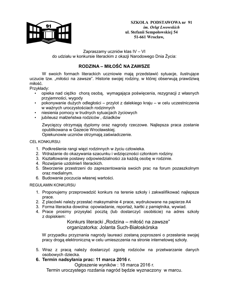 SZKOŁA PODSTAWOWA nr 91 im. Orląt Lwowskich ul. Stefanii Sempołowskiej 54 51-661 Wrocław, Zapraszamy uczniów klas IV – VI do udziału w konkursie literackim z okazji Narodowego Dnia Życia: RODZINA – MIŁOŚĆ NA ZAWSZE W swoich formach literackich uczniowie mają przedstawić sytuacje, ilustrujące uczucie tzw. „miłości na zawsze”. Historie swojej rodziny, w której obserwują prawdziwą miłość. Przykłady: • opieka nad ciężko chorą osobą, wymagająca poświęcenia, rezygnacji z własnych przyjemności, wygody • pokonywanie dużych odległości – przylot z dalekiego kraju – w celu uczestniczenia w ważnych uroczystościach rodzinnych • niesienia pomocy w trudnych sytuacjach życiowych • jubileusz małżeństwa rodziców , dziadków Zwycięzcy otrzymają dyplomy oraz nagrody rzeczowe. Najlepsza praca zostanie opublikowana w Gazecie Wrocławskiej. Opiekunowie uczniów otrzymają zaświadczenie. CEL KONKURSU: Podkreślenie rangi więzi rodzinnych w życiu człowieka. Wdrażanie do okazywania szacunku i wdzięczności członkom rodziny. Kształtowanie postawy odpowiedzialności za każdą osobę w rodzinie. Rozwijanie uzdolnień literackich. Stworzenie przestrzeni do zaprezentowania swoich prac na forum pozaszkolnym oraz medialnym. 6. Budowanie poczucia własnej wartości. 1. 2. 3. 4. 5. REGULAMIN KONKURSU 1. Proponujemy przeprowadzić konkurs na terenie szkoły i zakwalifikować najlepsze prace. 2. Z placówki należy przesłać maksymalnie 4 prace, wydrukowane na papierze A4 3. Forma literacka dowolna: opowiadanie, reportaż, kartki z pamiętnika, wywiad. 4. Prace prosimy przysyłać pocztą (lub dostarczyć osobiście) na adres szkoły z dopiskiem: Konkurs literacki „Rodzina – miłość na zawsze” organizatorka: Jolanta Such-Białoskórska W przypadku przyznania nagrody laureaci zostaną poproszeni o przesłanie swojej pracy drogą elektroniczną w celu umieszczenia na stronie internetowej szkoły. 5. Wraz z pracą należy dostarczyć zgodę rodziców na przetwarzanie danych osobowych dziecka. 6. Termin nadsyłania prac: 11 marca 2016 r. Ogłoszenie wyników : 18 marca 2016 r. Termin uroczystego rozdania nagród będzie wyznaczony w marcu.