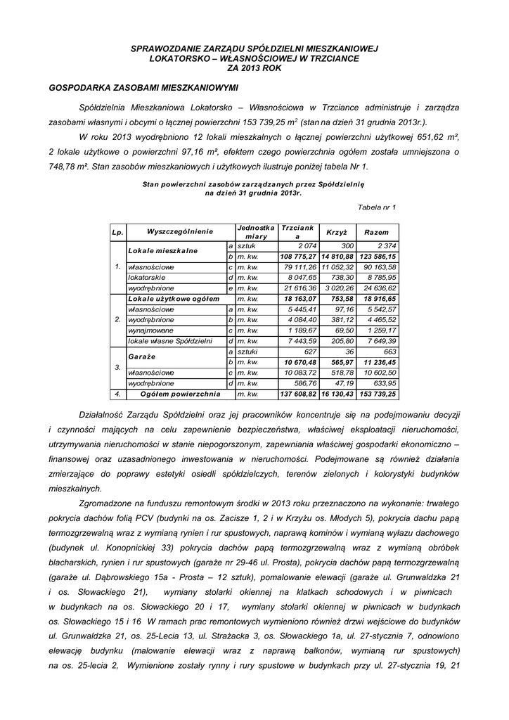 SPRAWOZDANIE ZARZĄDU SPÓŁDZIELNI MIESZKANIOWEJ LOKATORSKO – WŁASNOŚCIOWEJ W TRZCIANCE ZA 2013 ROK GOSPODARKA ZASOBAMI MIESZKANIOWYMI Spółdzielnia Mieszkaniowa Lokatorsko – Własnościowa w Trzciance administruje i zarządza zasobami własnymi i obcymi o łącznej powierzchni 153 739,25 m 2 (stan na dzień 31 grudnia 2013r.). W roku 2013 wyodrębniono 12 lokali mieszkalnych o łącznej powierzchni użytkowej 651,62 m², 2 lokale użytkowe o powierzchni 97,16 m², efektem czego powierzchnia ogółem została umniejszona o 748,78 m². Stan zasobów mieszkaniowych i użytkowych ilustruje poniżej tabela Nr 1. Stan powi erzchni zasobów za rzą dza nych przez Spół dzi el ni ę na dzi eń 31 grudni a 2013r. Tabela nr 1 Lp. Wyszczegól nieni e Lok a le mi eszk a lne 1. Jednostk a mi ary a sztuk Trzci a nk a 2 074 b m. kw. 108 775,27 14 810,88 123 586,15 4. 300 c m. kw. d m. kw. 8 047,65 738,30 8 785,95 wyodrębnione e m. kw. 21 616,36 3 020,26 24 636,62 m. kw. 18 163,07 753,58 18 916,65 własnościowe a m. kw. 5 445,41 97,16 5 542,57 wyodrębnione b m. kw. 4 084,40 381,12 4 465,52 wynajmowane c m. kw. 1 189,67 69,50 1 259,17 lokale własne Spółdzielni d m. kw. 7 443,59 205,80 7 649,39 a sztuki 627 36 663 b m. kw. 10 670,48 565,97 11 236,45 własnościowe c m. kw. 10 083,72 518,78 10 602,50 wyodrębnione d m. kw. 586,76 47,19 633,95 m. kw. Ogół em powierzchni a 79 111,26 11 052,32 2 374 lokatorskie Ga ra że 3. Ra zem własnościowe Lok a le użytk owe ogół em 2. Krzyż 90 163,58 137 608,82 16 130,43 153 739,25 Działalność Zarządu Spółdzielni oraz jej pracowników koncentruje się na podejmowaniu decyzji i czynności mających na celu zapewnienie bezpieczeństwa, właściwej eksploatacji nieruchomości, utrzymywania nieruchomości w stanie niepogorszonym, zapewniania właściwej gospodarki ekonomiczno – finansowej oraz uzasadnionego inwestowania w nieruchomości. Podejmowane są również działania zmierzające do poprawy estetyki osiedli spółdzielczych, terenów zielonych i kolorystyki budynków mieszkalnych. Zgromadzone na funduszu remontowym środki w 2013 roku przeznaczono na wykonanie: trwałego pokrycia dachów folią PCV (budynki na os. Zacisze 1, 2 i w Krzyżu os. Młodych 5), pokrycia dachu papą termozgrzewalną wraz z wymianą rynien i rur spustowych, naprawą kominów i wymianą wyłazu dachowego (budynek ul. Konopnickiej 33) pokrycia dachów papą termozgrzewalną wraz z wymianą obróbek blacharskich, rynien i rur spustowych (garaże nr 29-46 ul. Prosta), pokrycia dachów papą termozgrzewalną (garaże ul. Dąbrowskiego 15a - Prosta – 12 sztuk), pomalowanie elewacji (garaże ul. Grunwaldzka 21 i os. Słowackiego 21), wymiany stolarki okiennej na klatkach schodowych i w piwnicach w budynkach na os. Słowackiego 20 i 17, wymiany stolarki okiennej w piwnicach w budynkach os. Słowackiego 15 i 16 W ramach prac remontowych wymieniono również drzwi wejściowe do budynków ul. Grunwaldzka 21, os. 25-Lecia 13, ul. Strażacka 3, os. Słowackiego 1a, ul. 27-stycznia 7, odnowiono elewację budynku (malowanie elewacji wraz z naprawą balkonów, wymianą rur spustowych) na os. 25-lecia 2, Wymienione zostały rynny i rury spustowe w budynkach przy ul. 27-stycznia 19, 21 i na os.25-Lecia 8. Dokonano naprawy balkonów (obróbki blacharskie, posadzki) w budynku przy ul. Wojska Polskiego 95/97 (16 sztuk). W budynkach przy ul. 27-Stycznia 19, 21 wykonano w piwnicach (korytarze piwniczne, pralnie, suszarnie) nowe posadzki, naprawiono tynki. Na bieżąco naprawiane i konserwowane były: dachy i opierzenia blacharskie, instalacje elektryczne, wodno-kanalizacyjne, centralnego ogrzewania, place zabaw, chodniki i drogi osiedlowe. Jak co roku wymieniono piasek w piaskownicach, przeprowadzono prace malarskie polegające na odnowieniu ławek, zabawek. Pomalowano klatki schodowe i piwnice w budynkach os. 25-Lecia 1, 3, 5, 6, 12, os. Słowackiego 1, 2, 1a, 11 (I-V klatka). Część środków funduszu remontowego przekazano w formie zwrotów mieszkańcom, którzy dokonali wymiany stolarki okiennej w swoich mieszkaniach. Ze środków tego funduszu dokonano również spłaty kredytów (zgodne z harmonogramem), zaciągniętych w latach wcześniejszych z przeznaczeniem na termomodernizację budynków spółdzielczych. Efekty bieżącej działalności to ciekawa i zróżnicowana kolorystyka budynków mieszkalnych spełniających wymagane normy cieplne, lokale mieszkalne wyposażone w elektroniczne podzielniki kosztów oraz wodomierze, a także zmodernizowane place zabaw spełniające unijne normy bezpieczeństwa. To również utrzymanie w należytym stanie i konserwacje dróg osiedlowych i chodników. Zasoby nasze spełniają wymagane warunki, jakim powinny odpowiadać budynki mieszkalne i ich usytuowanie. W celu poprawy estetyki zewnętrznej budynków i osiedli zmieniamy ich otoczenie poprzez nowe nasadzenia oraz nasadzenia uzupełniające już istniejące rabaty. Corocznie nasadzamy rośliny jednoroczne, które cały czas cieszą się dużą popularnością wśród mieszkańców naszych osiedli. Jesienią nasadzamy rośliny cebulowe takie jak: żonkile, tulipany i krokusy, które zaczynają kwitnąć już w marcu. Bratki wysadzamy wczesną wiosną, które kwitną aż do końca maja, a następnie pojawiają się rośliny rabaty II: komarzyce, kocanki, pelargonie i surfinie. Tworzymy kompozycje kwiatowe zgodne z nowymi trendami np. konstrukcje kaskadowe. W zeszłym roku nasadziliśmy również sprawdzone w zieleni miejskiej krzewy i drzewa np. pięciorniki, tawułki japońskie oraz jarzębiny. Zarząd Spółdzielni Mieszkaniowej dysponując środkami pochodzącymi z odpisów na fundusz remontowy wykonuje wyżej wymienione prace modernizacyjne oraz naprawy zgodnie z zaleceniami wynikającymi z rocznych i pięcioletnich przeglądów technicznych budynków i nieruchomości. Plan remontów na dany rok zatwierdzany jest każdorazowo przez Radę Nadzorczą Spółdzielni. Stan funduszu rem