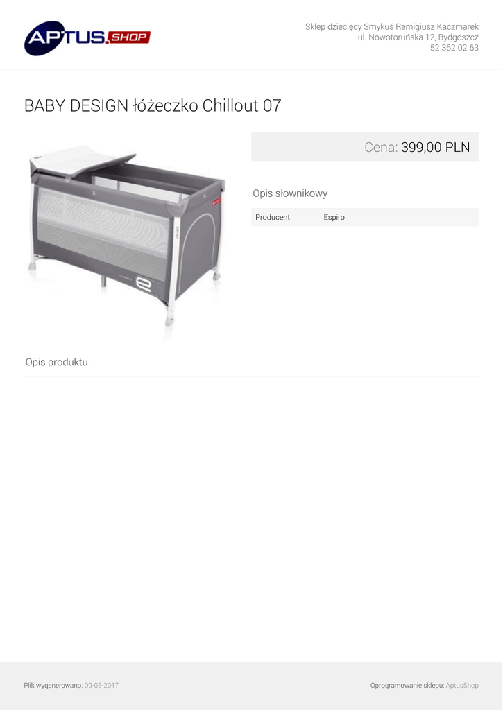 Sklep dziecięcy Smykuś Remigiusz Kaczmarek ul. Nowotoruńska 12, Bydgoszcz 52 362 02 63 BABY DESIGN łóżeczko Chillout 07 Cena: 399,00 PLN Opis słownikowy Producent Espiro Opis produktu Plik wygenerowano: 09-03-2017 Powered by TCPDF (www.tcpdf.org) Oprogramowanie sklepu: AptusShop