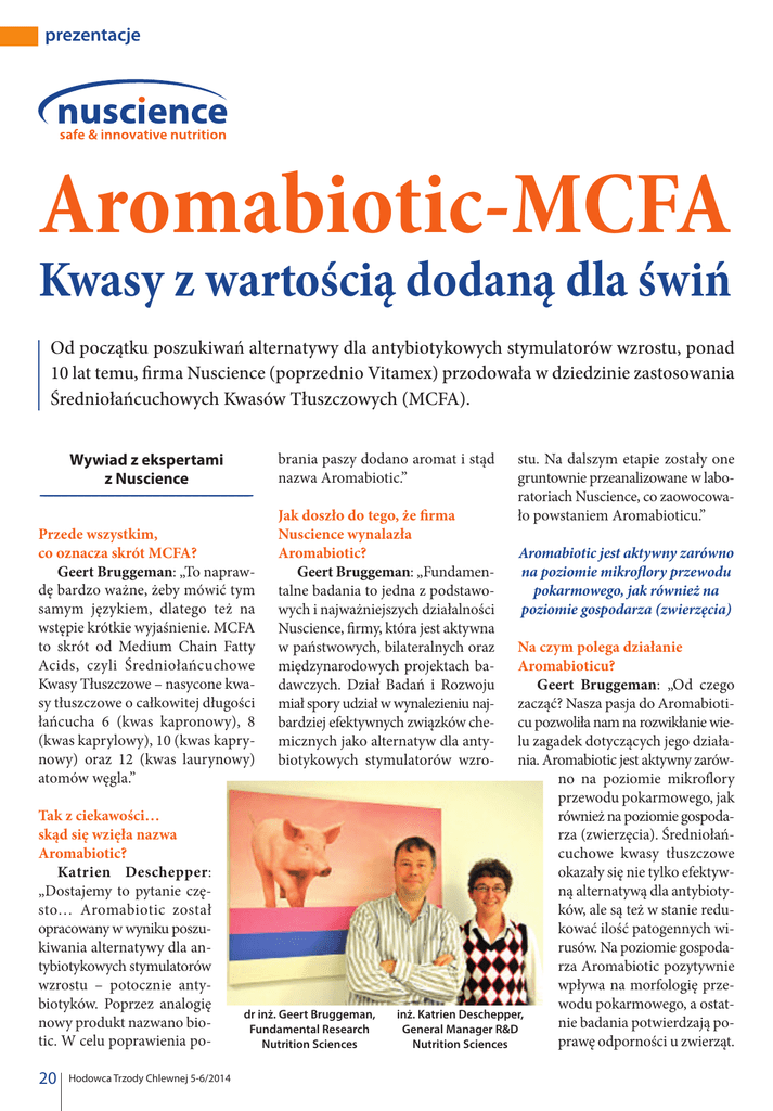prezentacje Aromabiotic-MCFA Kwasy z wartością dodaną dla świń Od początku poszukiwań alternatywy dla antybiotykowych stymulatorów wzrostu, ponad 10 lat temu, firma Nuscience (poprzednio Vitamex) przodowała w dziedzinie zastosowania Średniołańcuchowych Kwasów Tłuszczowych (MCFA). Wywiad z ekspertami z Nuscience ----------------------------------------------------------Przede wszystkim, co oznacza skrót MCFA? Geert Bruggeman: „To naprawdę bardzo ważne, żeby mówić tym samym językiem, dlatego też na wstępie krótkie wyjaśnienie. MCFA to skrót od Medium Chain Fatty Acids, czyli Średniołańcuchowe Kwasy Tłuszczowe – nasycone kwasy tłuszczowe o całkowitej długości łańcucha 6 (kwas kapronowy), 8 (kwas kaprylowy), 10 (kwas kaprynowy) oraz 12 (kwas laurynowy) atomów węgla.” Tak z ciekawości… skąd się wzięła nazwa Aromabiotic? Katrien Deschepper: „Dostajemy to pytanie często… Aromabiotic został opracowany w wyniku poszukiwania alternatywy dla antybiotykowych stymulatorów wzrostu – potocznie antybiotyków. Poprzez analogię nowy produkt nazwano biotic. W celu poprawienia po- 20 Hodowca Trzody Chlewnej 5-6/2014 brania paszy dodano aromat i stąd nazwa Aromabiotic.” Jak doszło do tego, że firma Nuscience wynalazła Aromabiotic? Geert Bruggeman: „Fundamentalne badania to jedna z podstawowych i najważniejszych działalności Nuscience, firmy, która jest aktywna w państwowych, bilateralnych oraz międzynarodowych projektach badawczych. Dział Badań i Rozwoju miał spory udział w wynalezieniu najbardziej efektywnych związków chemicznych jako alternatyw dla antybiotykowych stymulatorów wzro- dr inż. Geert Bruggeman, Fundamental Research Nutrition Sciences stu. Na dalszym etapie zostały one gruntownie przeanalizowane w laboratoriach Nuscience, co zaowocowało powstaniem Aromabioticu.” Aromabiotic jest aktywny zarówno na poziomie mikroflory przewodu pokarmowego, jak również na poziomie gospodarza (zwierzęcia) Na czym polega działanie Aromabioticu? Geert Bruggeman: „Od czego zacząć? Nasza pasja do Aromabioticu pozwoliła nam na rozwikłanie wielu zagadek dotyczących jego działania. Aromabiotic jest aktywny zarówno na poziomie mikroflory przewodu pokarmowego, jak również na poziomie gospodarza (zwierzęcia). Średniołańcuchowe kwasy tłuszczowe okazały się nie tylko efektywną alternatywą dla antybiotyków, ale są też w stanie redukować ilość patogennych wirusów. Na poziomie gospodarza Aromabiotic pozytywnie wpływa na morfologię przewodu pokarmowego, a ostatinż. Katrien Deschepper, nie badania potwierdzają poGeneral Manager R&D prawę odporności u zwierząt. Nutrition Sciences prezentacje Nuscience opracowało wiele Aromabioticów, czy wszystkie są takie same? Katrien Deschepper: „Nie, oczywiście, że nie! Wszystkie wersje Aromabioticu różnią się od siebie. Intensywny proces rozwoju produktu, oparty na doświadczeniach zarówno in vitro jak i in vivo połączone ze studiowaniem literatury fachowej dało efekt w postaci 3 różnych kompozycji. Pierwotnie Aromabiotic został opracowany dla trzody chlewnej. Szerokie spektrum doświadczeń naukowców z Nuscience w dziedzinie żywienia drobiu doprowadziło do opracowania Aromabiotic Poultry, specjalnie zaadoptowanej formuły dla drobiu (głównie brojlerów kurzych i indyków). W tym przypadku korzyści takie jak lepsze wyniki produkcyjne – dzienne przyrosty i wykorzystanie paszy oraz lepsza jakość ściółki zostały potwierdzone w wielu doświadczeniach. Ostatnio odkryto nowe działania MCFA i dzięki temu opracowano Aromabiotic Cattle dla przeżuwaczy.” Z Aromabioticiem Nuscience oferuje czystą, stabilną oraz dobrze zdefiniowaną mieszaninę aktywnych MCFA Hasłem marketingowym Nuscience jest: „Otrzymujesz więcej niż oczekujesz” – dlaczego? Katrien Deschepper: „Musimy przyznać, że to bardzo chwytliwy slogan, ale dzięki Aromabioticowi naprawdę można otrzymać bardzo wiele. Nie tylko wyniki produkcyjne zwierząt poprawiają się bardziej niż byśmy się kiedykolwiek spodziewali, ale w kwestii dalszego rozwoju produktów Nuscience, również otrzymujemy więcej niż oczekujemy. Są one nieustannie poprawiane, dzięki pracy nad nowymi supernowoczesnymi konceptami. Przykładowo w trzodzie, na przykład Aromabiotic-MCFA zosał połączony z innymi koncepcjami i tak powstał produkt Salbiotic, skupiający się na zabezpieczeniu przed infekcją Salmonelli.” Średniołańcuchowe kwasy tłuszczowe są coraz bardziej popularne jako funkcjonalny składnik paszy. Co odróżnia Aromabiotic od pozostałych tego typu produktów? Geert Bruggeman: „Z Aromabioticiem Nuscience oferuje czystą, stabilną oraz dobrze zdefiniowaną mieszaninę akytywnych MCFA. Czystą – dzięki specyfice procesu produkcyjnego, w którym obecne są tylko MCFA, bez żadnych zanieczyszczeń. Stabilną – dzięki nieodłącznej stabilności chemicznej użytych molekuł. Zdefiniowaną – ponieważ dla każdego gatunku zwierząt opracowano własną, optymalną kompozycję. Aktywną – ponieważ Aromabiotic dostarcza MCFA w ich aktywnej formie, dzięki czemu są one w stanie zawsze i natychmiastowo działać. Do aktywacji nie są potrzebneinne substancje biologicznie czynne (jak enzymy). Ostatnią, ale nie mniej ważną kwestią wyróżniającą Aromabiotic jest fakt opatentowania tej aplikacji.” Dawid Kołacz Hodowca Trzody Chlewnej 5-6/2014 21