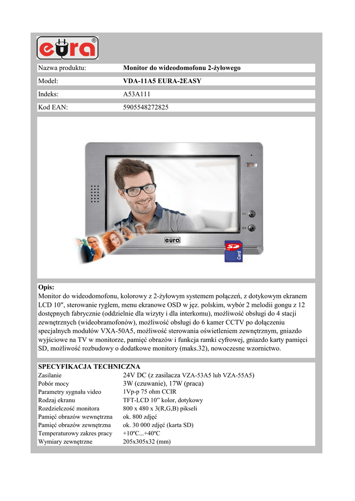 Nazwa produktu: Monitor do wideodomofonu 2-żyłowego Model: VDA-11A5 EURA-2EASY Indeks: A53A111 Kod EAN: 5905548272825 Opis: Monitor do wideodomofonu, kolorowy z 2-żyłowym systemem połączeń, z dotykowym ekranem LCD 10", sterowanie ryglem, menu ekranowe OSD w jęz. polskim, wybór 2 melodii gongu z 12 dostępnych fabrycznie (oddzielnie dla wizyty i dla interkomu), możliwość obsługi do 4 stacji zewnętrznych (wideobramofonów), możliwość obsługi do 6 kamer CCTV po dołączeniu specjalnych modułów VXA-50A5, możliwość sterowania oświetleniem zewnętrznym, gniazdo wyjściowe na TV w monitorze, pamięć obrazów i funkcja ramki cyfrowej, gniazdo karty pamięci SD, możliwość rozbudowy o dodatkowe monitory (maks.32), nowoczesne wzornictwo. SPECYFIKACJA TECHNICZNA 24V DC (z zasilacza VZA-53A5 lub VZA-55A5) 3W (czuwanie), 17W (praca) Zasilanie Pobór mocy Parametry sygnału video Rodzaj ekranu Rozdzielczość monitora Pamięć obrazów wewnętrzna Pamięć obrazów zewnętrzna Temperaturowy zakres pracy Wymiary zewnętrzne 1Vp-p 75 ohm CCIR TFT-LCD 10” kolor, dotykowy 800 x 480 x 3(R,G,B) pikseli ok. 800 zdjęć ok. 30 000 zdjęć (karta SD) +10ºC...+40ºC 205x305x32 (mm)