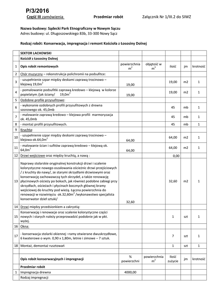 P/3/2016 Część III zamówienia Przedmiar robót Załącznik Nr 1/III.2 do SIWZ Nazwa budowy: Sądecki Park Etnograficzny w Nowym Sączu Adres budowy: ul. Długoszowskiego 83b, 33-300 Nowy Sącz Rodzaj robót: Konserwacja, impregnacja i remont Kościoła z Łososiny Dolnej SEKTOR LACHOWSKI Kościół z Łososiny Dolnej 1 Opis robót remontowych powierzchnia 2 m objętość w 3 m ilość jm krotność 19,00 m2 1 19,00 m2 1 45 mb 1 45 mb 1 45 mb 1 64,00 m2 1 64,00 m2 1 32,60 m2 1 1 szt 1 7 szt 1 1 szt 1 Ilość zużycie jm krotność 2 Chór muzyczny – rekonstrukcja polichromii na podsufitce: 3 - uzupełnienie szpar między deskami zaprawą trocinowo – 2 klejową 19,0m 19,00 4 - pomalowanie podsufitki zaprawą kredowo – klejową w kolorze 2 popielatym /jak ściany/ 19,0m 19,00 5 Ozdobne profile przysufitowe: - wykonanie ozdobnych profili przysufitowych z drewna 6 sosnowego ok. 45,0mb - malowanie zaprawą kredowo – klejowa profili marmoryzacja 7 ok. 45,0mb 8 - montaż profili przysufitowych. 9 Kruchta: 10 - uzupełnienie szpar między deskami zaprawą trocinowo – 2 klejowa ok.64,0m 64,00 11 - malowanie ścian i sufitów zaprawą kredowo – klejową ok. 2 64,0m 64,00 12 Drzwi wejściowe oraz między kruchtą, a nawą : Naprawy stolarskie oryginalnej konstrukcji drzwi i scalenie kolorystyczne nowego oszalowania ościeżnic drzwi przejściowych / z kruchty do nawy/, ze starymi skrzydłami drzwiowymi oraz konserwację zachowawczą tych skrzydeł, a także renowację 13 płycinowych ościeży po bokach, jak również podobne zabiegi przy skrzydłach, ościeżach i płycinach bocznych głównej bramy wejściowej do kruchty pod wieżą. Łączna powierzchnia do 2 renowacji w rozwinięciu ok.32,60m /wykonawstwo specjalista konserwator dzieł sztuki/ 0,00 32,60 14 Drzwi między przedsionkiem a zakrystią: Konserwację i renowacje oraz scalenie kolorystyczne części 15 nowych i starych należy przeprowadzić podobnie jak w pkt. wyżej. 16 Okna: 17 - konserwacja stolarki okiennej –ramy otwierane dwuskrzydłowe, 6 kwaterowe o wym. 0,90 x 1,80m, letnie i zimowe – 7 sztuk. 18 Montaż, demontaż rusztowań Opis robót konserwacyjnych i impregnacji Przedmiar robót 1 Impregnacja drewna Rodzaj impregnacji % powierzchni 4000,00 powierzchnia 2 m P/3/2016 Część III zamówienia Przedmiar robót Dezynfekcja chemiczna metodą opryskania miejsc 1 zaatakowanych przez glony, mchy i porosty środkiem do dezynfekcji Dezynfekcja chemiczna metodą opryskania miejsc 2 zaatakowanych przez grzyby środkiem do dezynfekcji grzybów i pleśni Dezynfekcja chemiczna metodą opryskania miejsc 3 zaatakowanych przez grzyby środkiem do dezynfekcji grzybów i pleśni Załącznik Nr 1/III.2 do SIWZ 40 1 600,00 200 ml/ m2 1 5 200,00 150 ml/ m2 1 5 200,00 50 g/m 2 1 ml/ m2 1 4 Dezynsekcja ścian z czynnymi żerowiskami owadów metodą malowania lub oprysku 100 4 000,00 325 5 Dezynsekcja metodą iniekcyjną miejsc o szczególnym nasileniu czynnych żerowisk 50 2 000,00 325 3 120,00 0,025 5 200,00 0,1 Zabezpieczenie miejsc trudno dostępnych połączeń ciesielskich 8 pod poszyciem dachowym, po jego odkryciu, przez zastosowanie środka w postaci sprasowanych soli na bazie boru 5 200,00 4 kg/m 3 1 Impregnacja biologiczna drewna środkiem penetrującym wewnątrz i na zewnątrz, wykazującym zdolność do migrowania i utrwalania się w drewnie, tworzącym warstwę hydrofobową 9 przepuszczalną dla gazów-pary wodnej, nie zmieniającym kolorystyki drewna, matowym, nie agresywnym w stosunku do metali, na zewnątrz niewymywalnym 100 4 000,00 125 ml/ m2 1 Impregnacja biologiczna drewna środkiem penetrującym wewnątrz i na zewnątrz, wykazującym zdolność do migrowania i utrwalania się w drewnie, tworzącym warstwę hydrofobową 10 przepuszczalną dla gazów-pary wodnej, nie zmieniającym kolorystyki drewna, matowym, nie agresywnym w stosunku do metali, na zewnątrz niewymywalnym 100 4 000,00 125 ml/ m2 1 Zabezpieczenie przeciwpożarowe, metodą malowania, 11 polegające na doprowadzeniu drewna do stopnia trudnozapalności wg klasy C-S2-d0 100 4 000,00 300 ml/ m2 1 6 Flekowanie zniszczonych fragmentów drewna 7 Wymiana pojedynczych elementów ze względów konstrukcyjnych ml/ m2 m3/ m2 m3/ m2 1 1 1