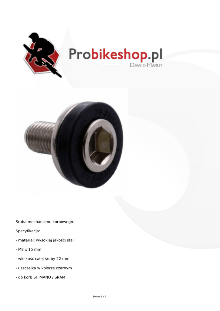Śruba mechanizmu korbowego. Specyfikacja: - materiał: wysokiej jakości stal - M8 x 15 mm - wielkość całej śruby 22 mm - uszczelka w kolorze czarnym - do korb SHIMANO / SRAM Strona 1 z 2 Strona 2 z 2