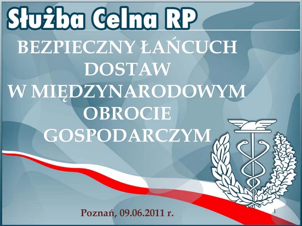 BEZPIECZNY ŁAŃCUCH DOSTAW W MIĘDZYNARODOWYM OBROCIE GOSPODARCZYM Poznań, 09.06.2011 r. 1 Międzynarodowy łańcuch dostaw BEZPIECZEŃSTWO OBROTU TOWAROWEGO DARIUSZ LEŚNIEWSKI, 29 MAJA 2010 r. 3 4 AUTHORISED ECONOMIC OPERATORS UPOWAŻNIONY PRZEDSIĘBIORCA 5 6 RODZAJE STATUSU AEO AEOS AEOC BEZPIECZEŃSTWO I OCHRONA UPROSZCZENIA CELNE BEZPIECZEŃSTWO I OCHRONA + AEOF UPROSZCENIA CELNE 7 AEO- KORZYŚCI • uznawany jest we wszystkich krajach UE PRESTIŻ UŁATWIENIA • ułatwienia w zakresie kontroli celnej • ograniczony zakres danych w przywozowej i wywozowej deklaracji skróconej PRZYWILEJE 8 POSTĘPOWANIE AUDYTOWE DOTYCZY: Dotychczaso we przestrzegani e wymogów celnych System rachunkowo ści i logistyczny przedsiębior stwa Wypłacalność finansowa Bezpieczeńst wo i ochrona DZIĘKUJĘ ZA UWAGĘ 10